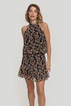 Tejido gasa. Tejido brillo. Diseño estampado. Diseño corto. Cintura elástica. Bajo volantes. Forrado. Talla modelo: S. Altura modelo 1,70 m.