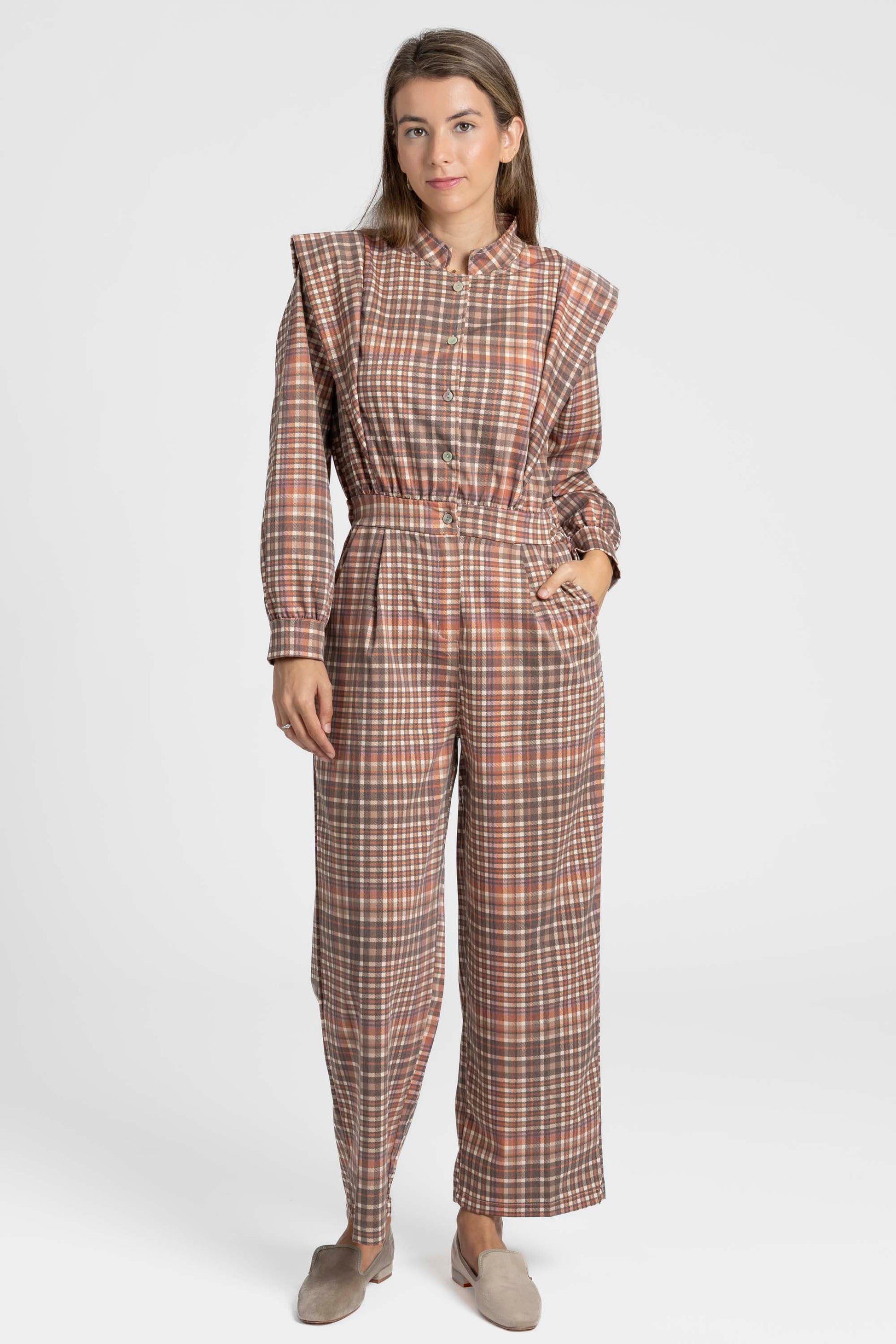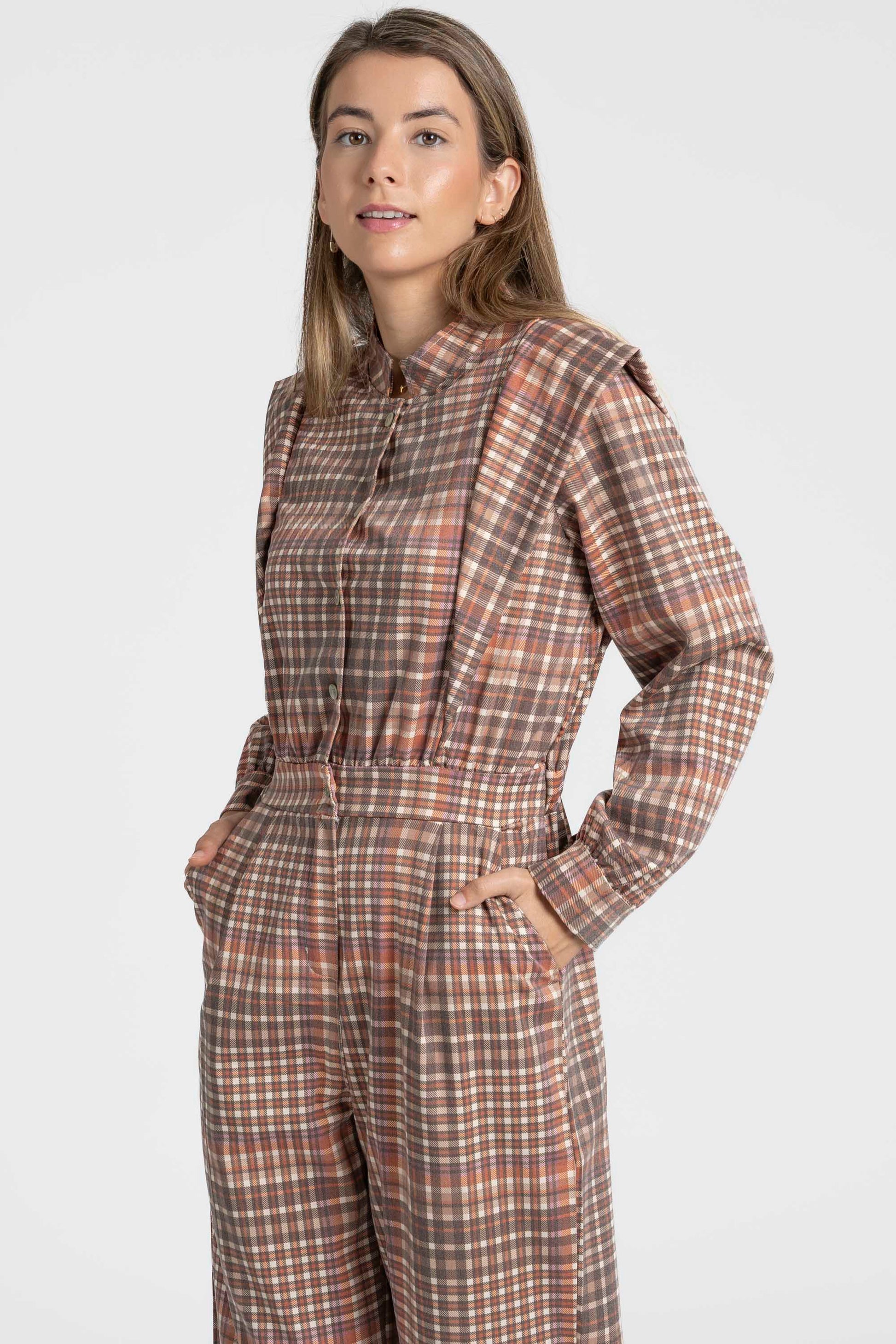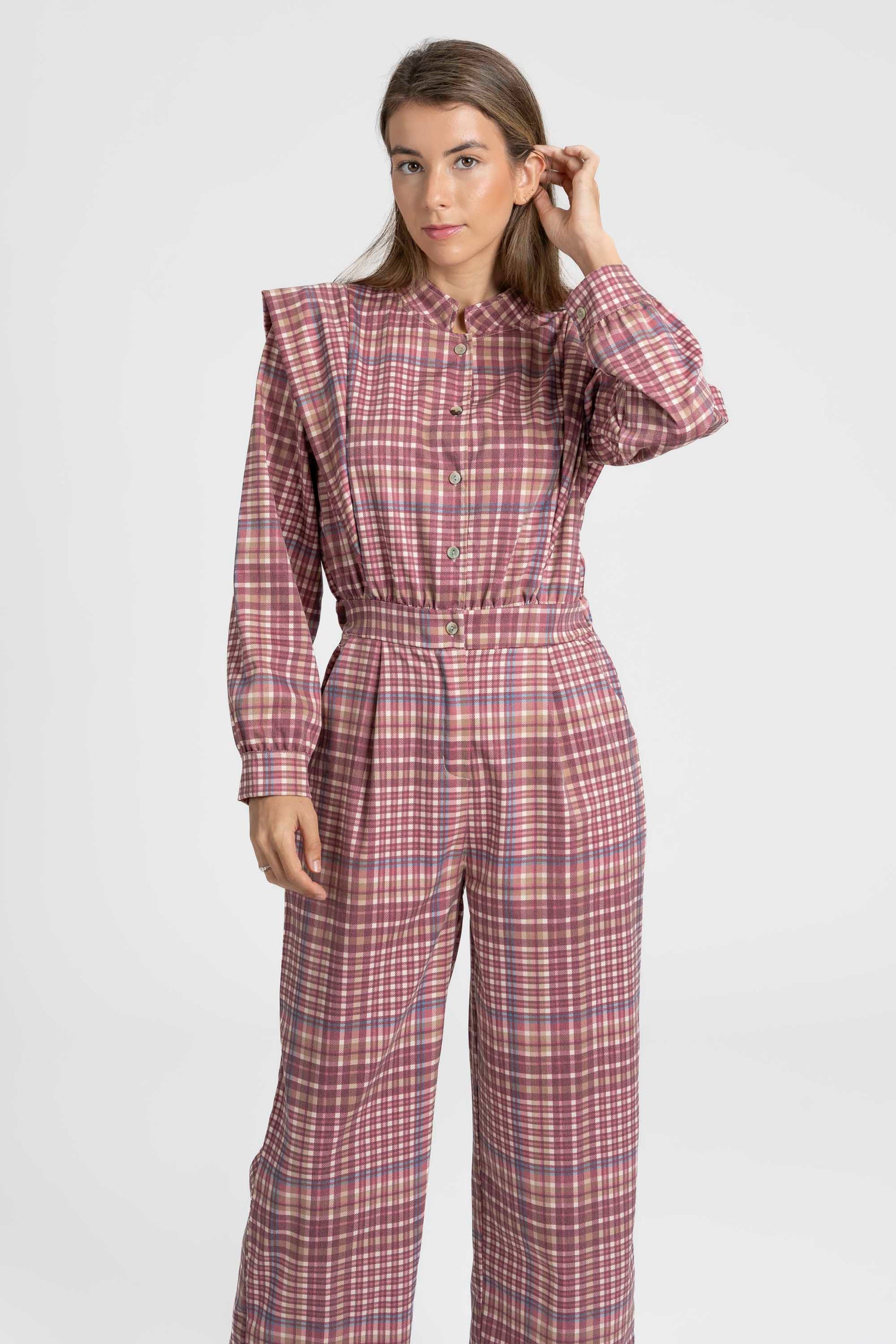 Tejido estampado cuadros. Cuello redondo. Manga larga. Cierre botones. Cintura elástica y cremallera. Pernera recta. Bolsillos laterales.