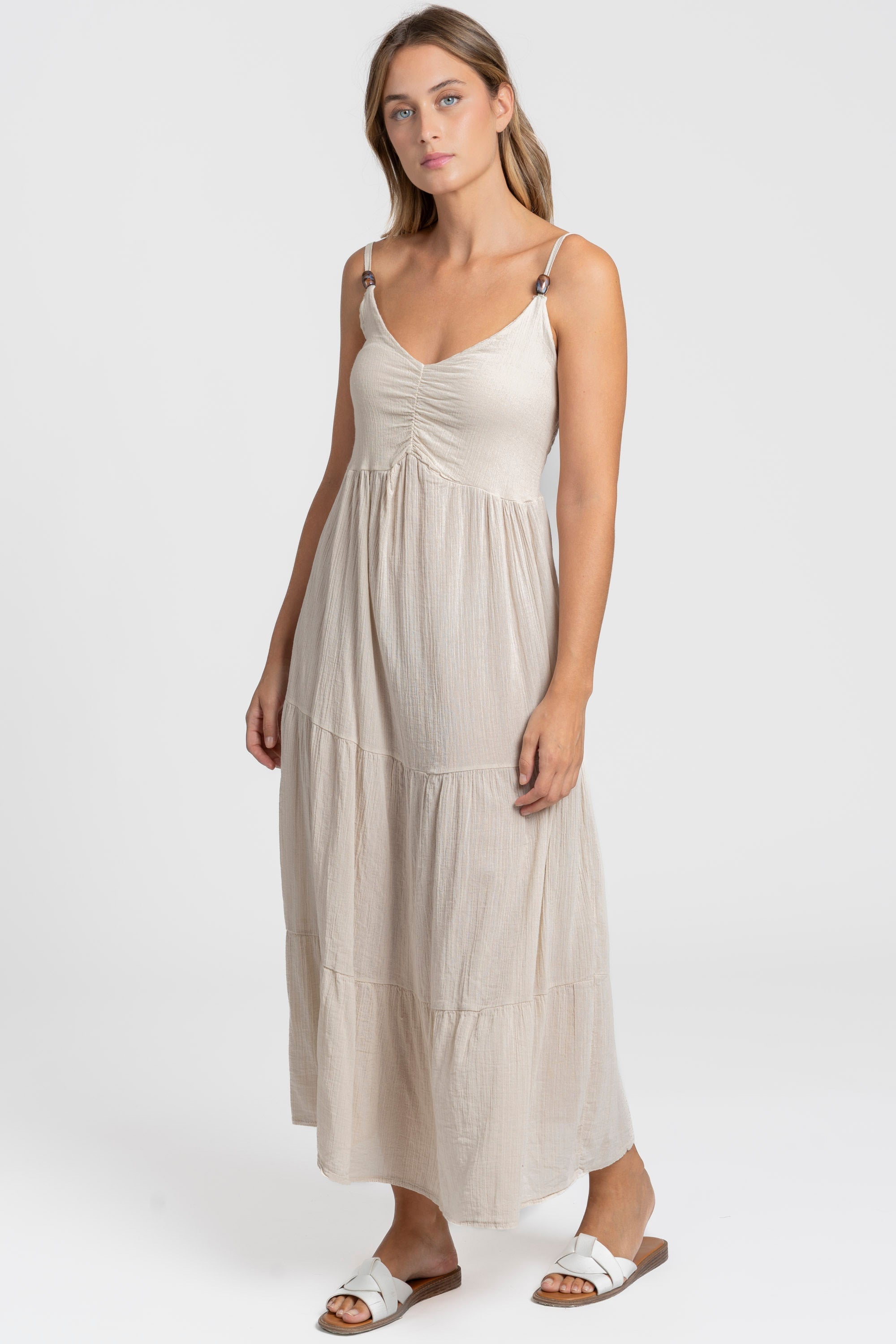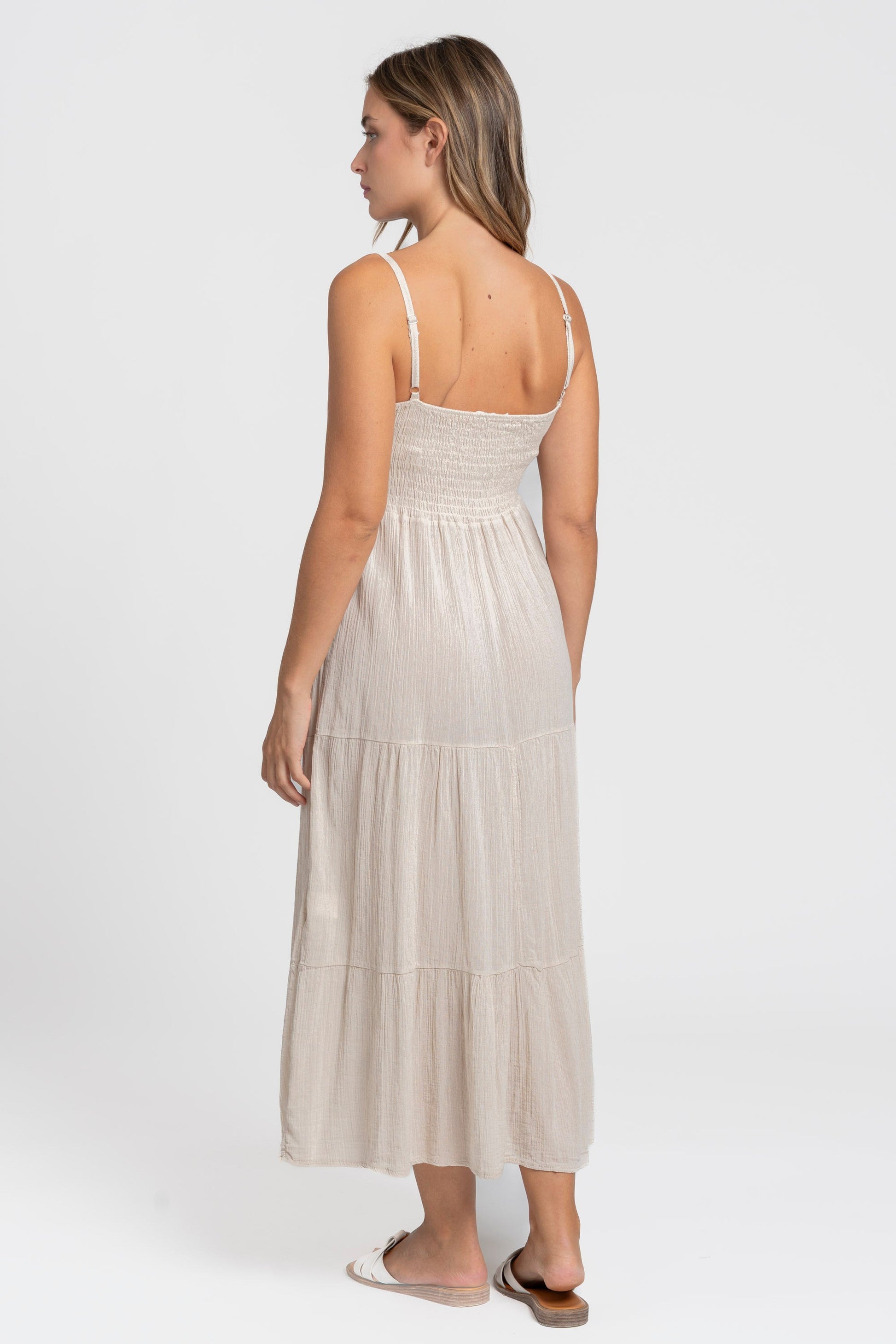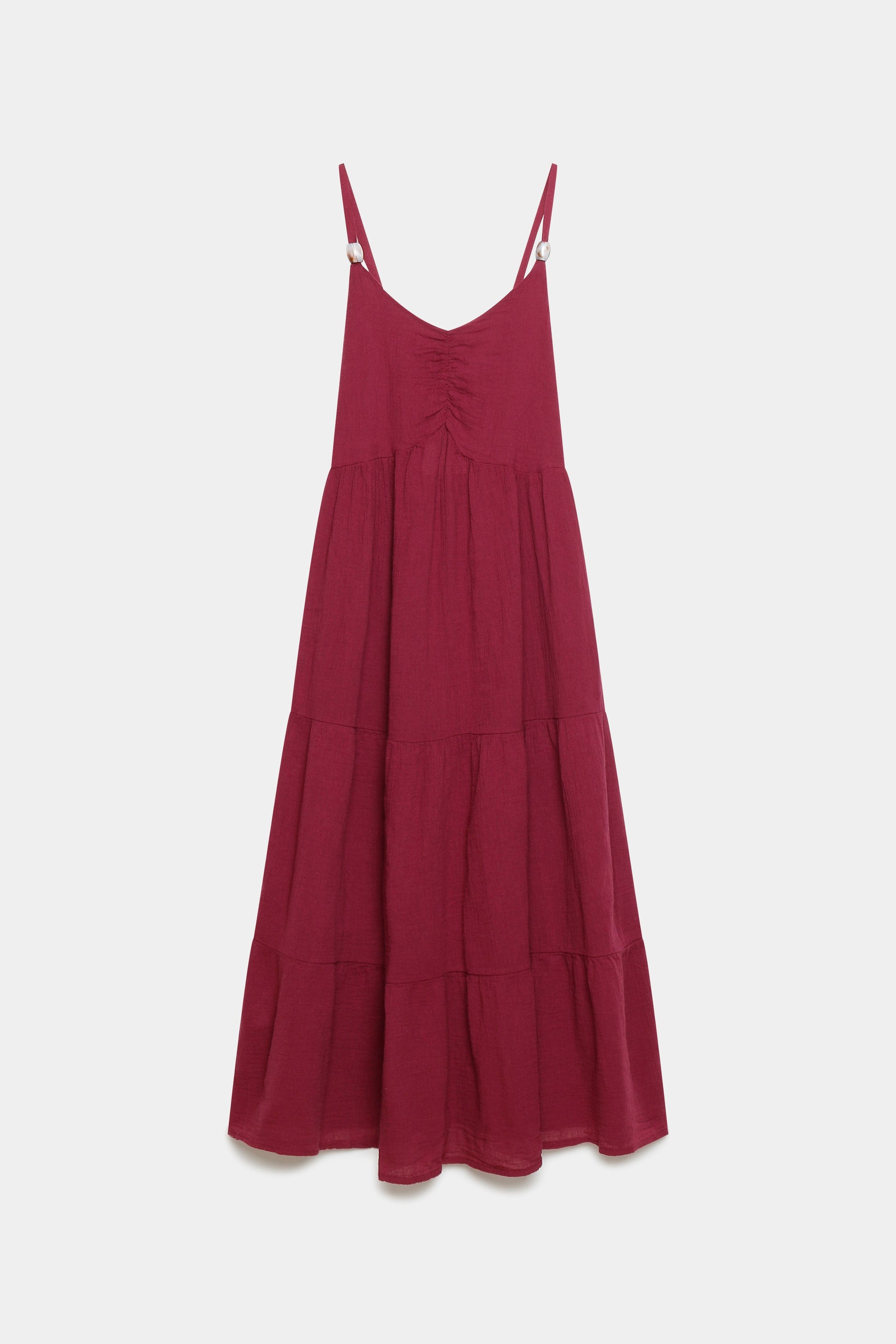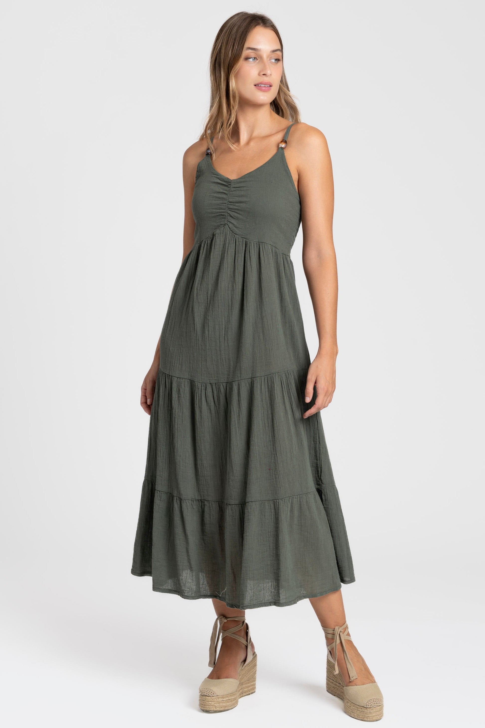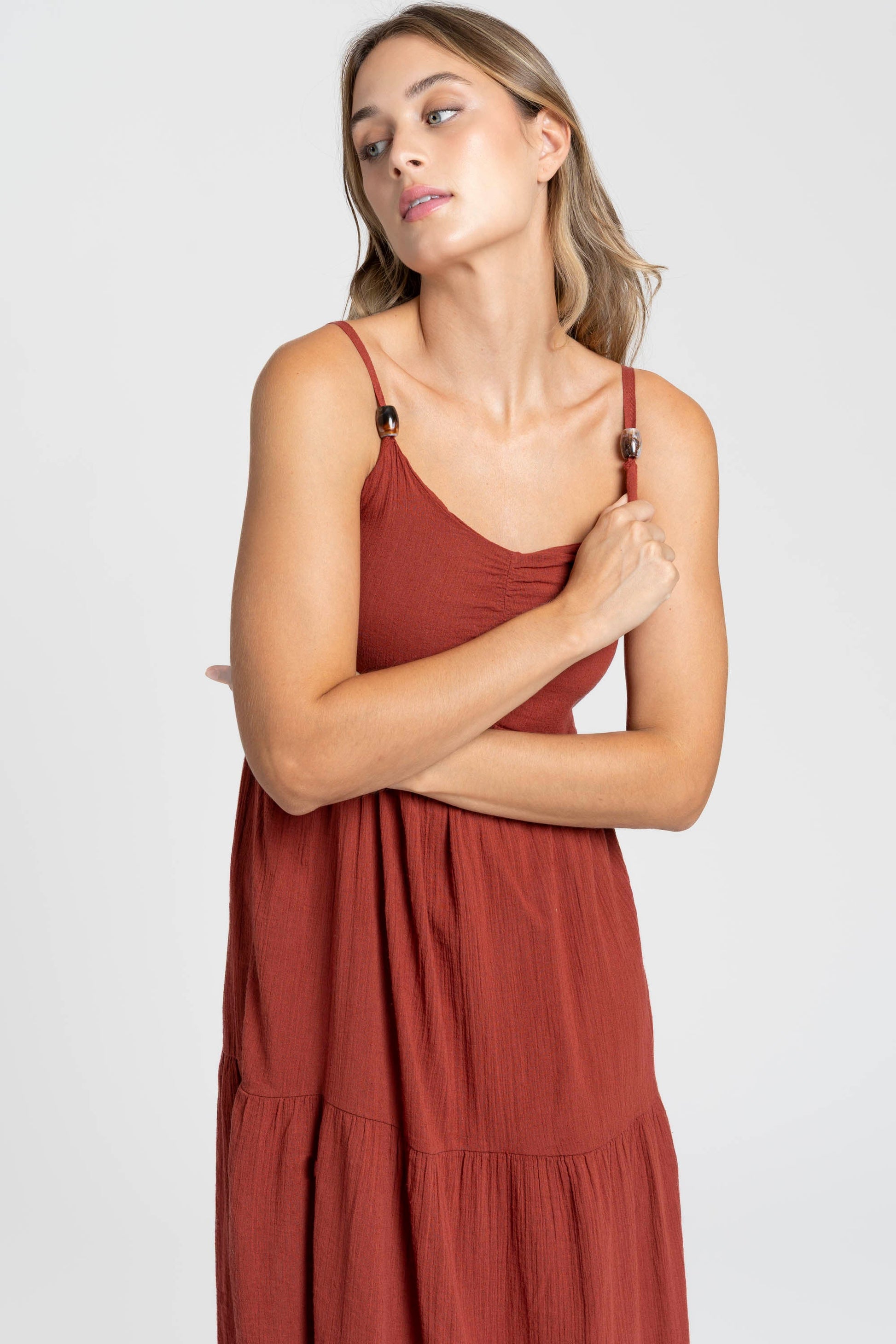 Tejido fluido. Tirantes finos ajustables. Diseño largo.