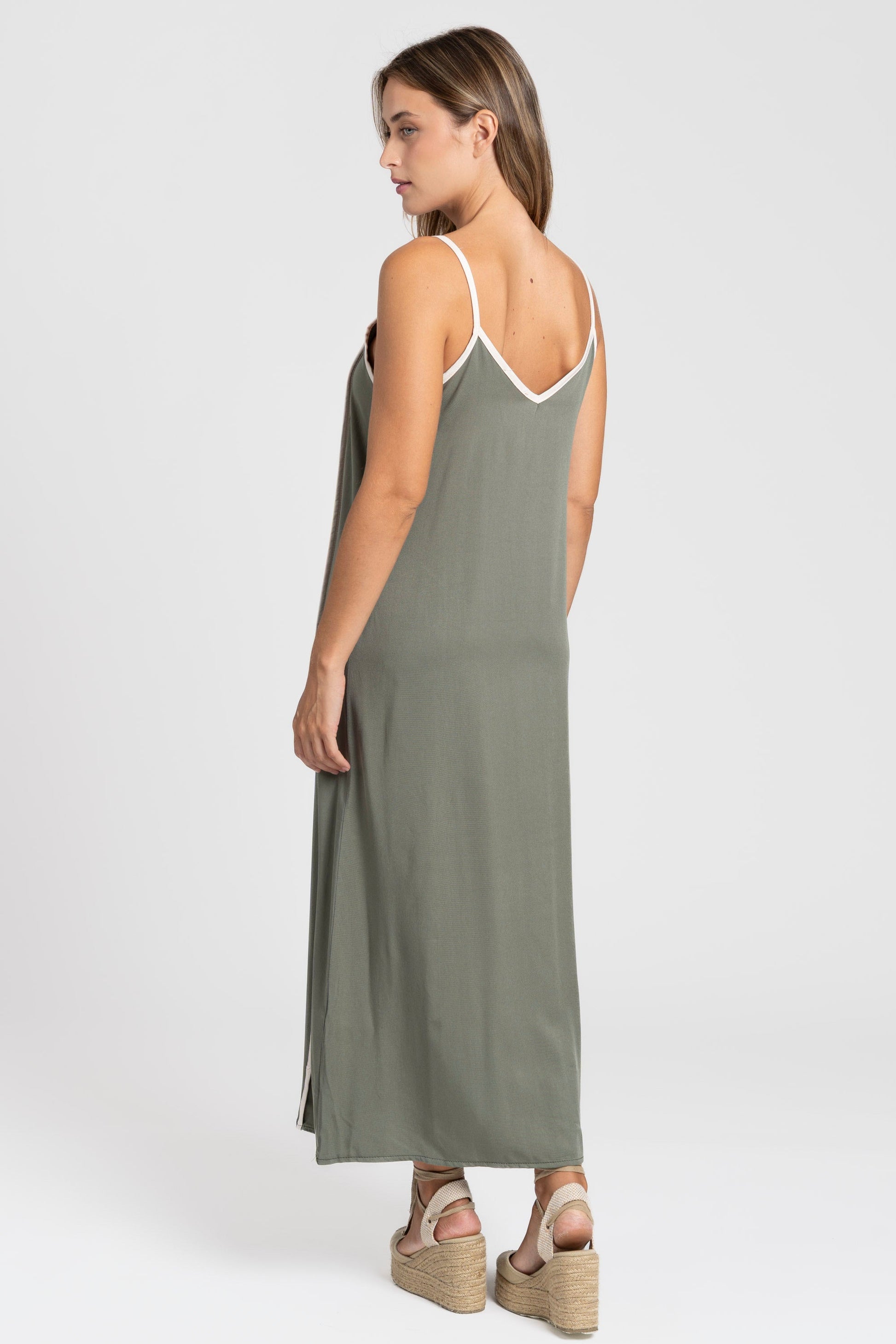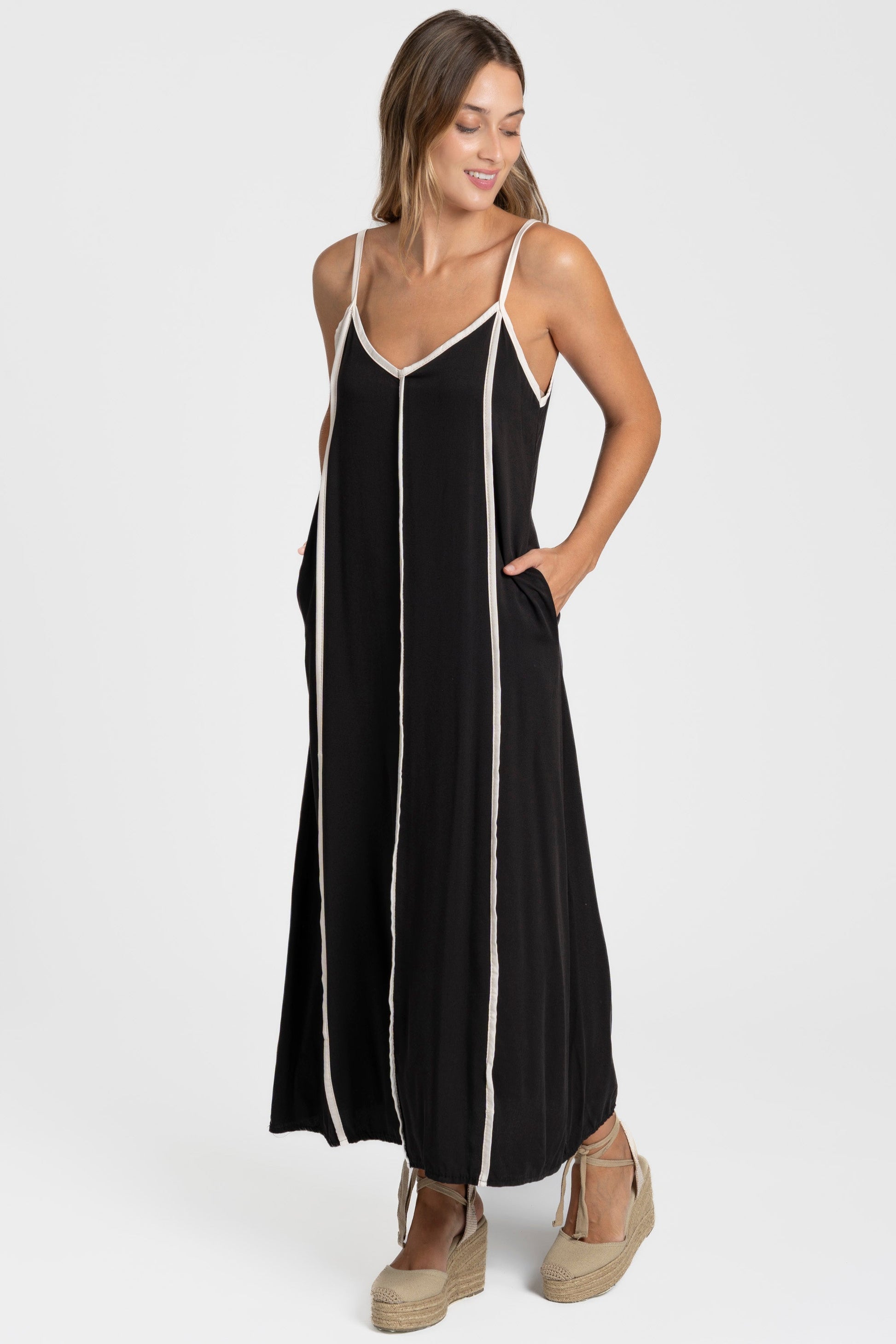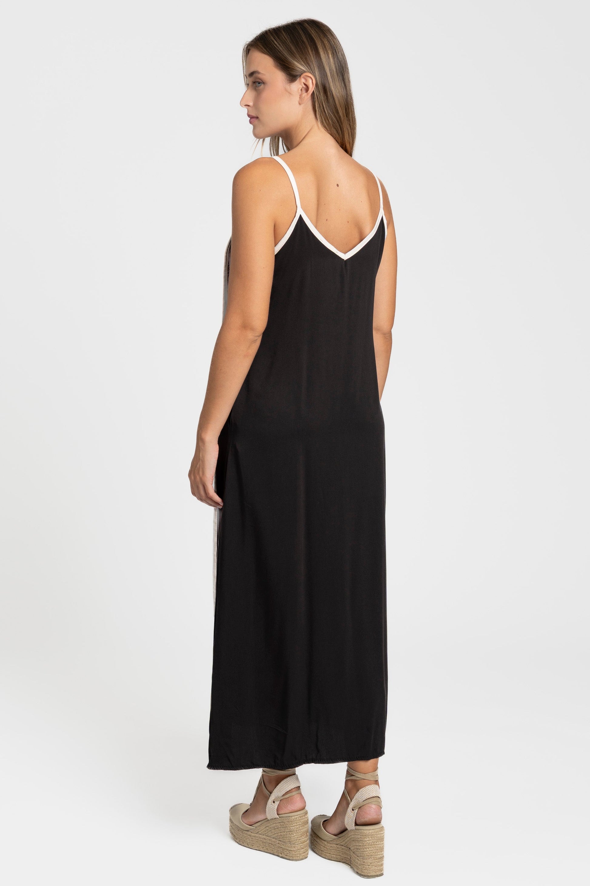 Tejido fluido. Tirantes finos. Detalle rayas. Diseño largo.