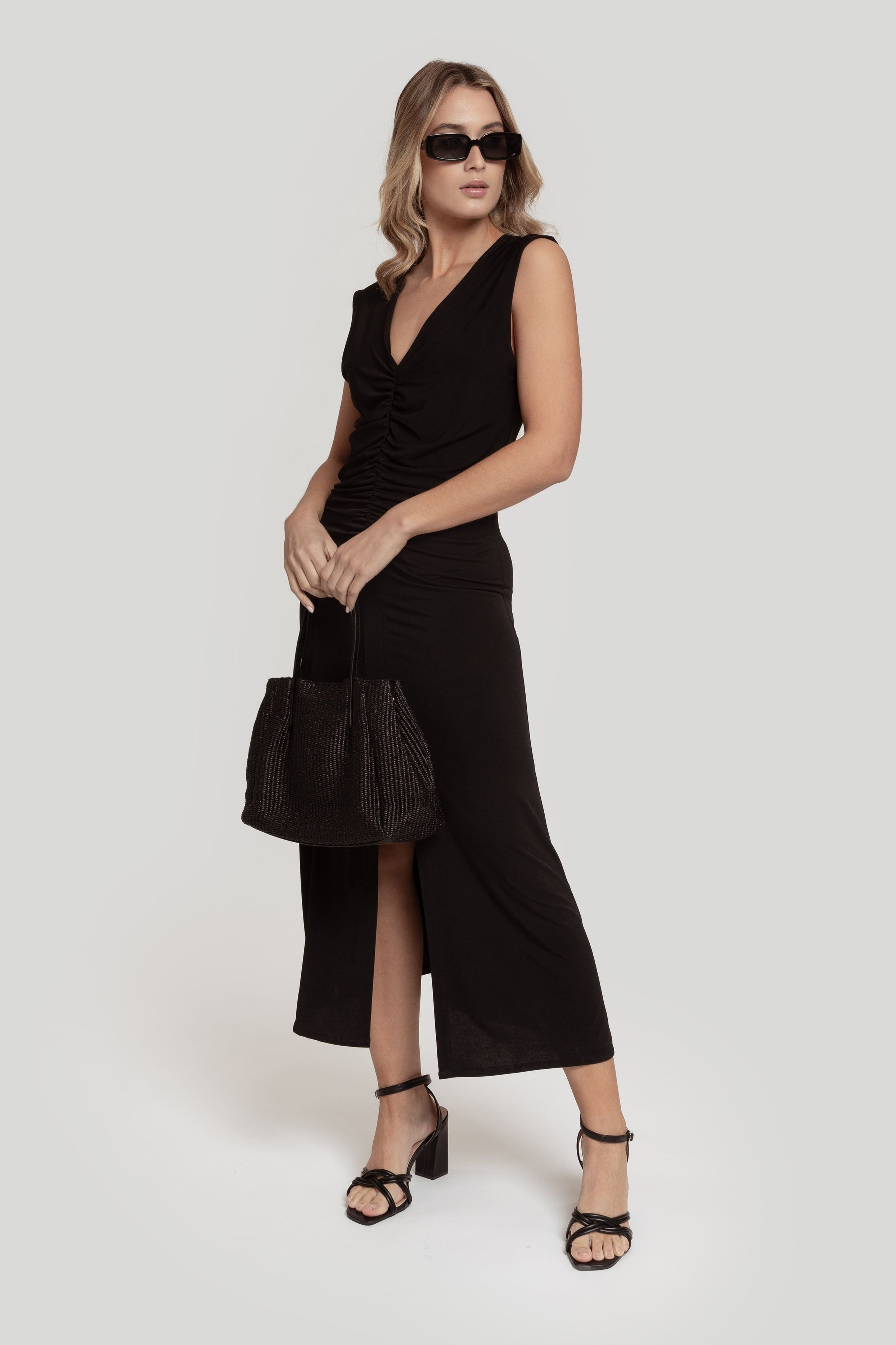 Tejido elástico. Diseño recto. Diseño entallado. Diseño midi. Diseño frunce. Cuello pico. Manga sisa. Cierre de cremallera oculta en la espalda. Talla modelo: S. Altura modelo 1,66 m.