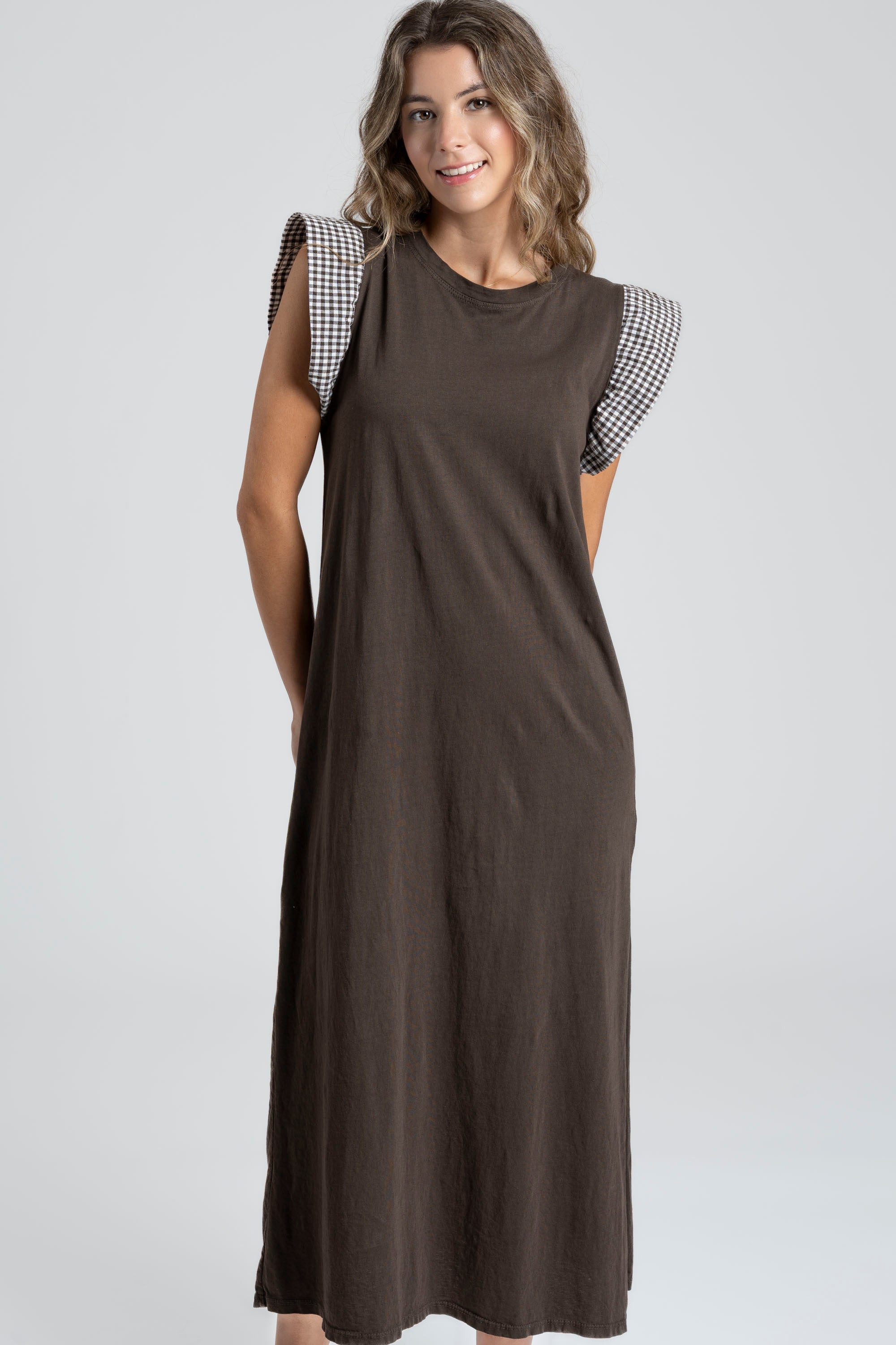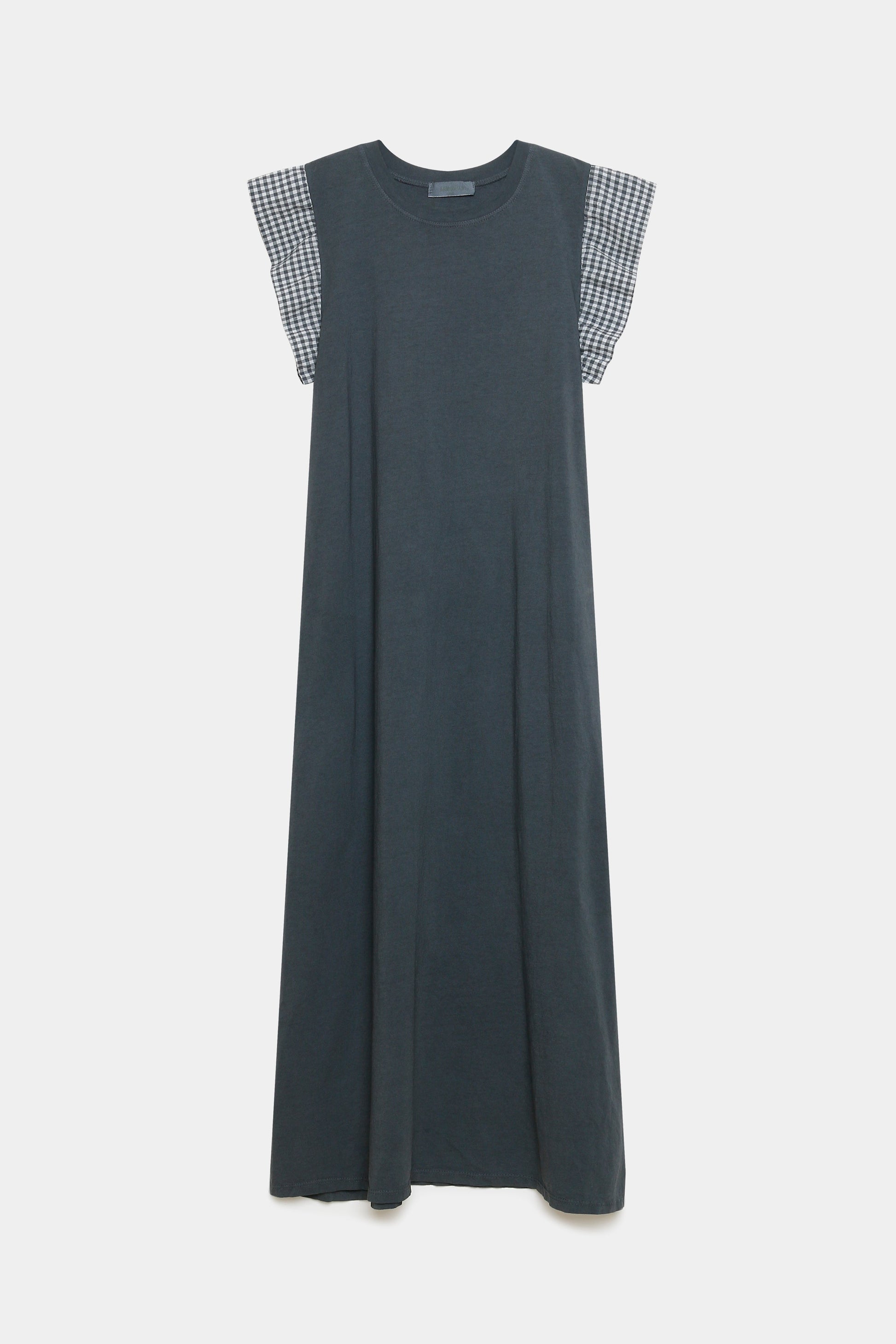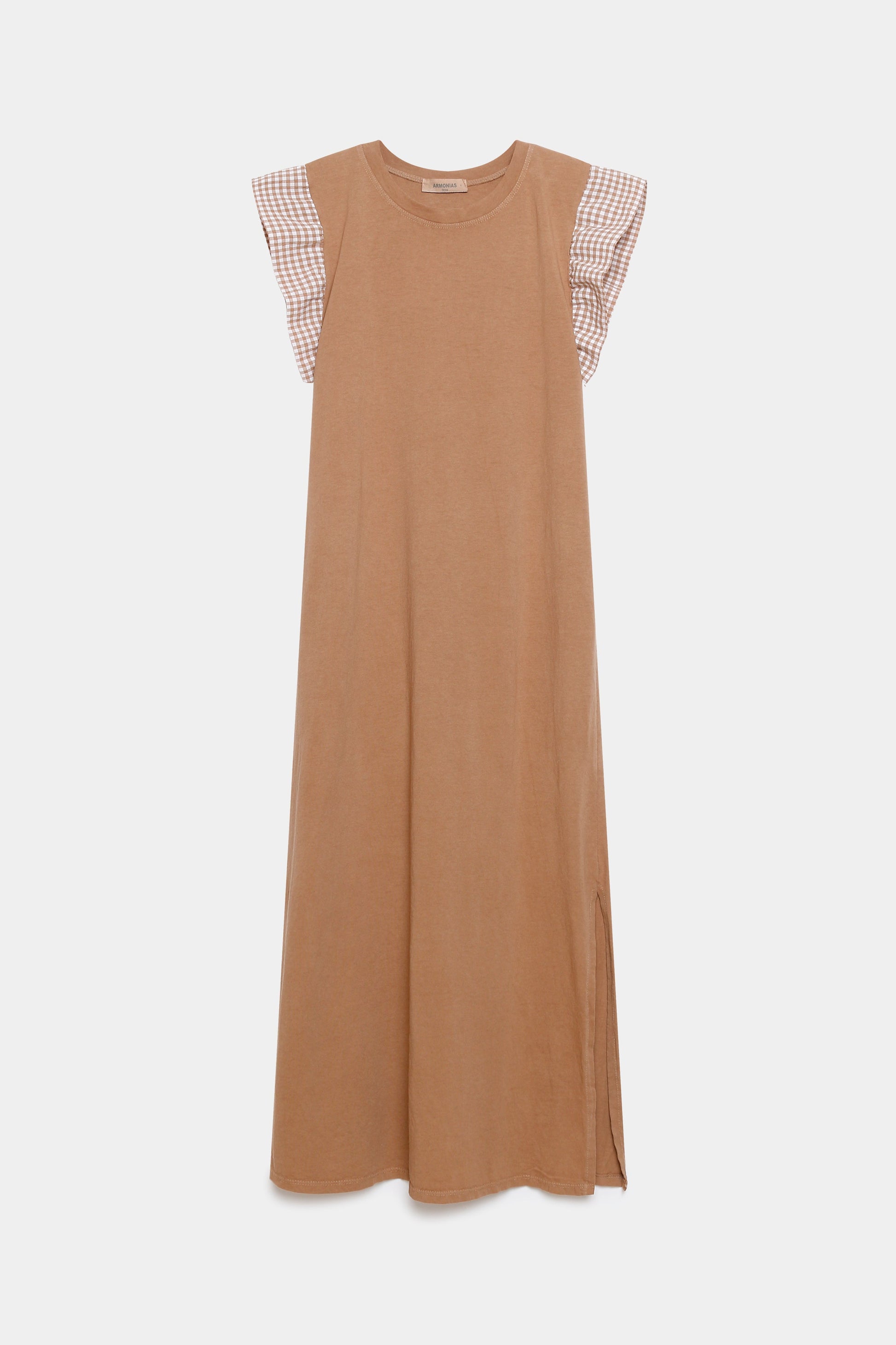 Tejido de algodón. Cuello redondo. Manga sisa. Abertura lateral. Diseño largo.