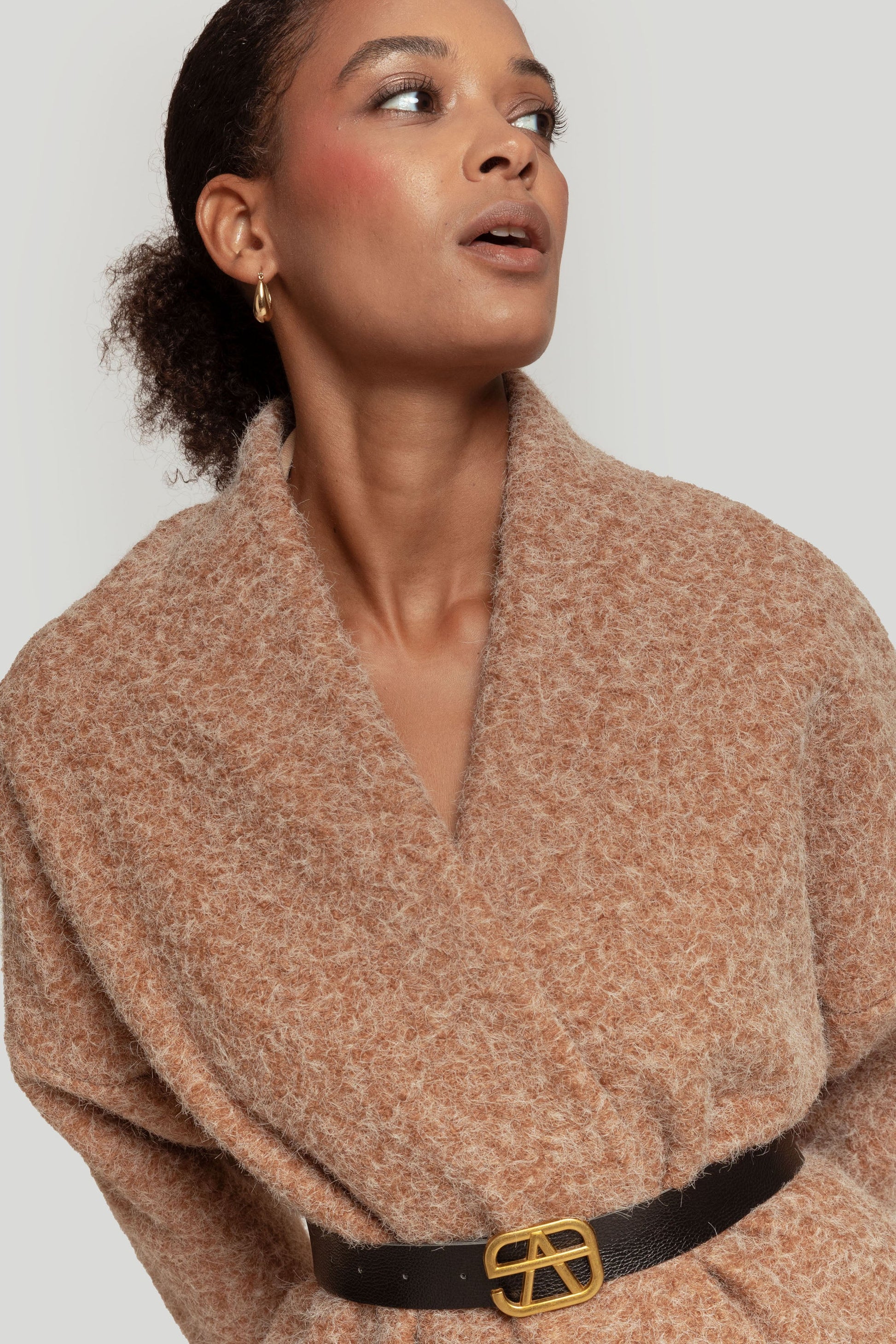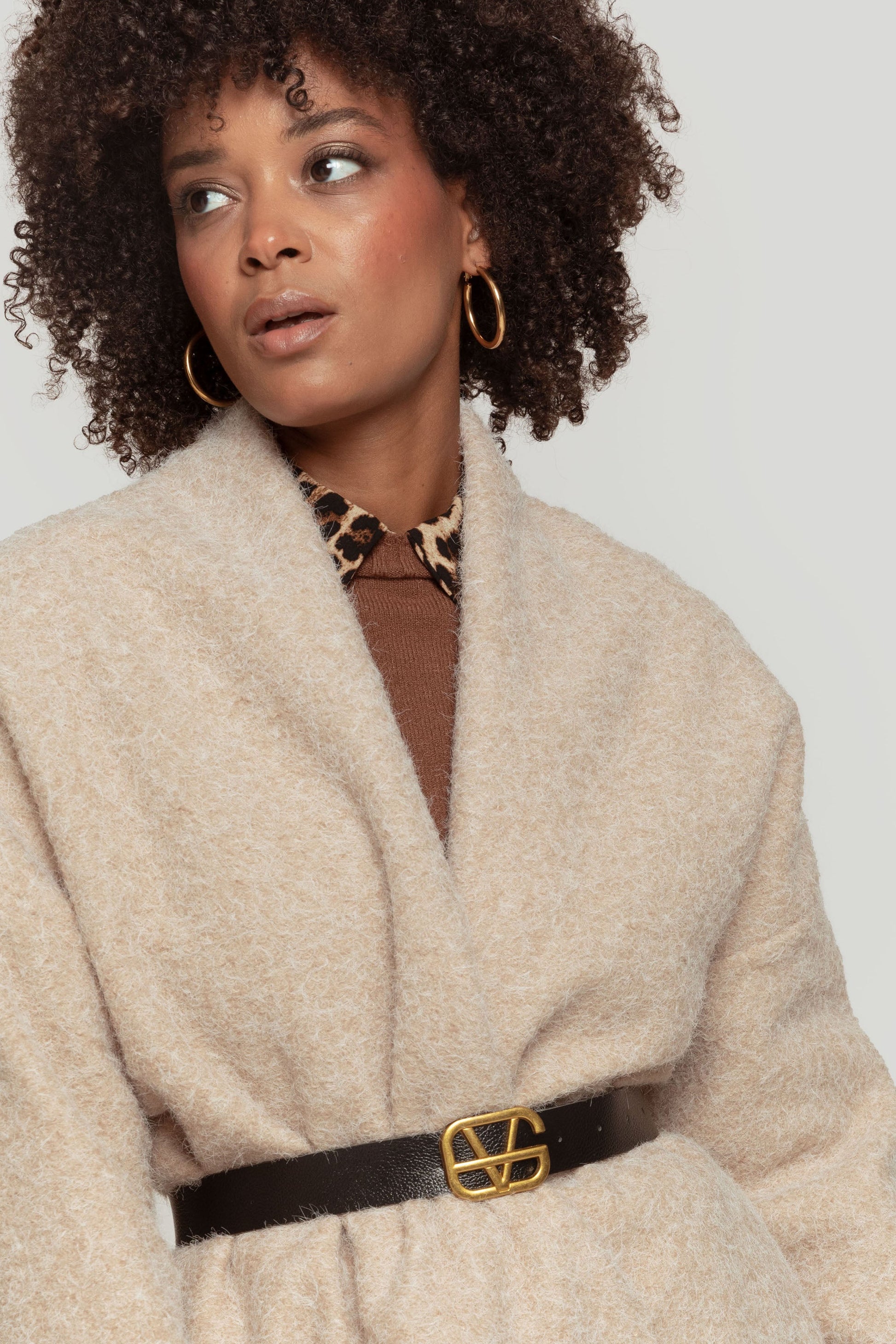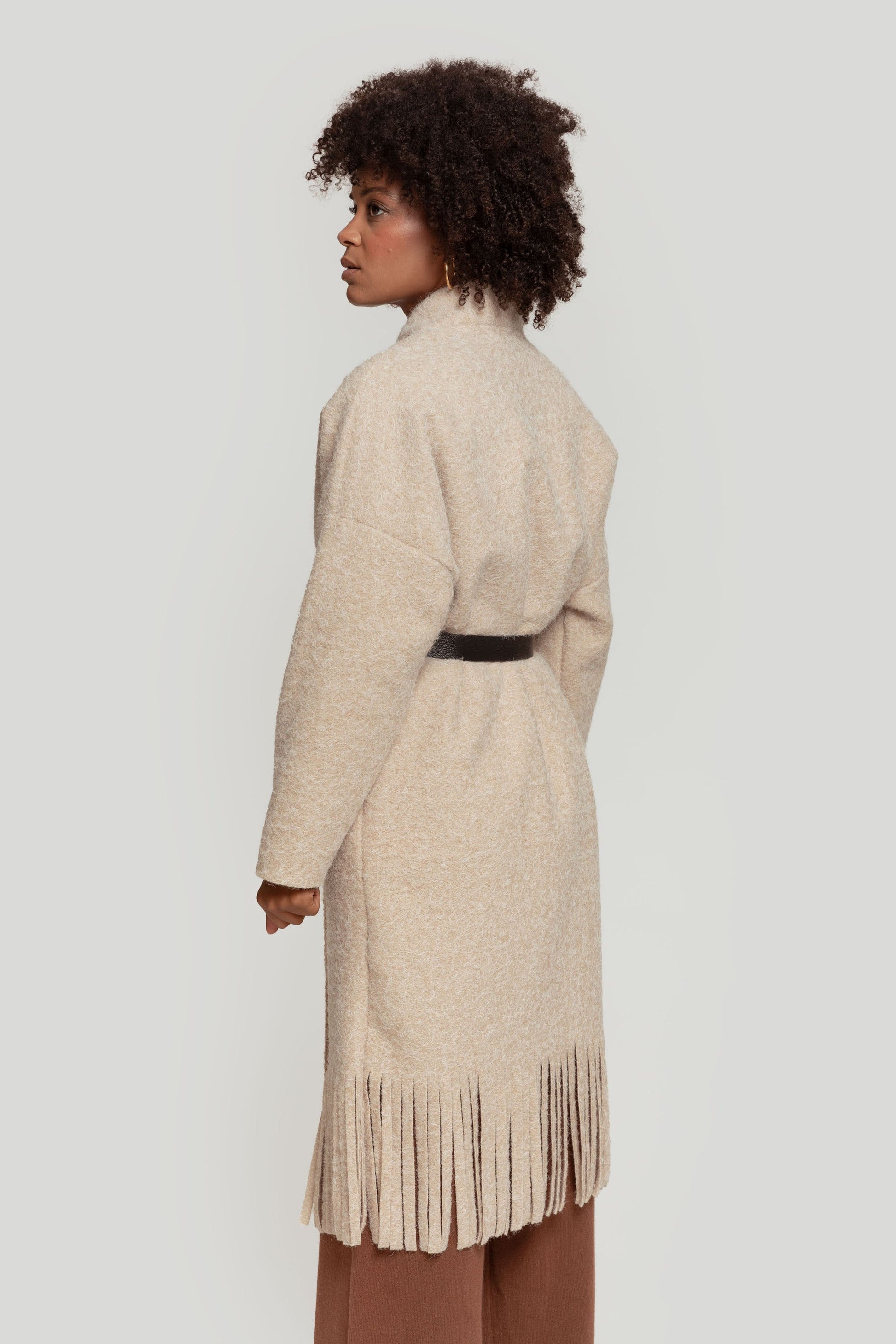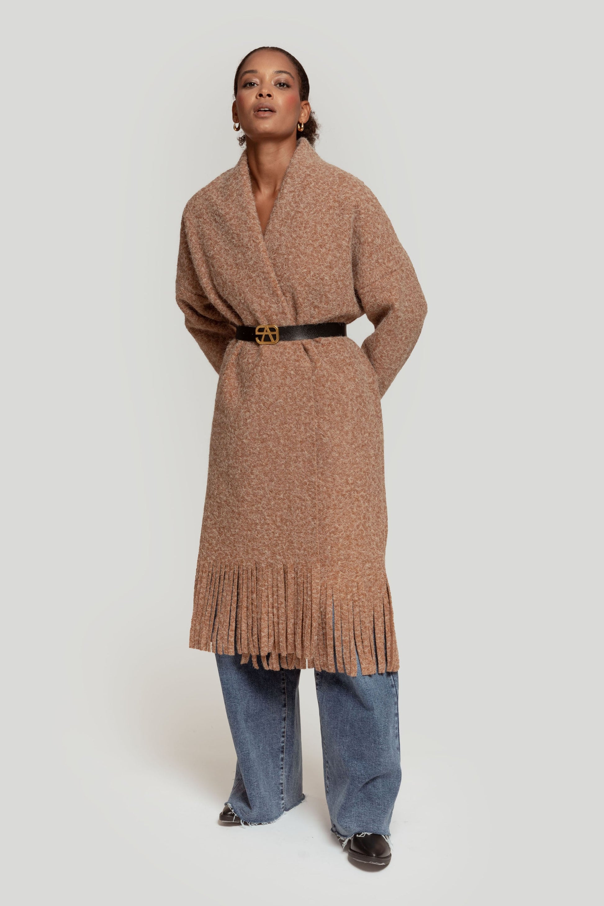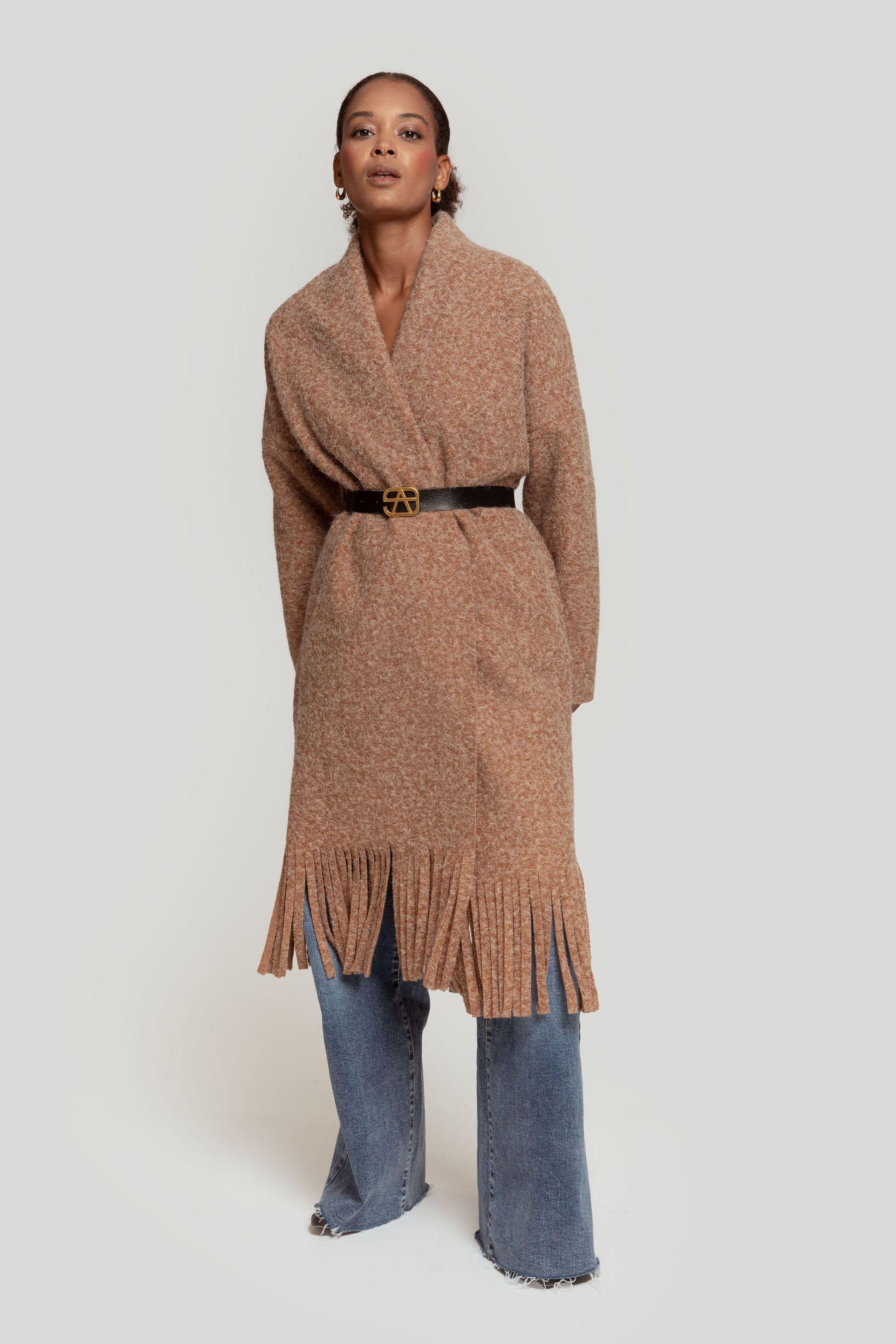 Tejido pelos. Diseño oversize. Diseño largo. Manga larga. Hombros caídos. Sin cierre. Bajo flecos. No forrado. Con cinturón. Talla modelo: S. Altura modelo: 1,66 m.