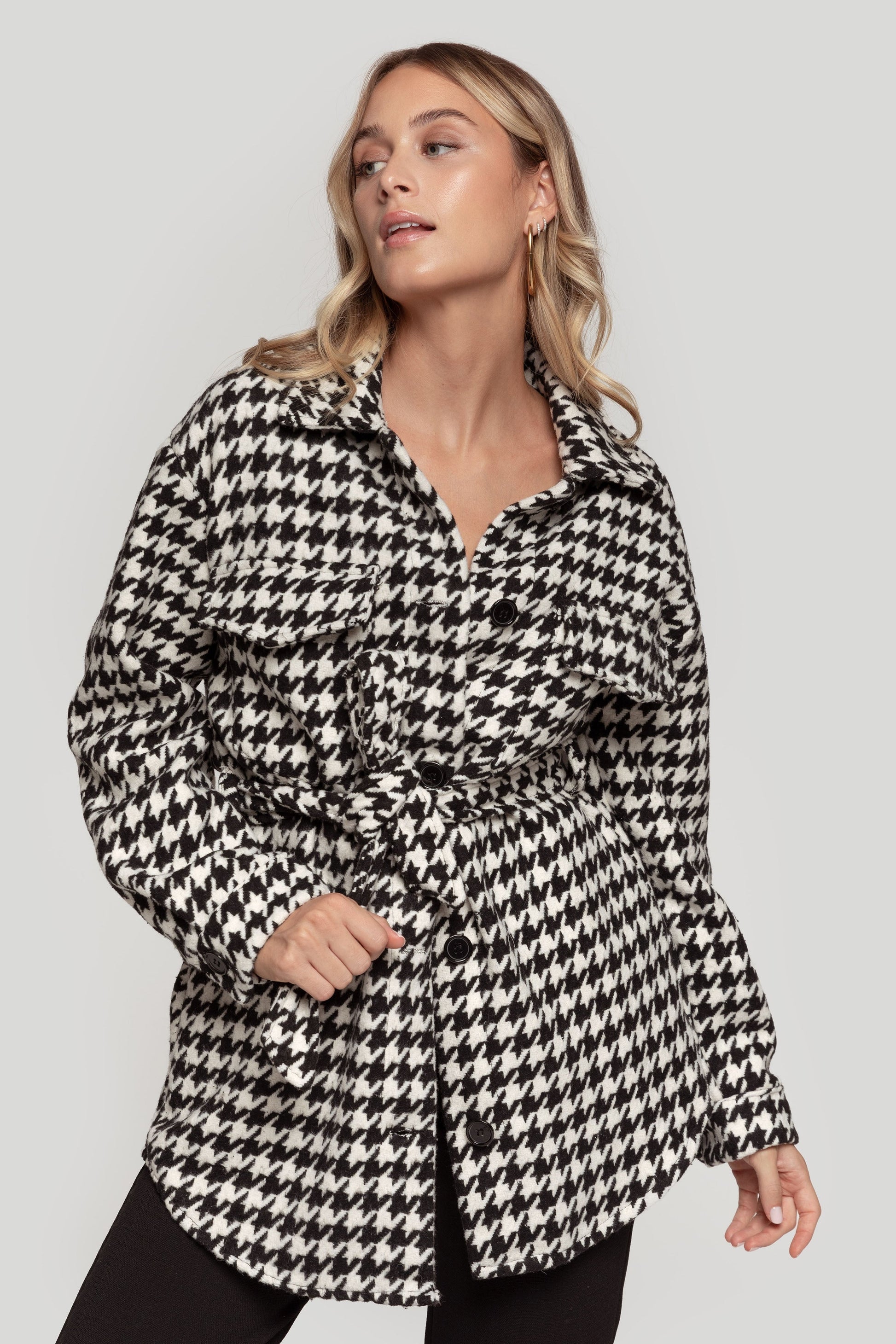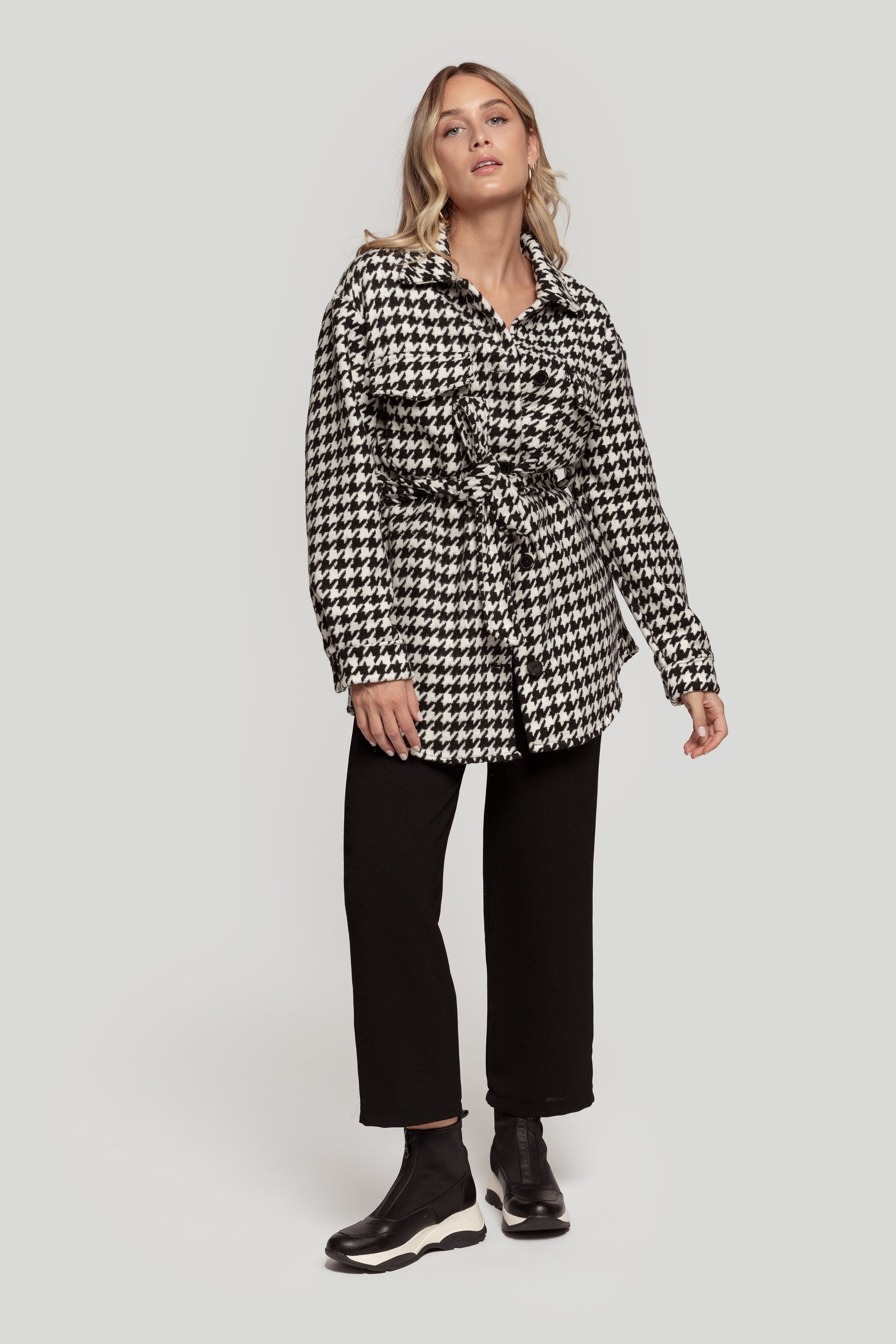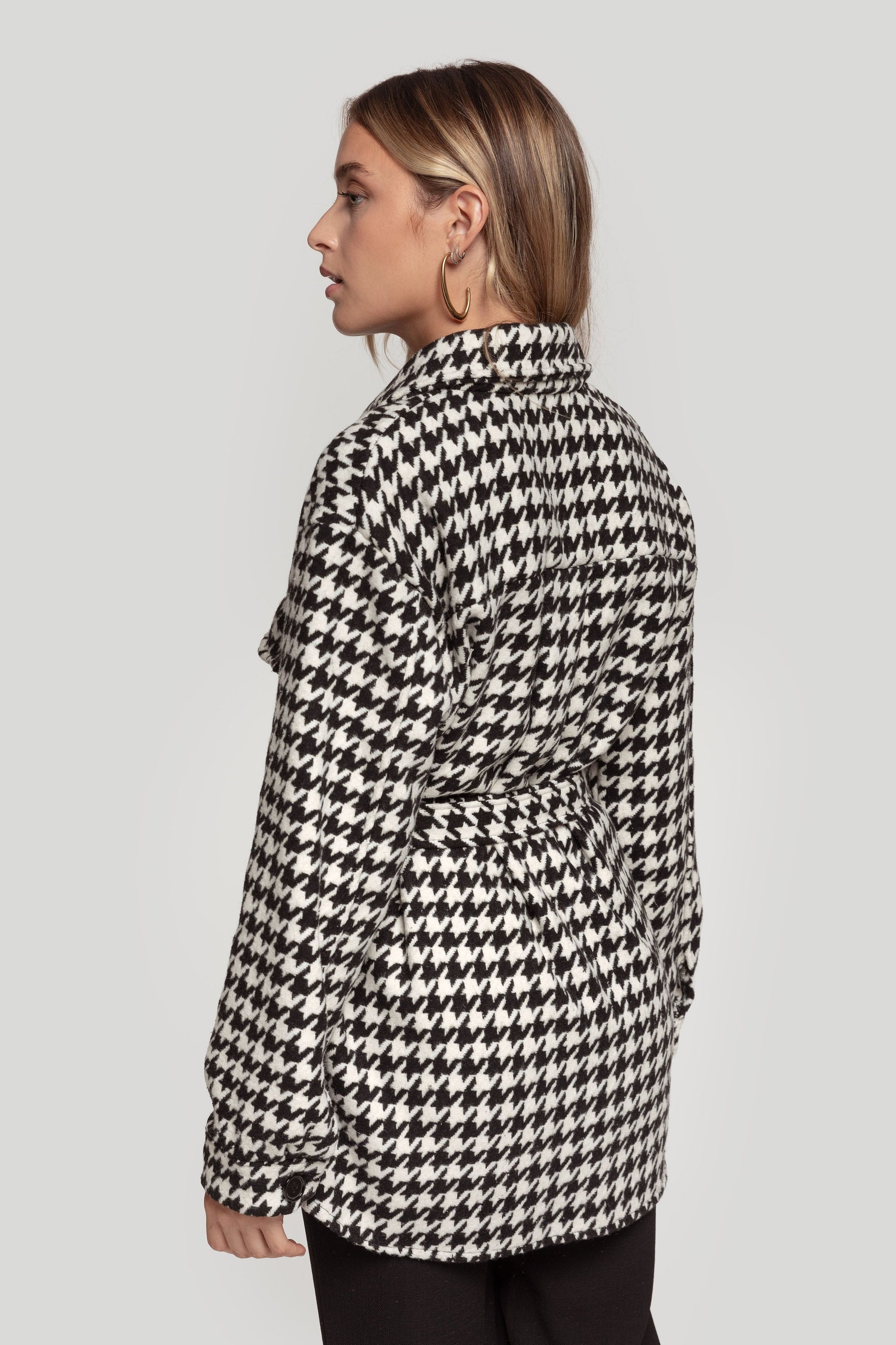 Tejido abrigado. Diseño estampado. Diseño recto. Diseño cruzado. Cuello de solapa. Manga larga. Bolsillos. Cierre de botones. Cinturón a contraste. No forrado. Talla modelo: S. Altura modelo 1,66 m.