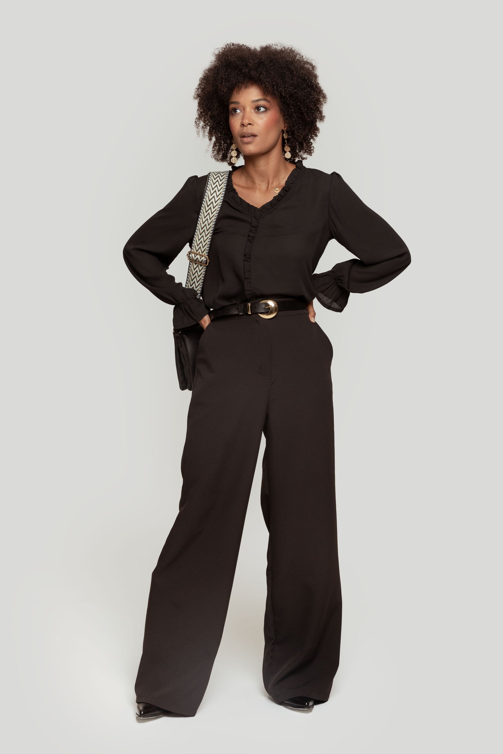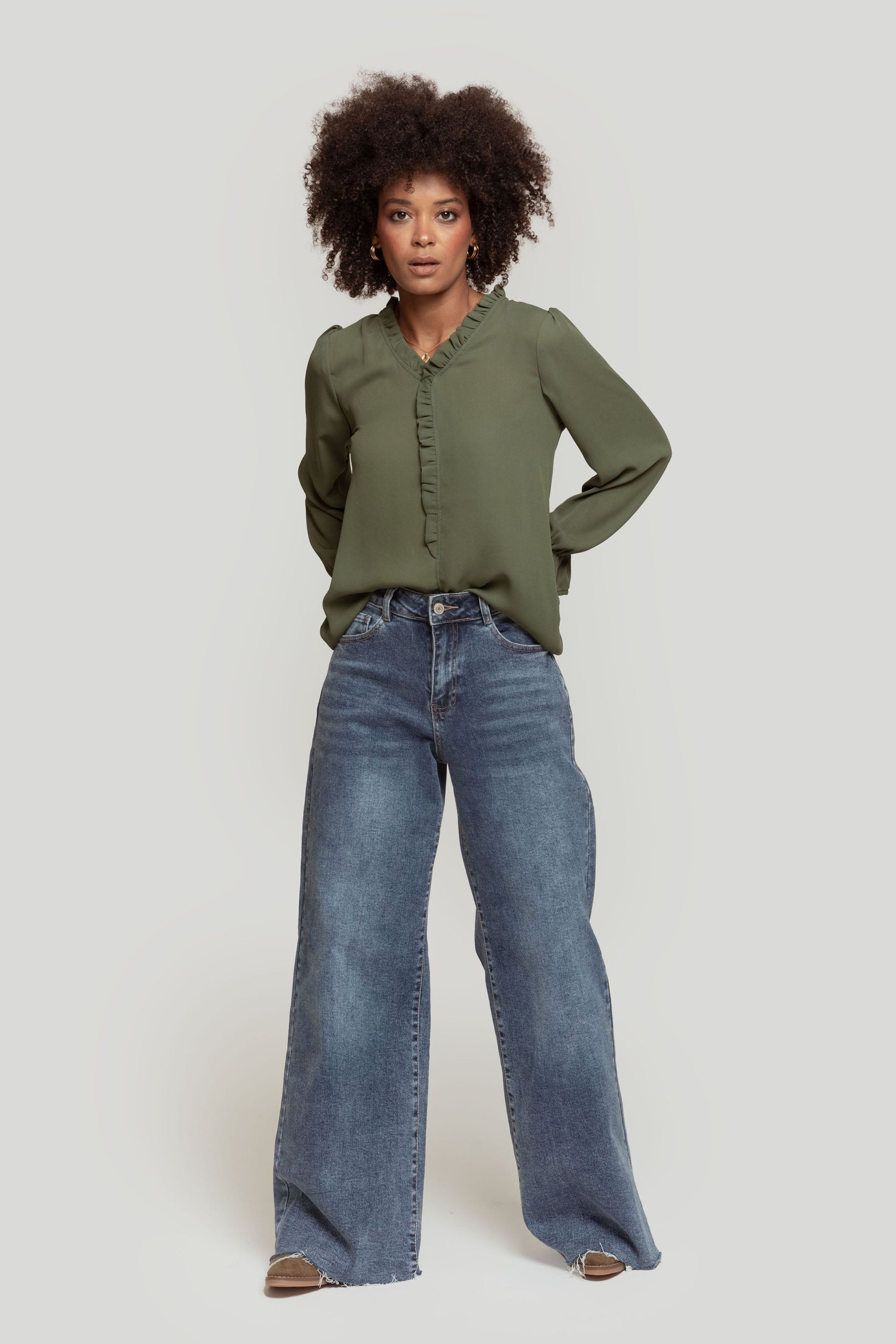 Tejido de gasa. Diseño recto. Cuello pico. Manga larga. Puños acampanados. Detalle frontal de volante. Talla modelo: S. Altura modelo: 1.66 m.