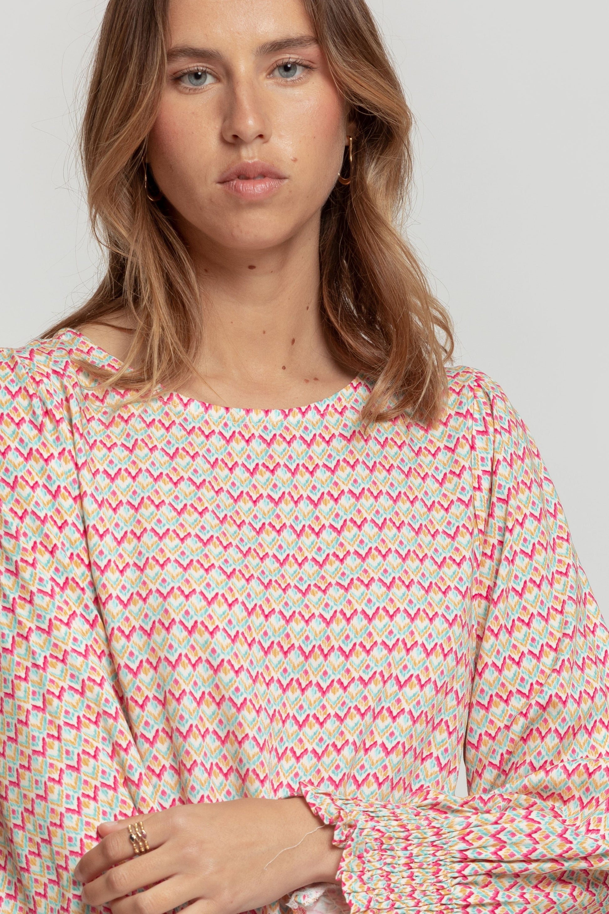 Vestido largo. Tejido fluido. Tejido estampado geométrico. Diseño recto. Cuello redondo. Manga larga. Puño elástico. Abotonado en la nuca.Talla modelo: S. Altura modelo 1, 70 m.