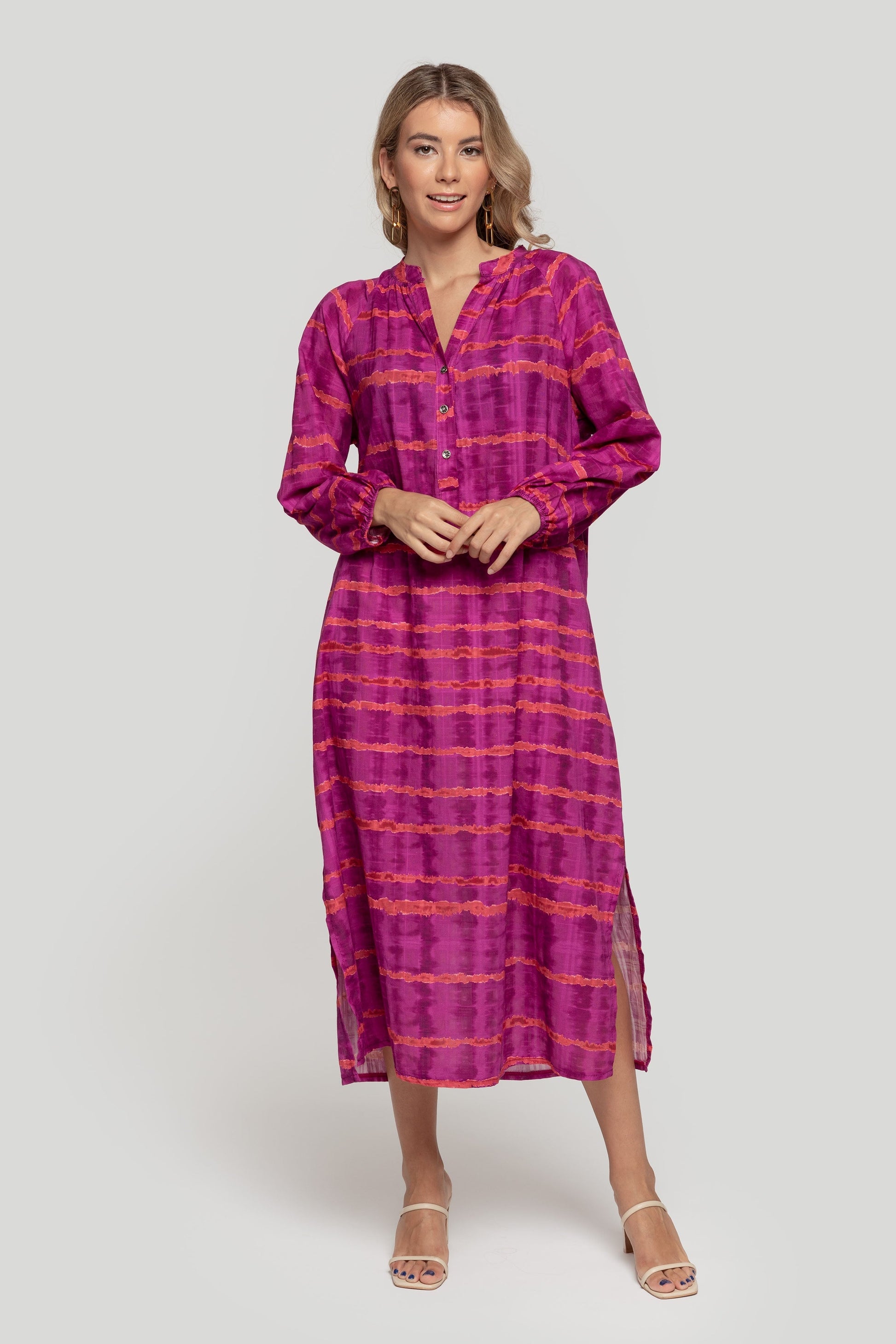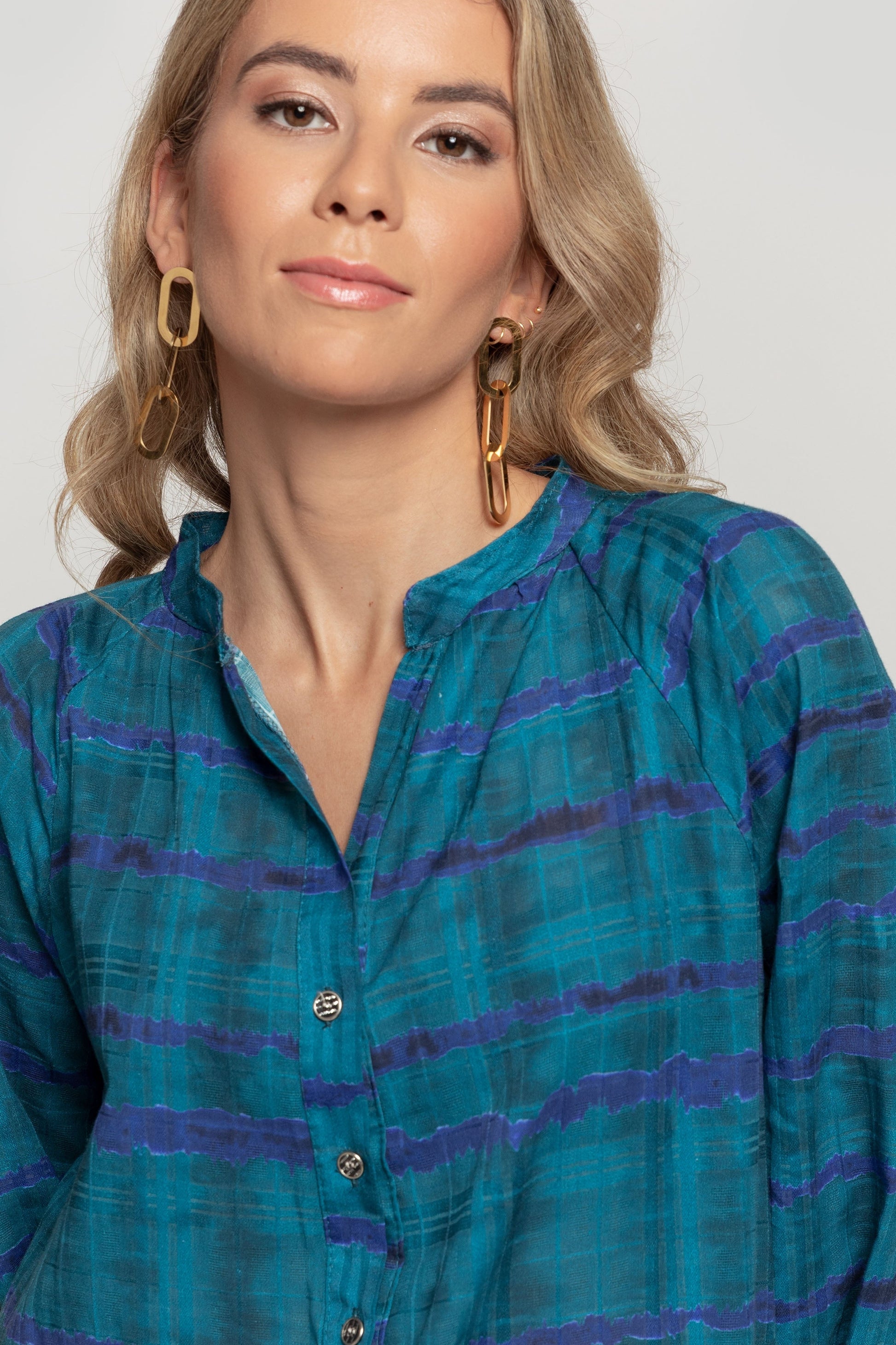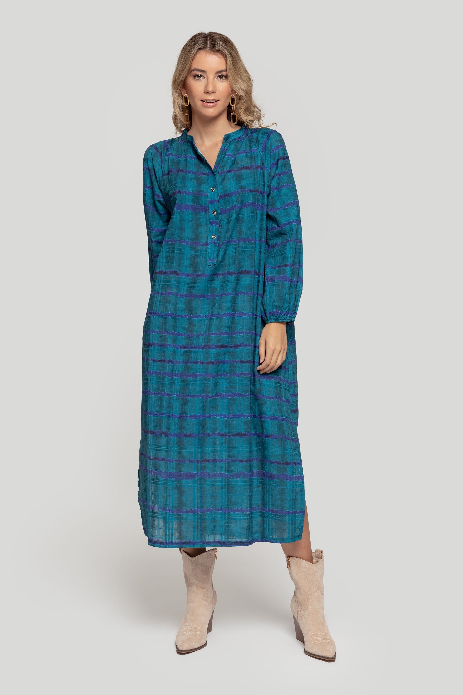 Tejido algodón. Diseño estampado. Diseño largo. Diseño recto. Diseño túnica. Cuello pico. Manga larga. Puñp elástico. Abertura lateral. Detalle botones. Talla modelo: S. Altura modelo 1,70 m.