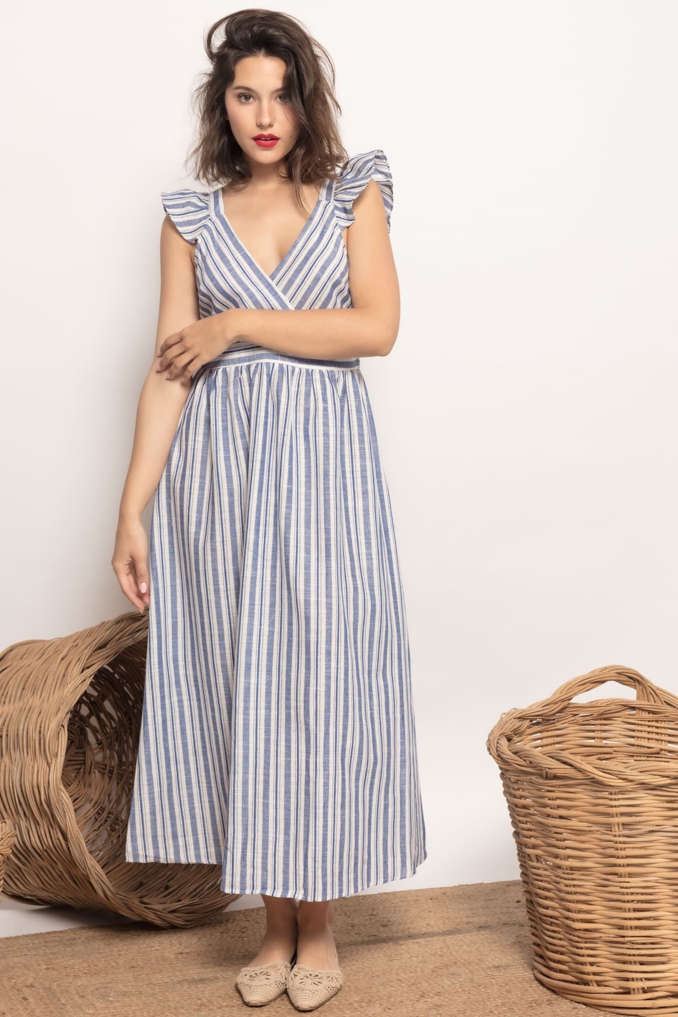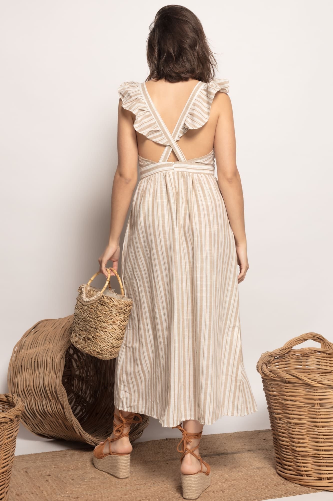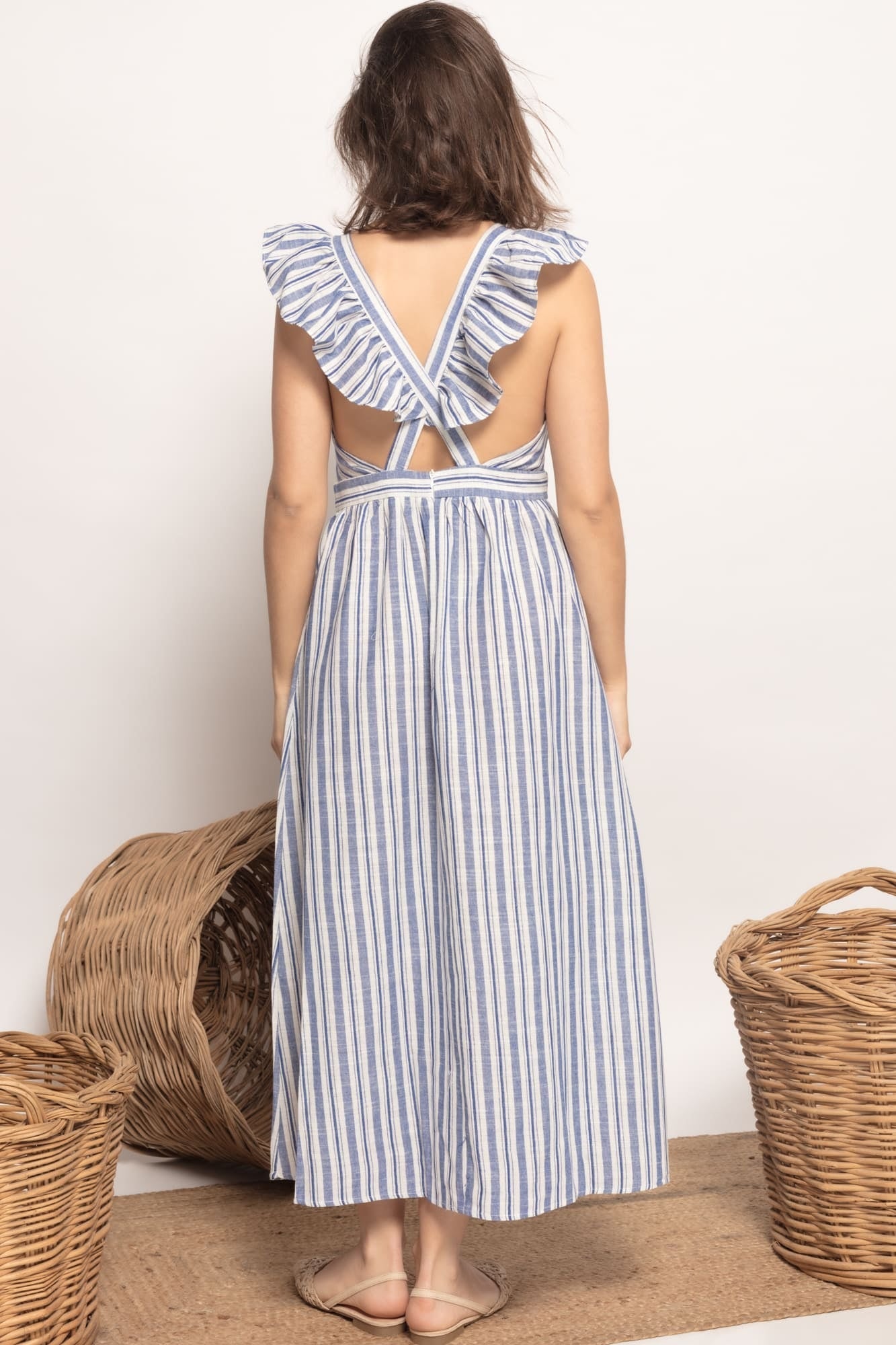 Vestido largo estampado rayas. Tejido efecto lino. Escote pico, manga de tirantes con acabado en volantes. Espalda con tirantes cruzados. Cierre de cremallera oculta en la espalda. Talla modelo: S. Altura modelo: 1,73 m.