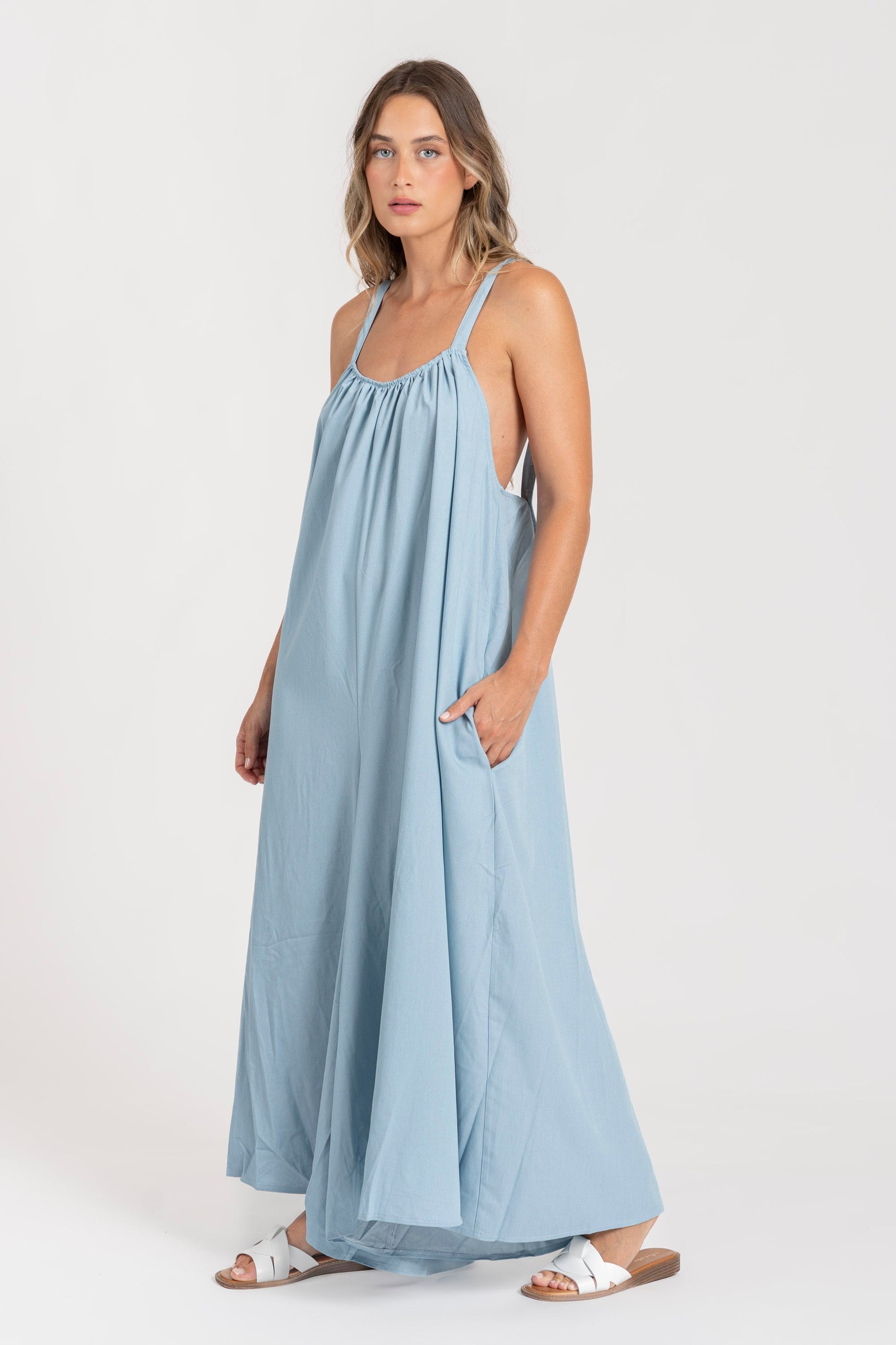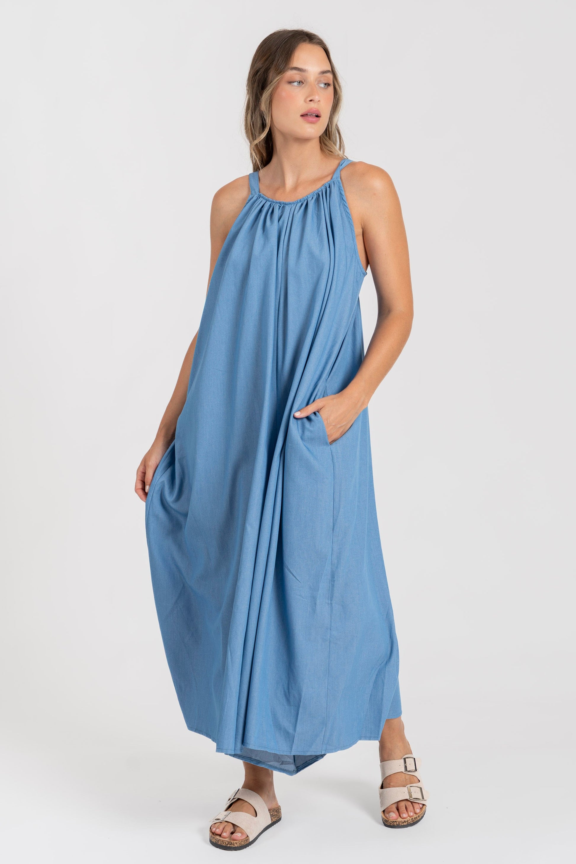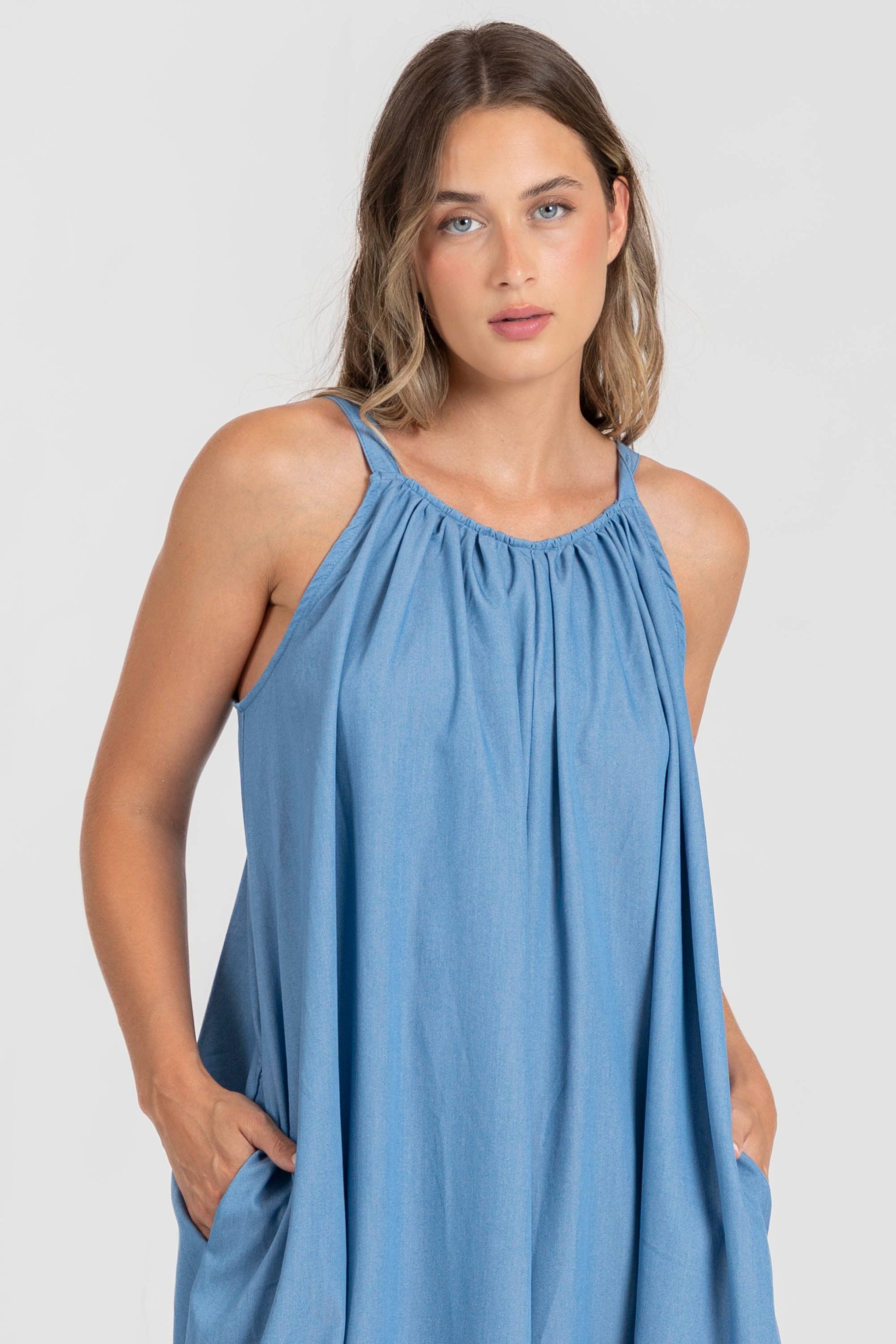 Tejido fluido. Diseño recto. Diseño largo. Cuello redondo. Tirantes anchos ajustables. Bolsillos laterales. Talla modelo: S. Altura modelo 1,66 m.