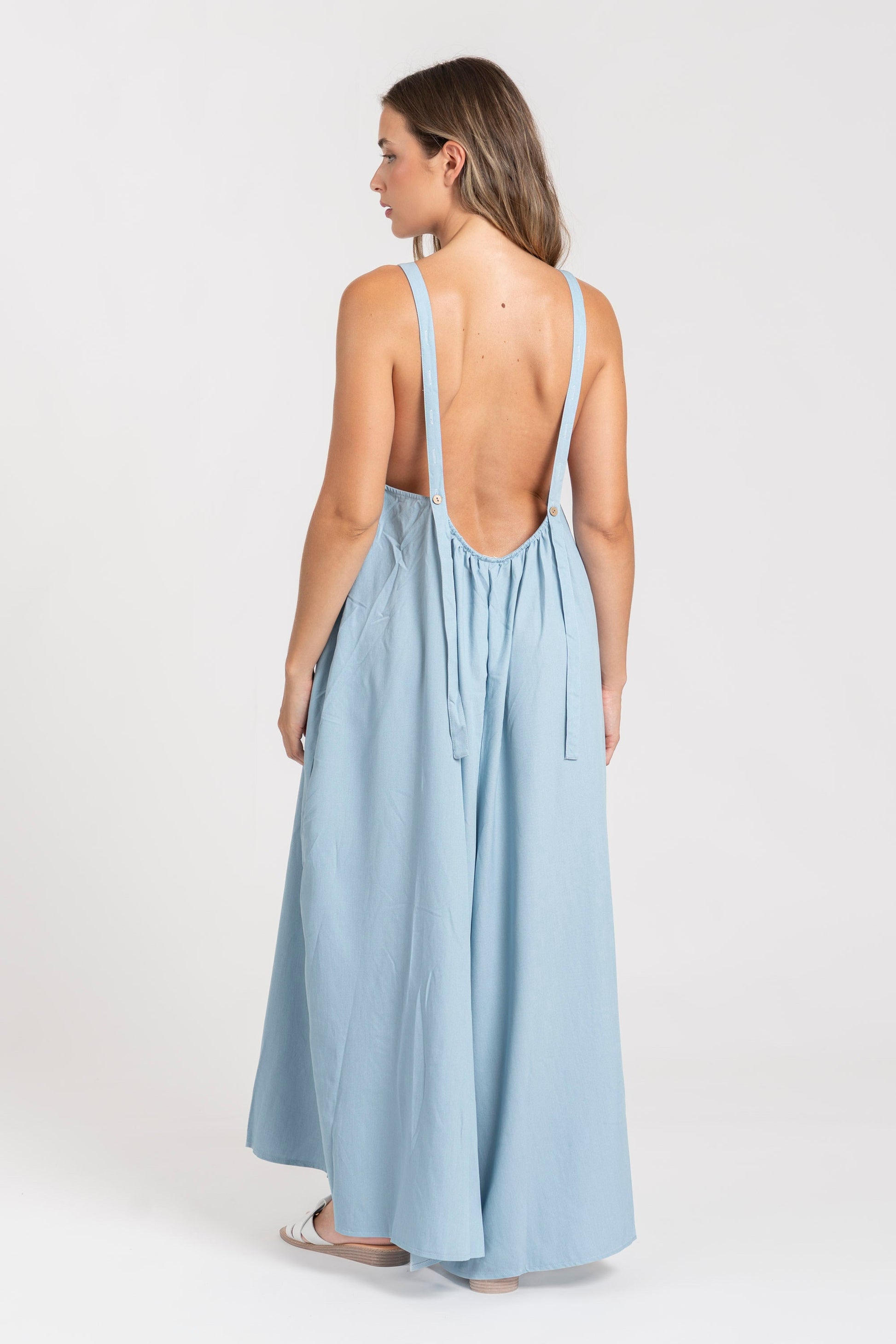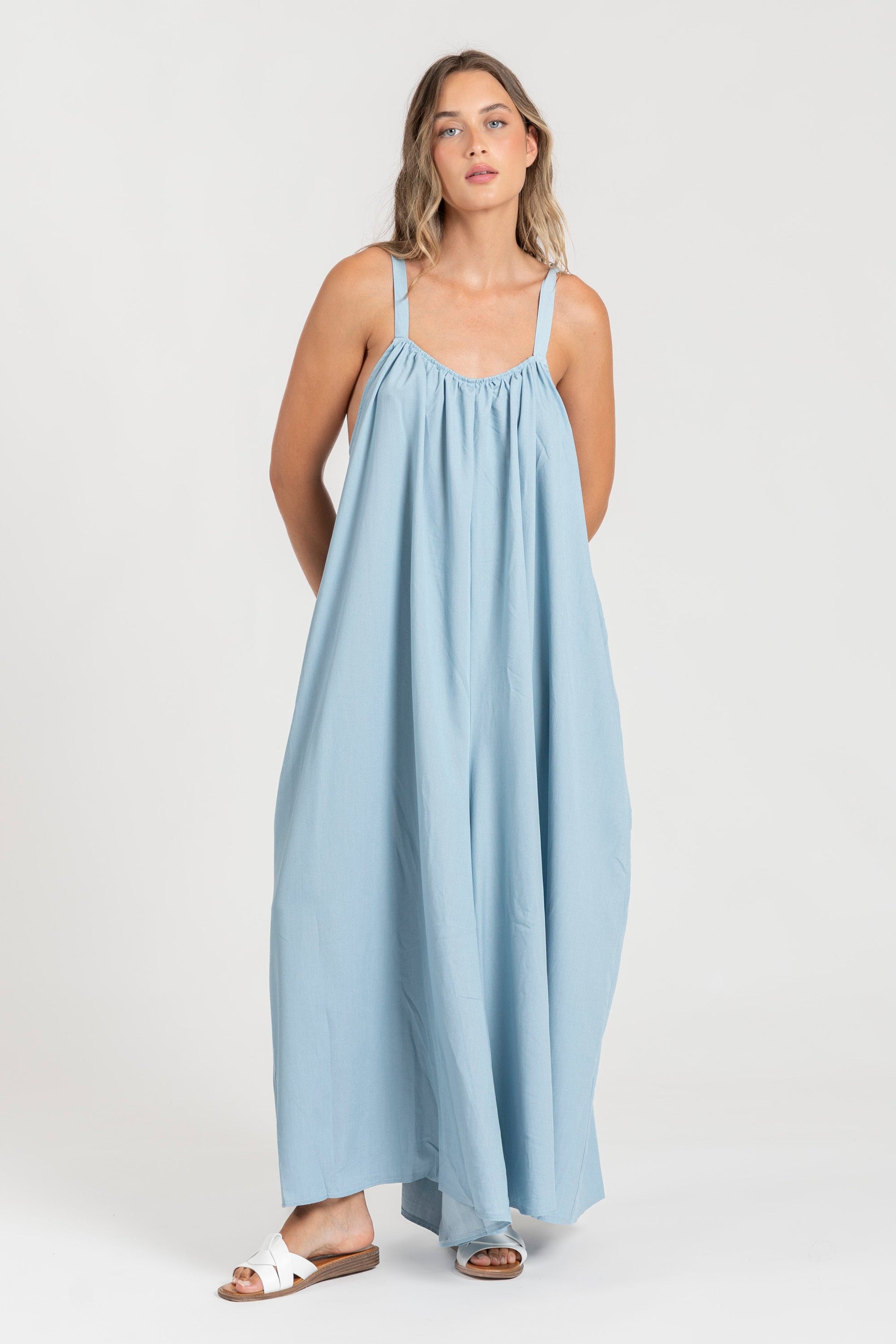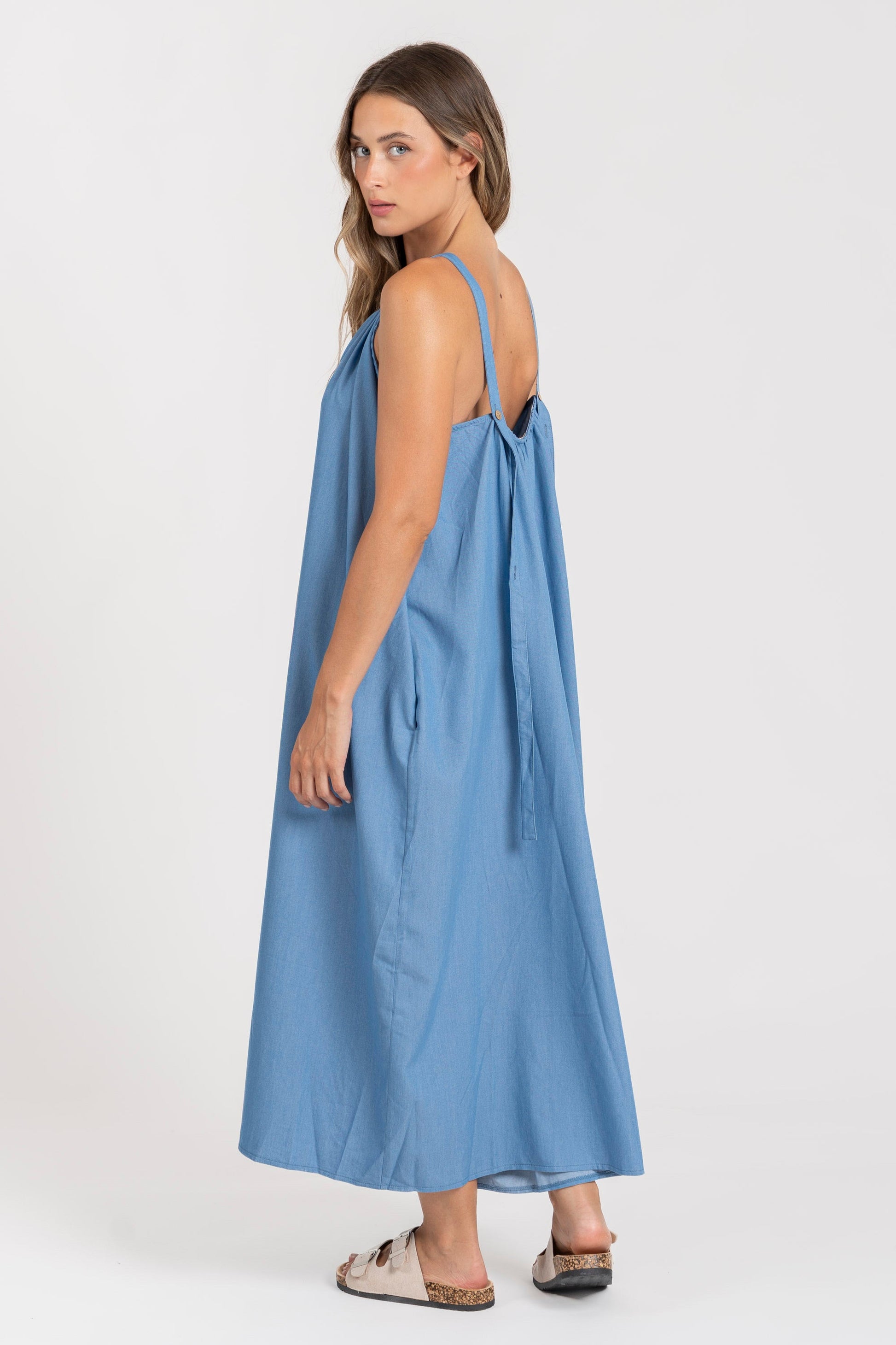Tejido fluido. Diseño recto. Diseño largo. Cuello redondo. Tirantes anchos ajustables. Bolsillos laterales. Talla modelo: S. Altura modelo 1,66 m.