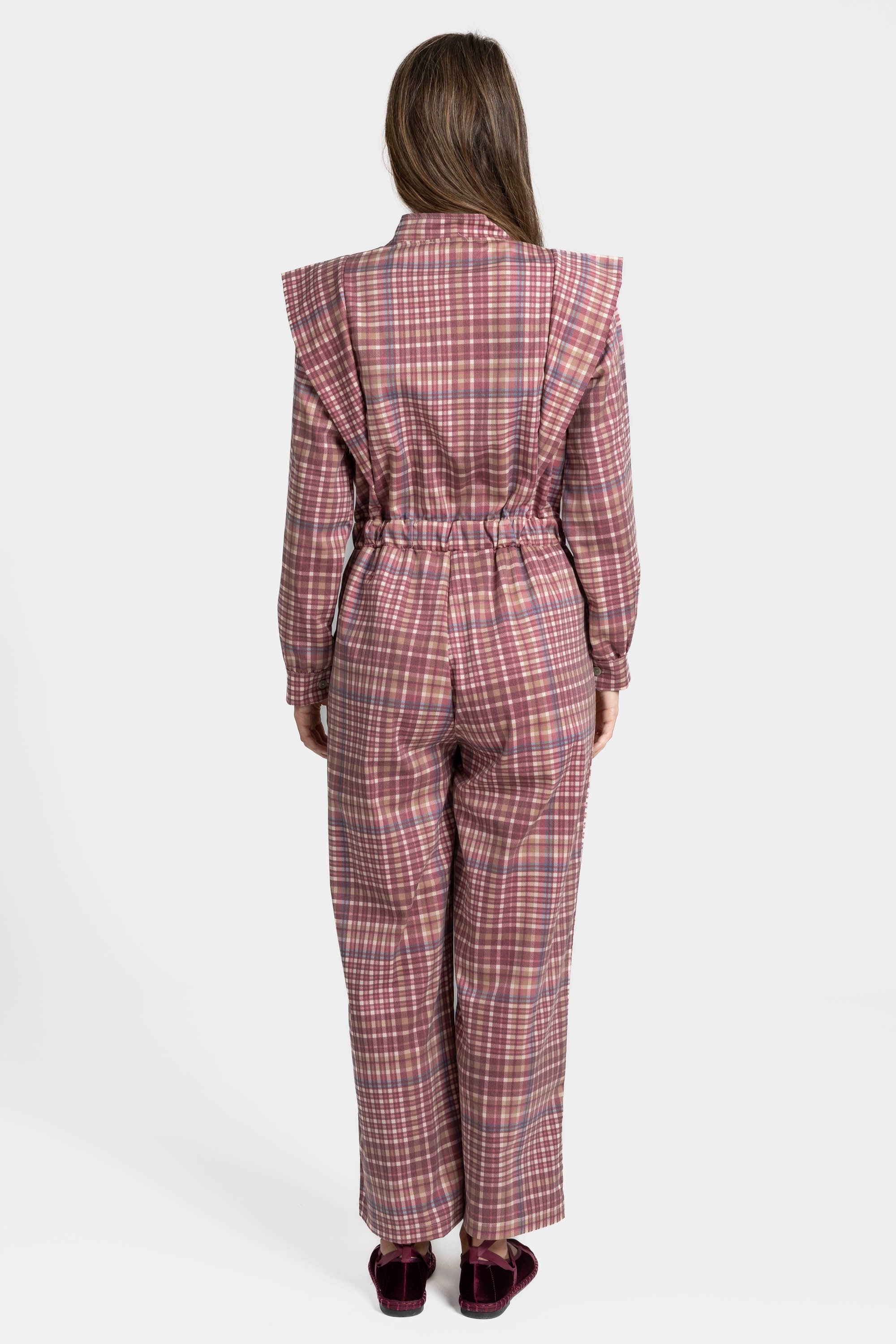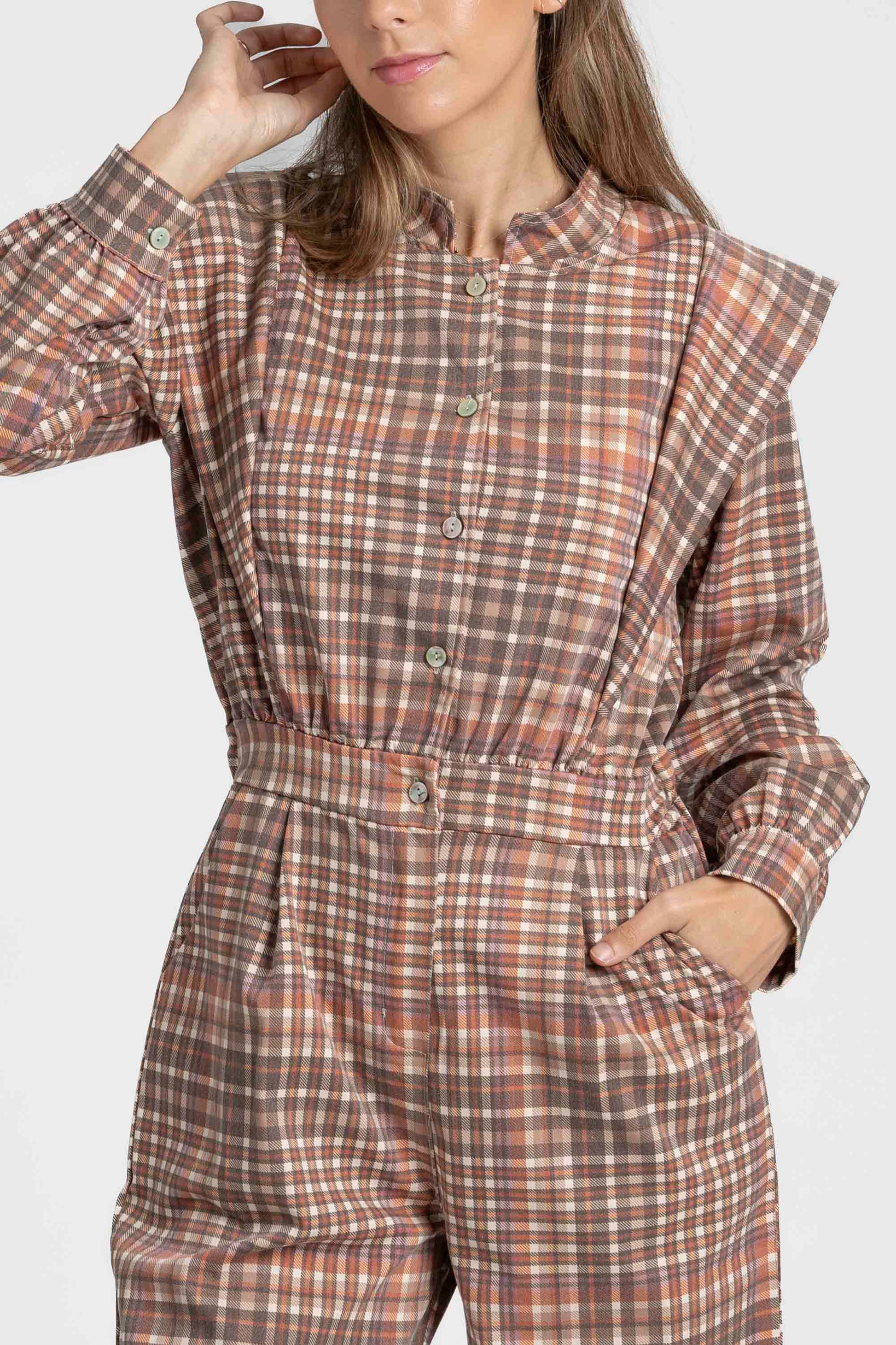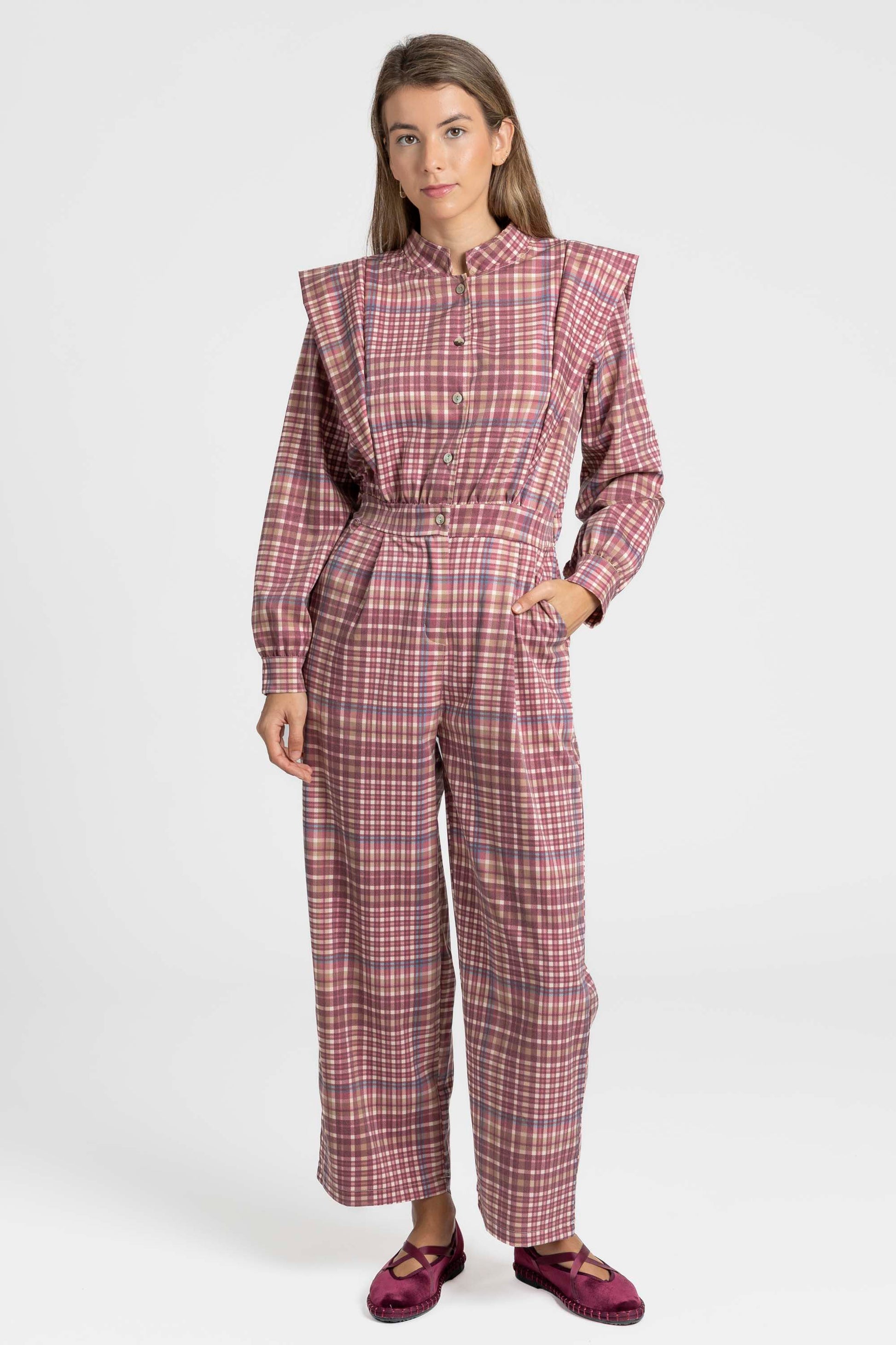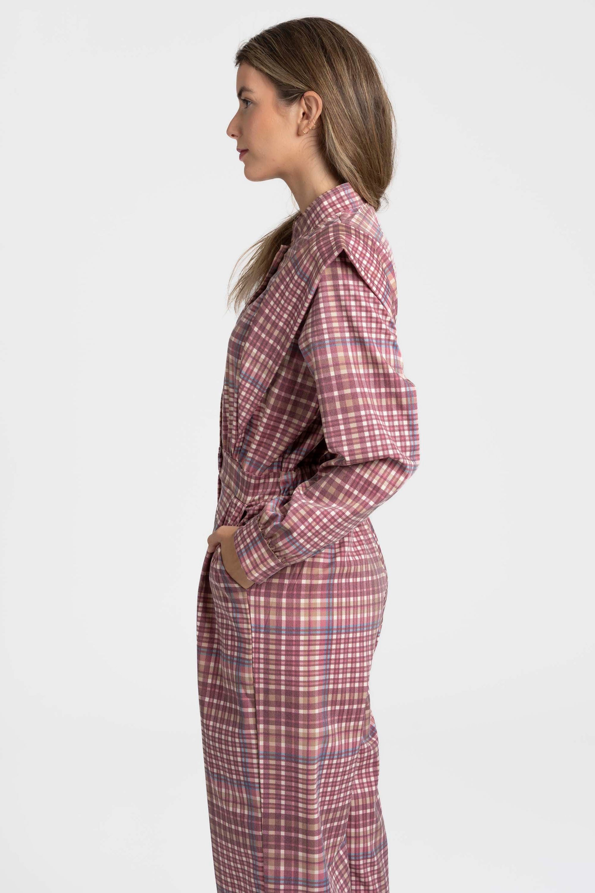 Tejido estampado cuadros. Cuello redondo. Manga larga. Cierre botones. Cintura elástica y cremallera. Pernera recta. Bolsillos laterales.