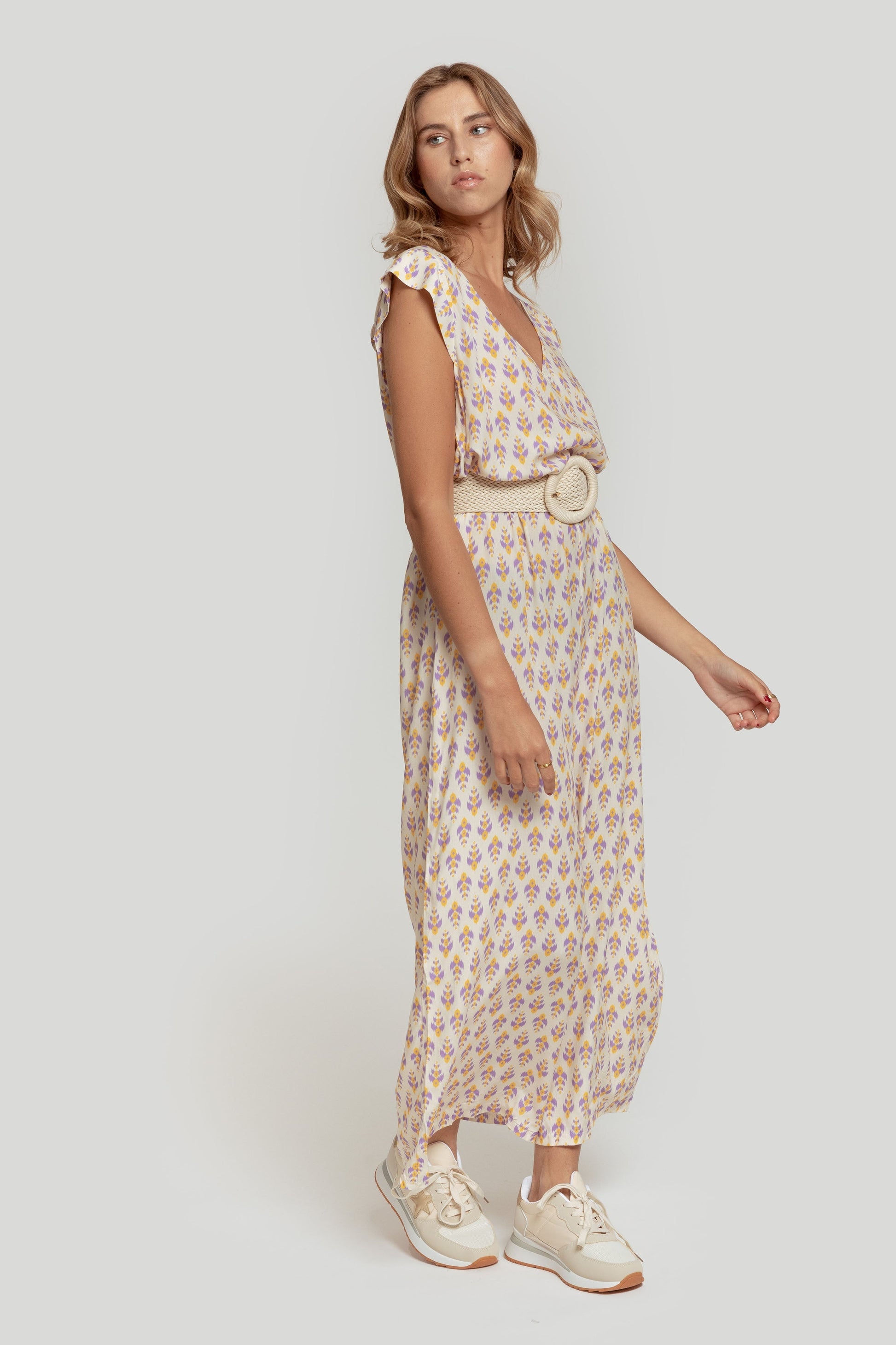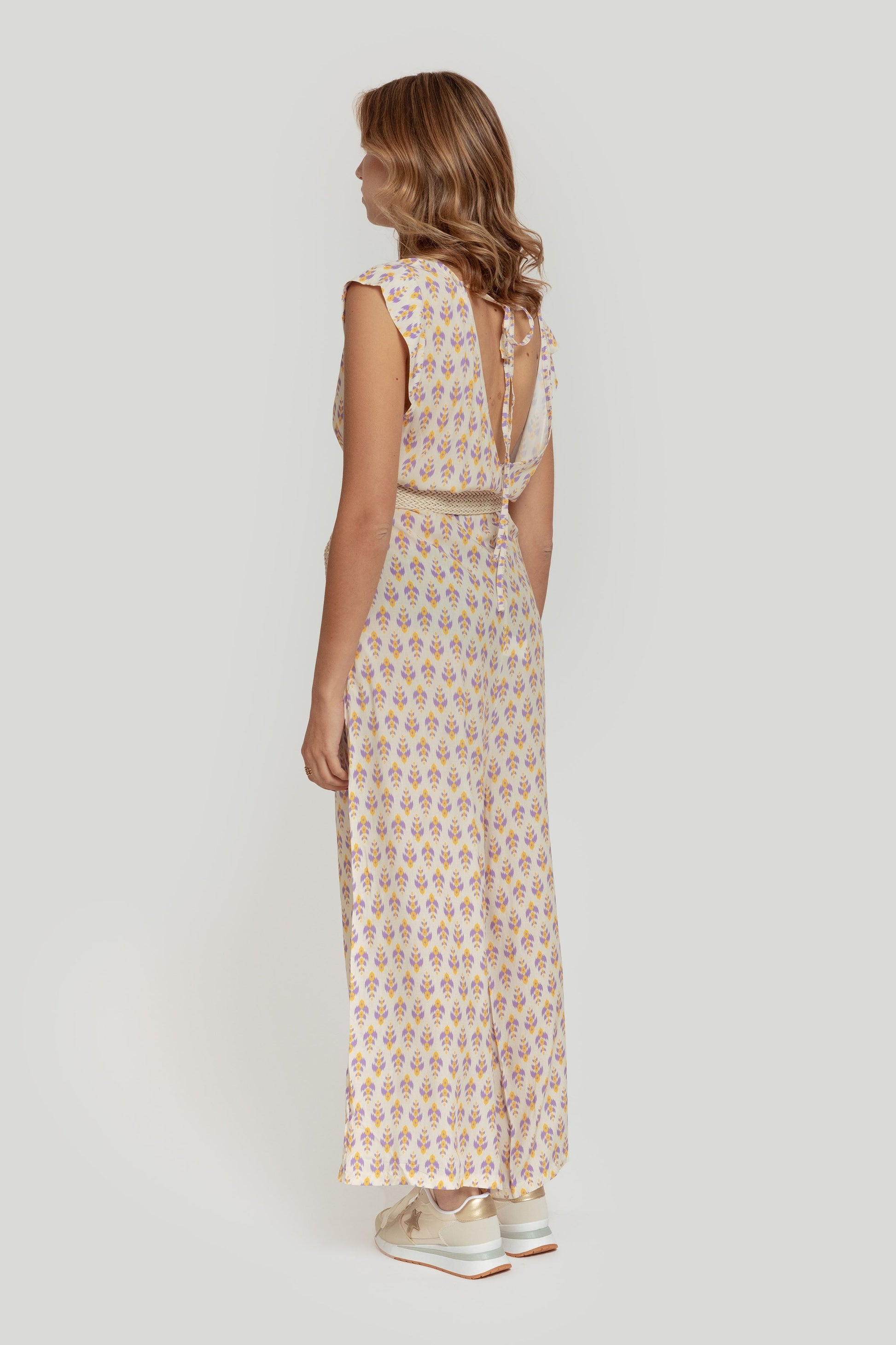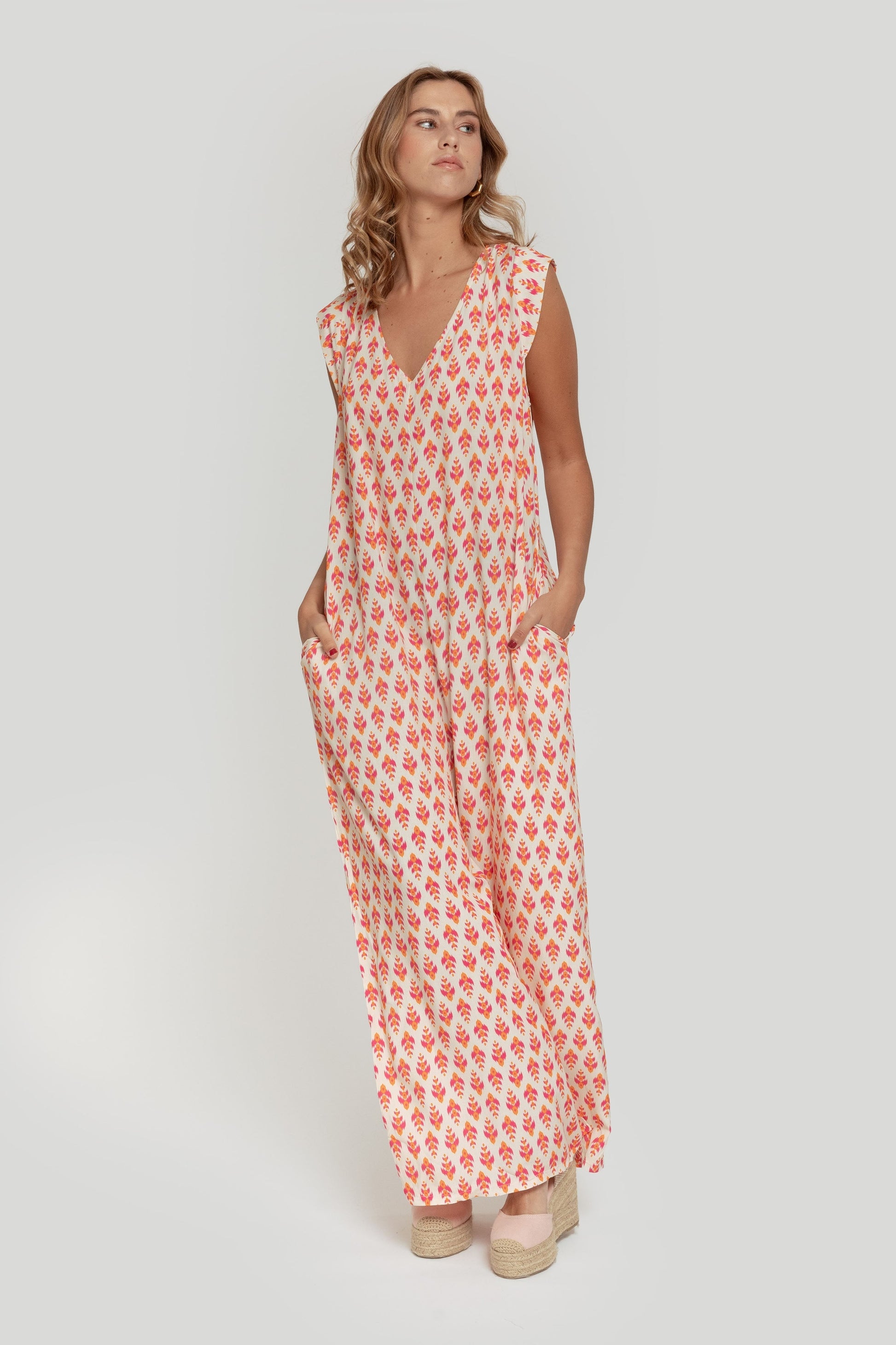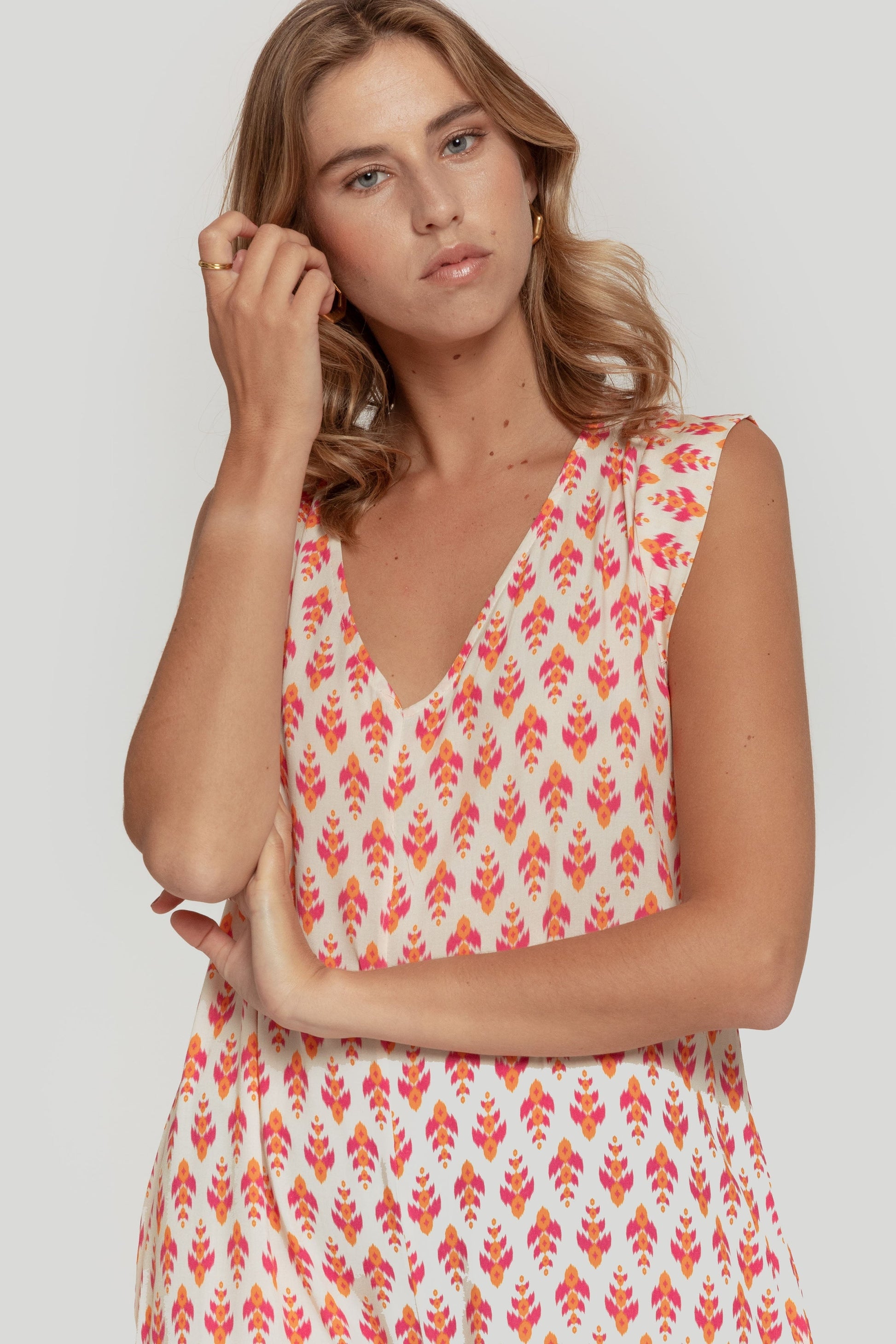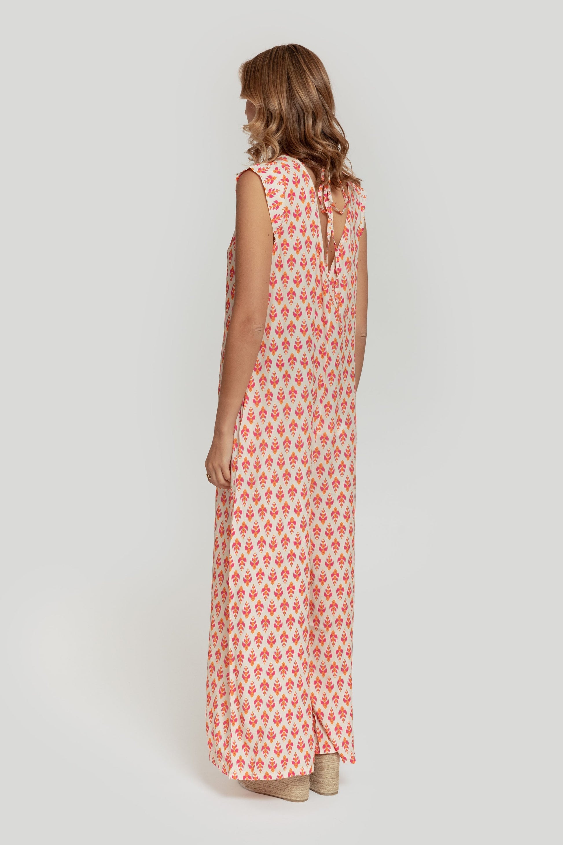 Tejido fluido. Diseño estampado. Diseño recto. Diseño largo. Cuello pico. Manga sisa. Detalle cordón a la espalda. Talla modelo: S. Altura modelo 1,70 m.