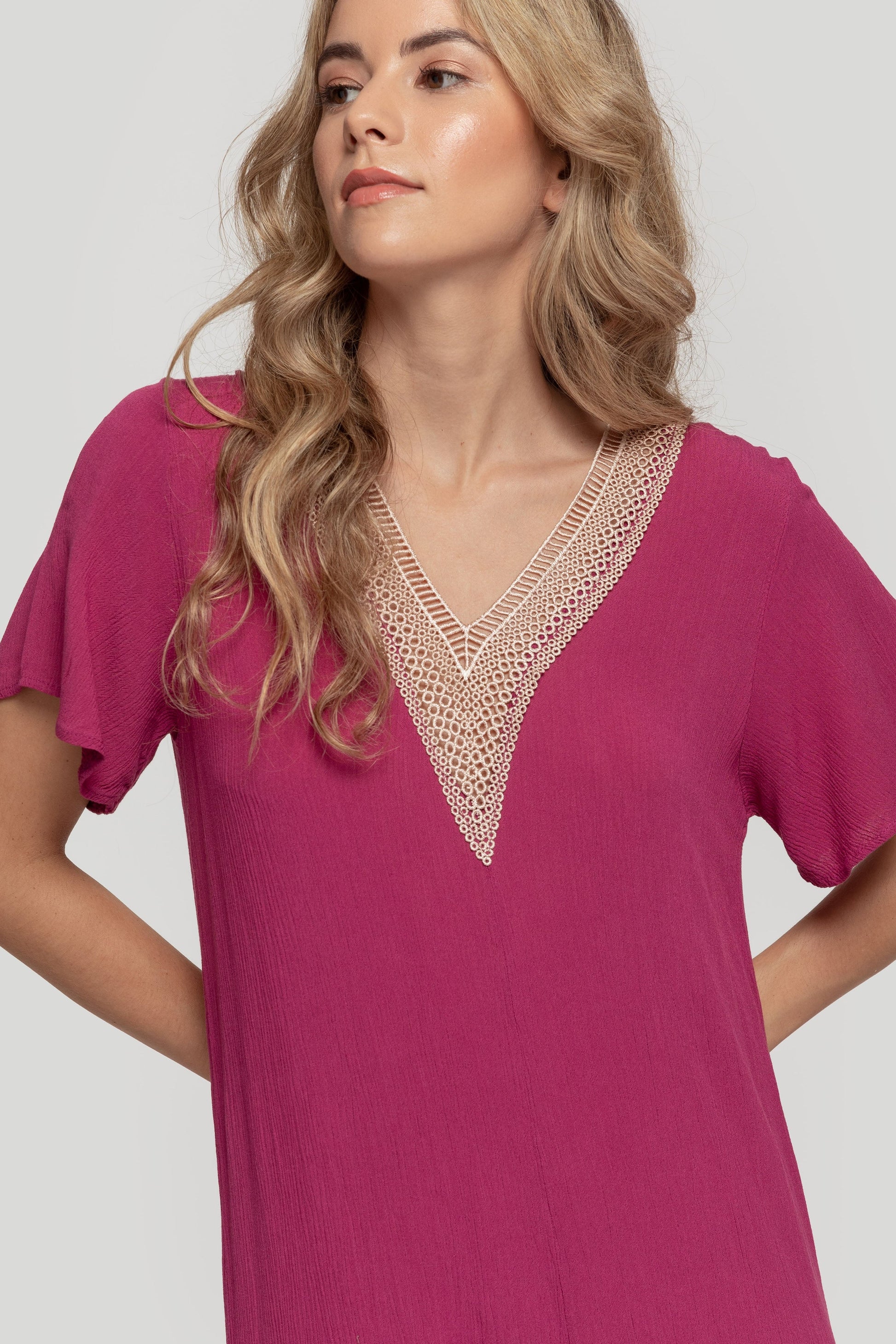 Tejido textura. Diseño recto. Diseño fluido. Cuello pico. Manga corta. Cordón decorativo en la espalda. Talla modelo: S. Altura modelo 1,70 m.