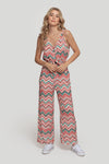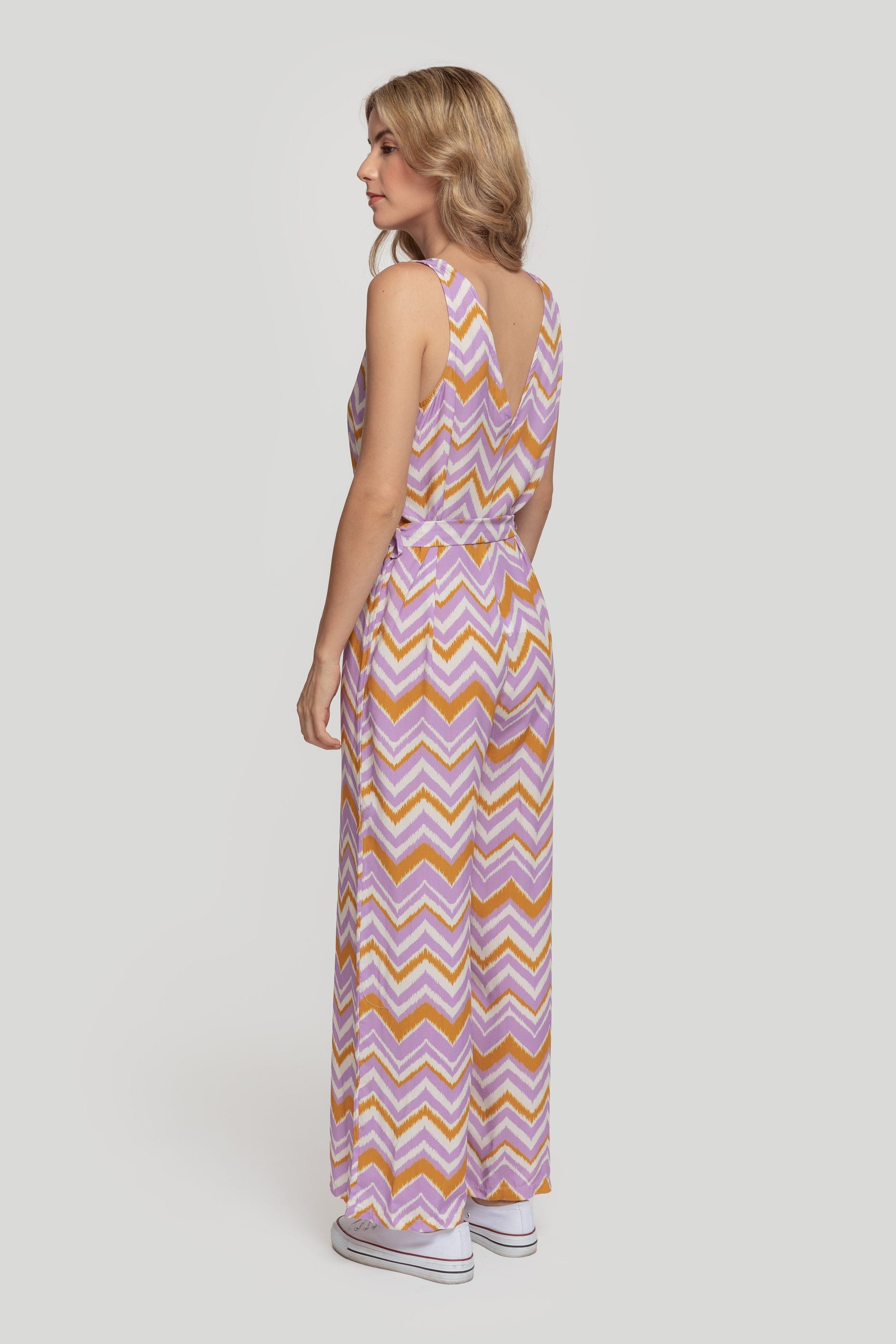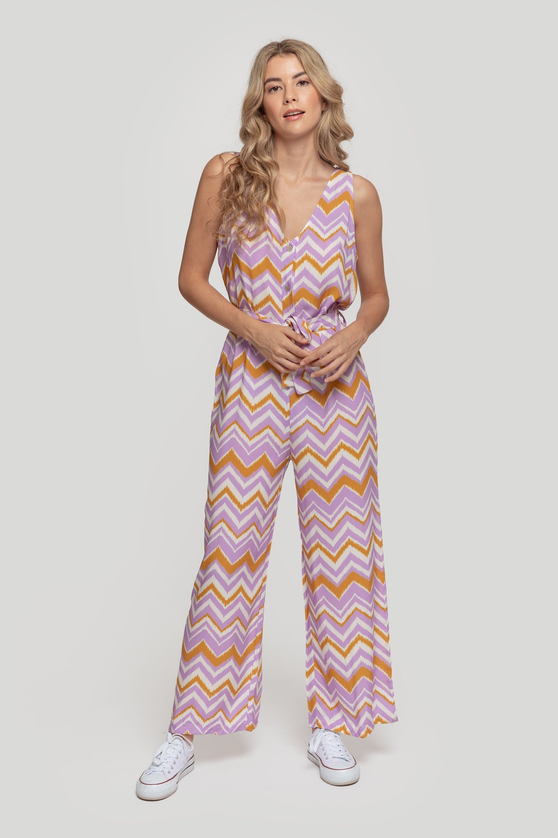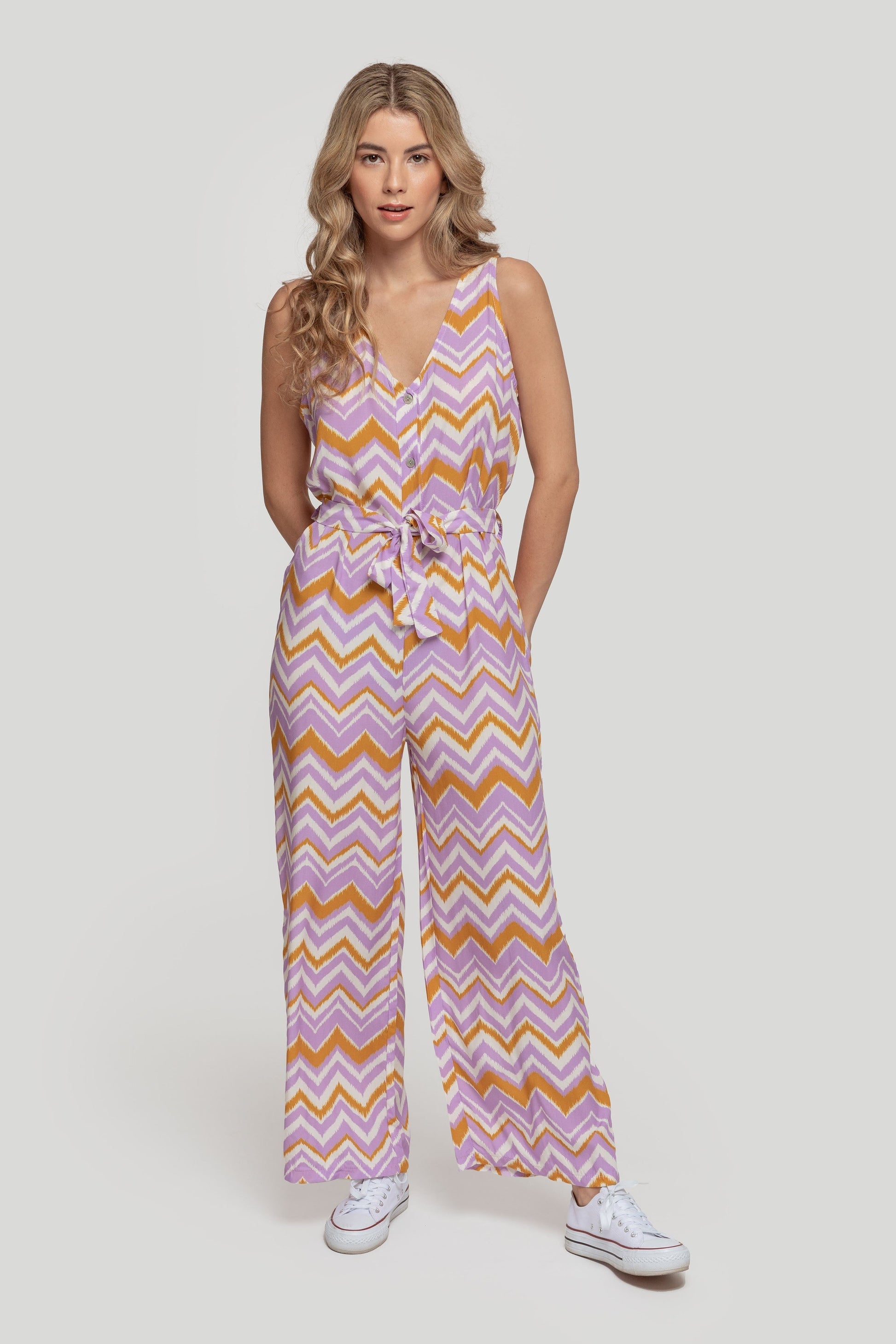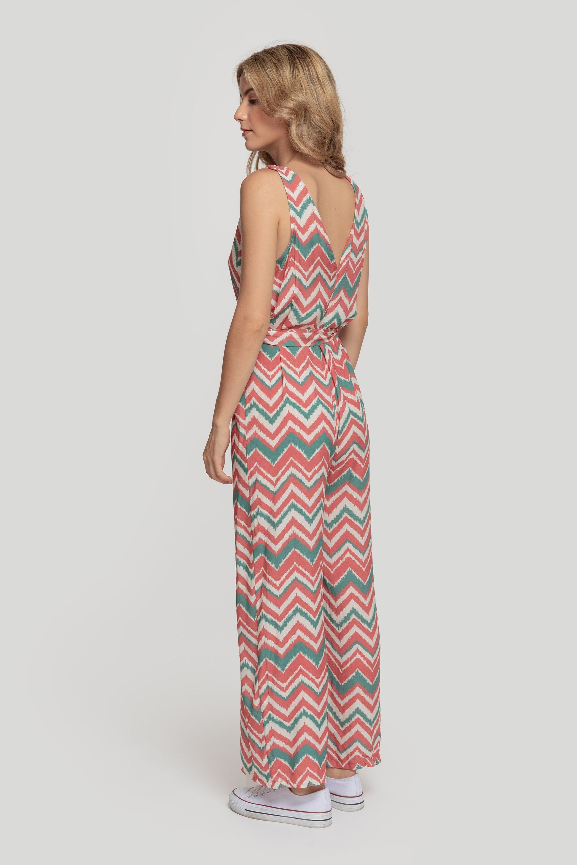 Mono largo. Tejido ligero. Diseño recto. Diseño estampado. Escote pico. Tirantes anchos. Cierre de botones. Perneras amplias. Cinturón a contraste. Talla modelo: S. Altura modelo 1,70 m.