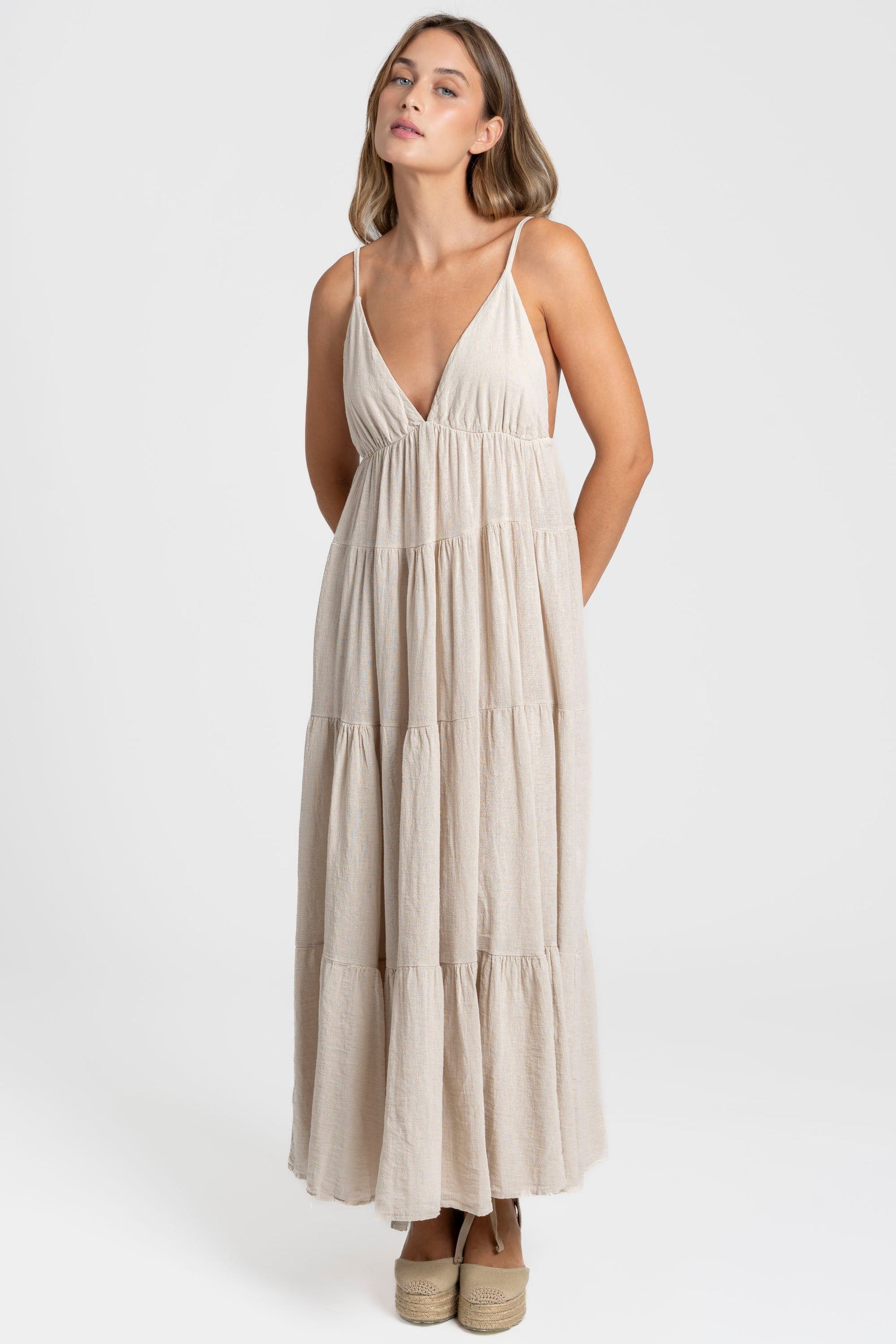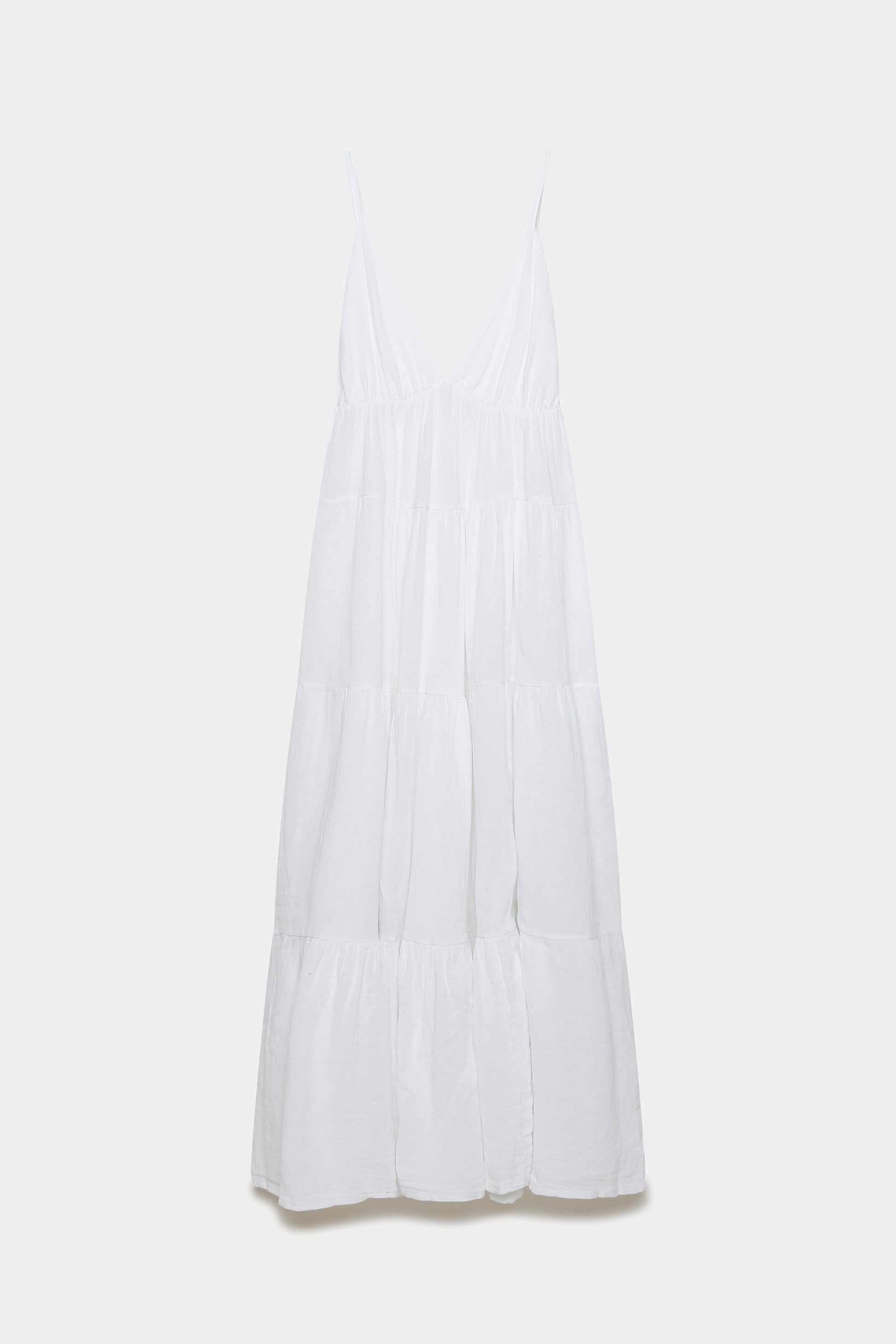 Tejido de algodón. Tirantes finos. Escote pico. Diseño largo.