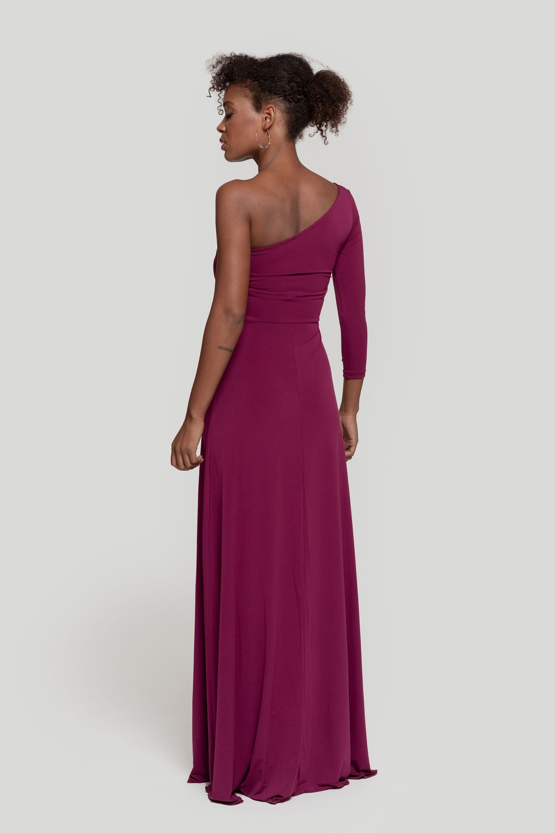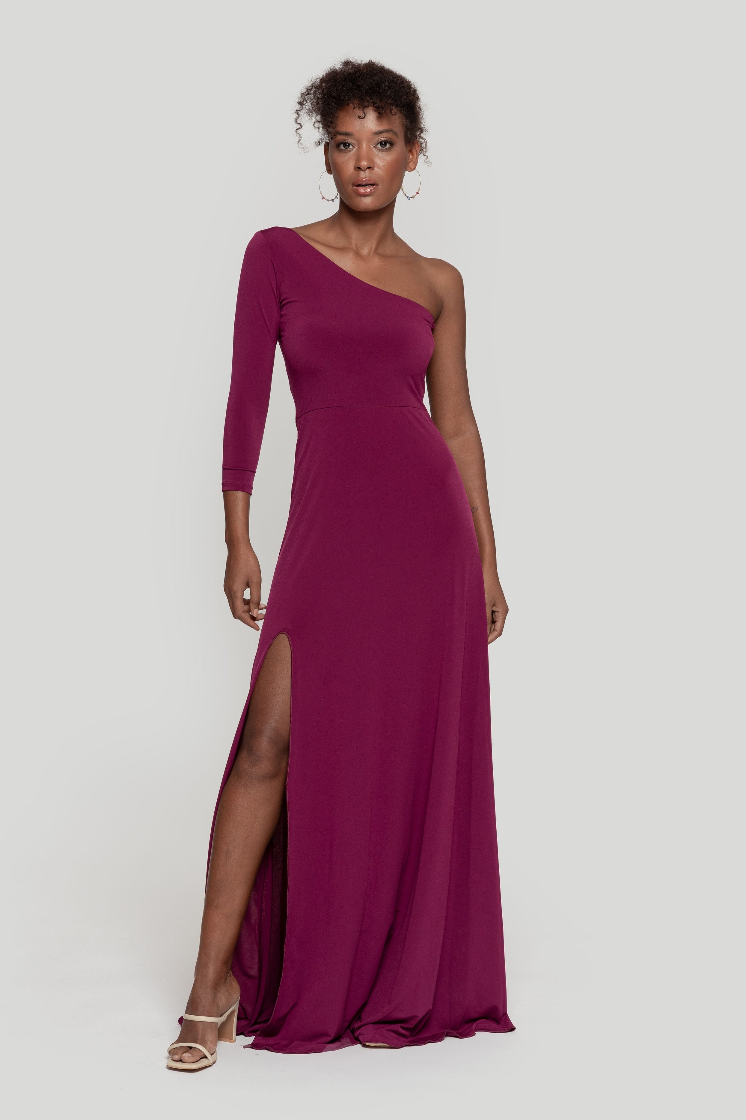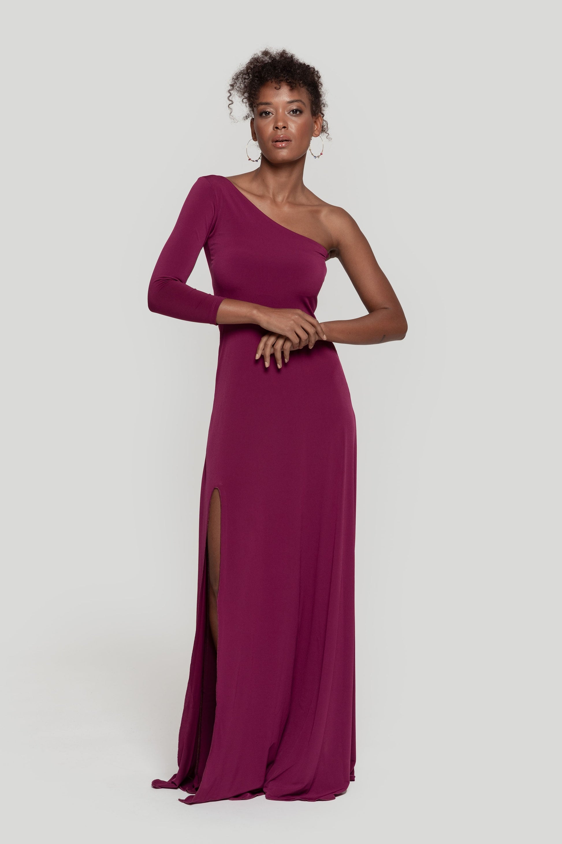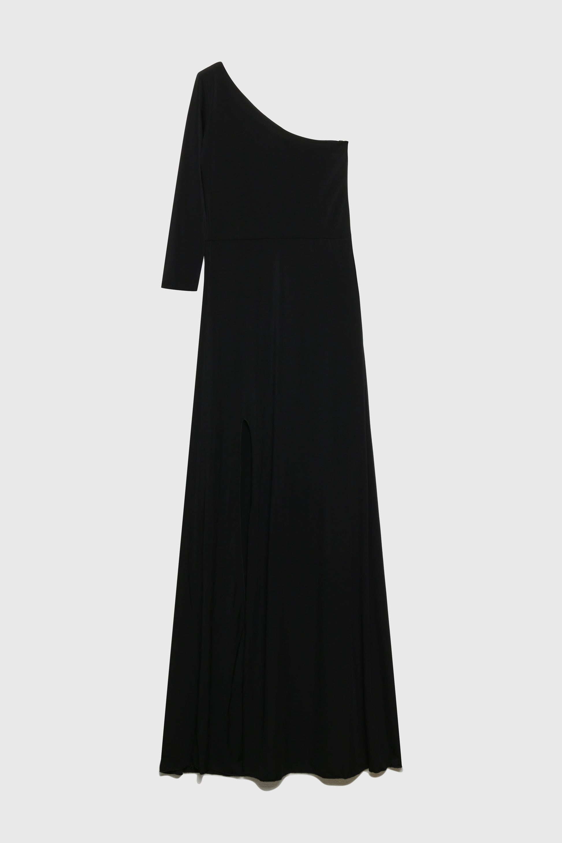 Tejido elástico. Diseño largo. Diseño recto. Manga asimétrica. Manga larga. Cierre de cremallera invisible lateral. Abertura lateral. Colección fiesta. Talla modelo: S. Altura modelo 1,65 m.