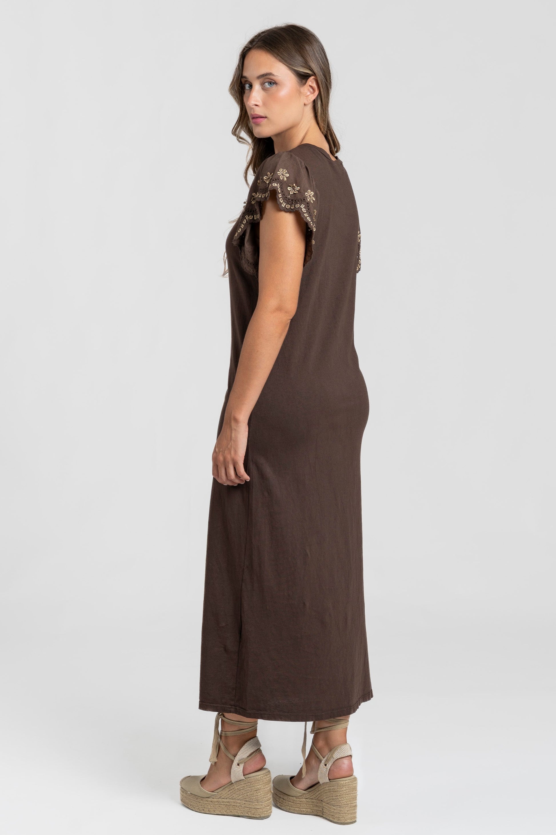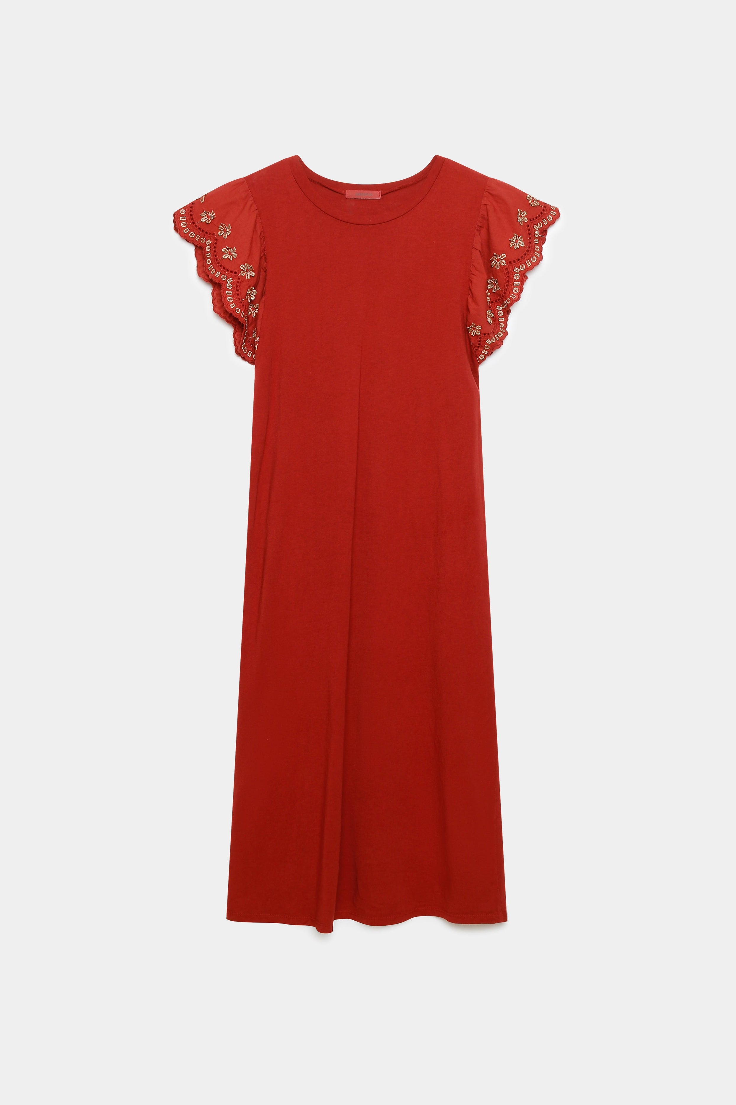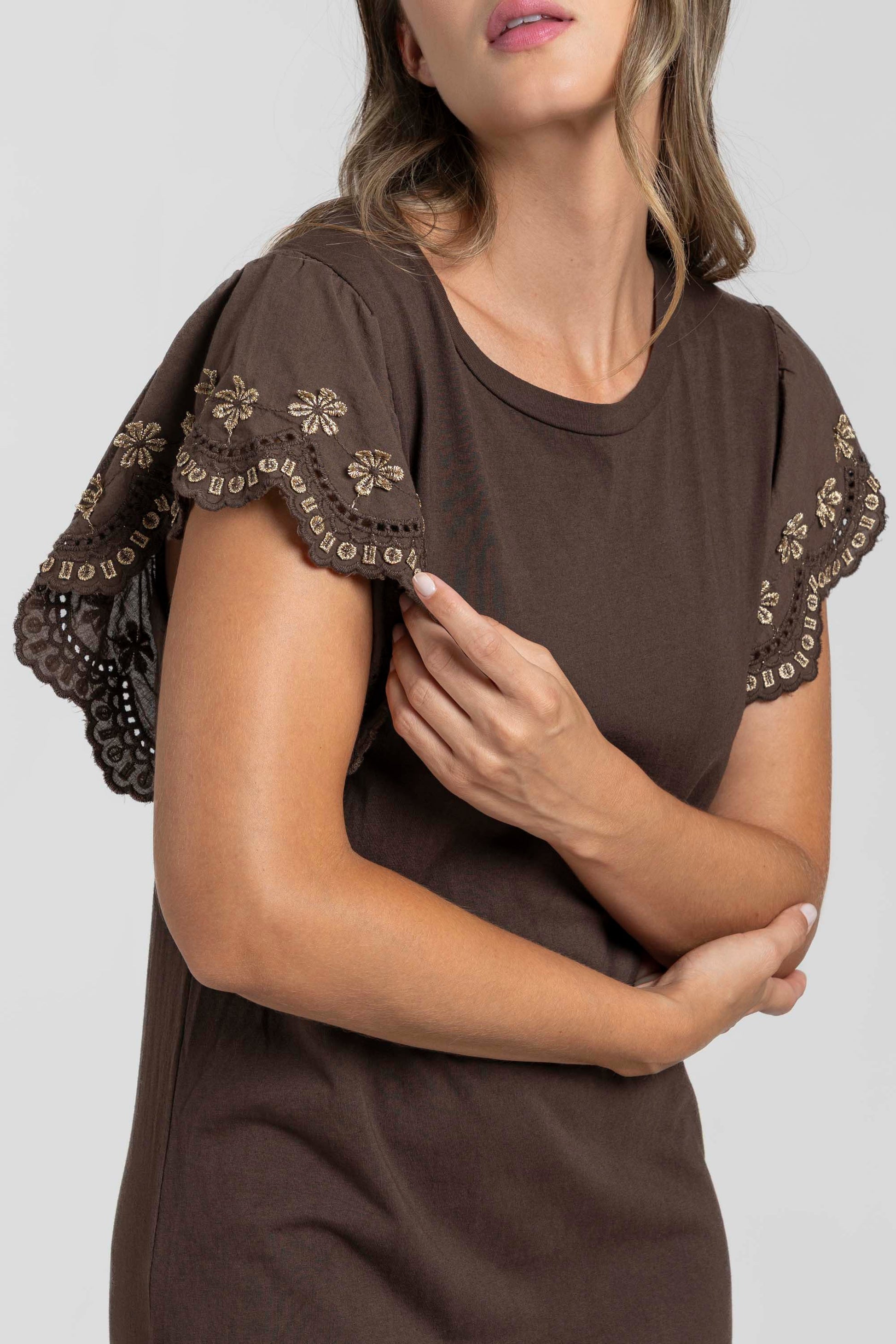 Tejido algodón. Cuello redondo. Manga corta. Bajo con aperturas. Detalle bordados en la manga. Talla modelo: S. Altura modelo 1,66 m.