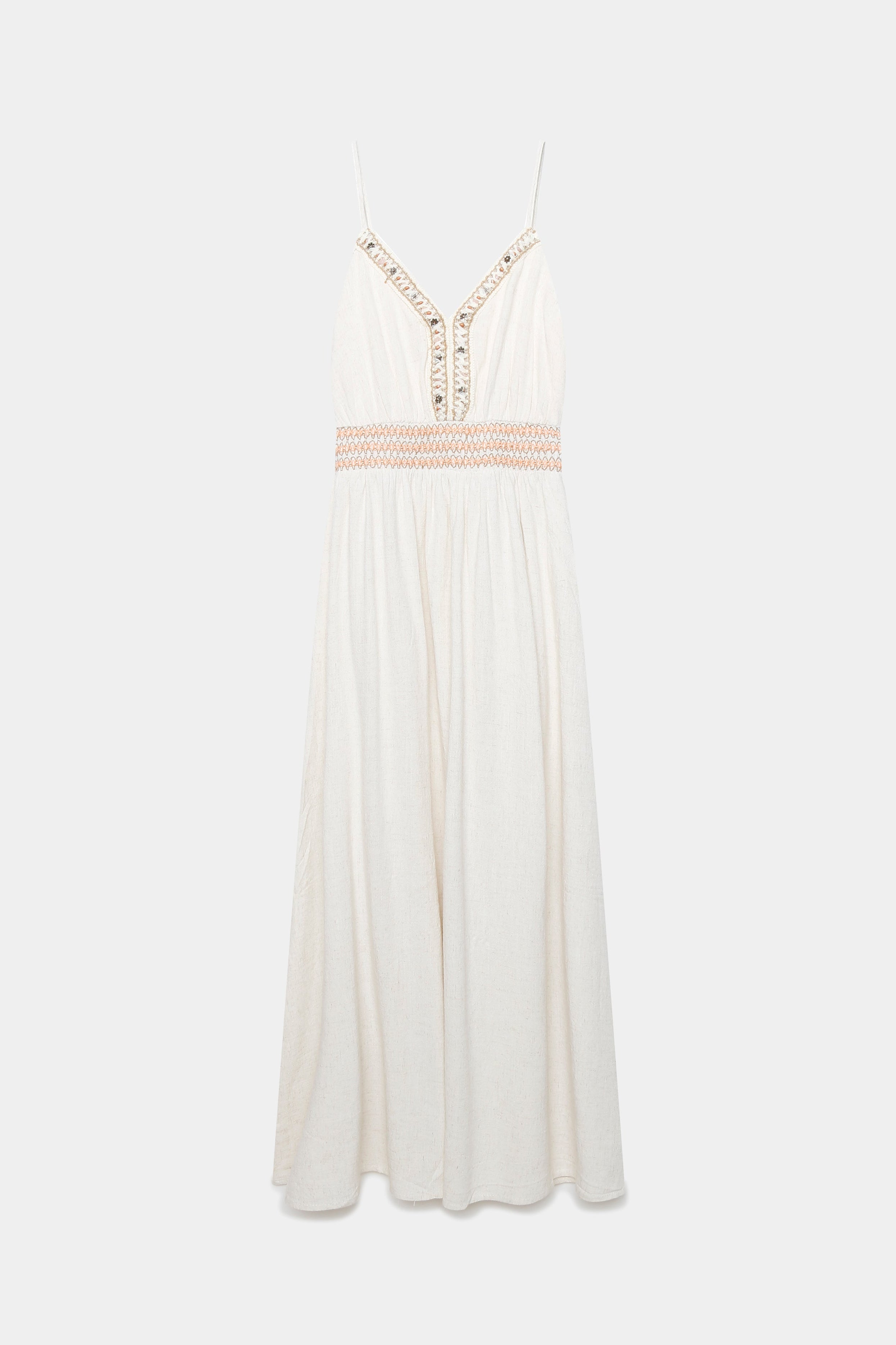 Tejido mezcla lino. Diseño largo. Detalle bordados. Tirantes ajustables.