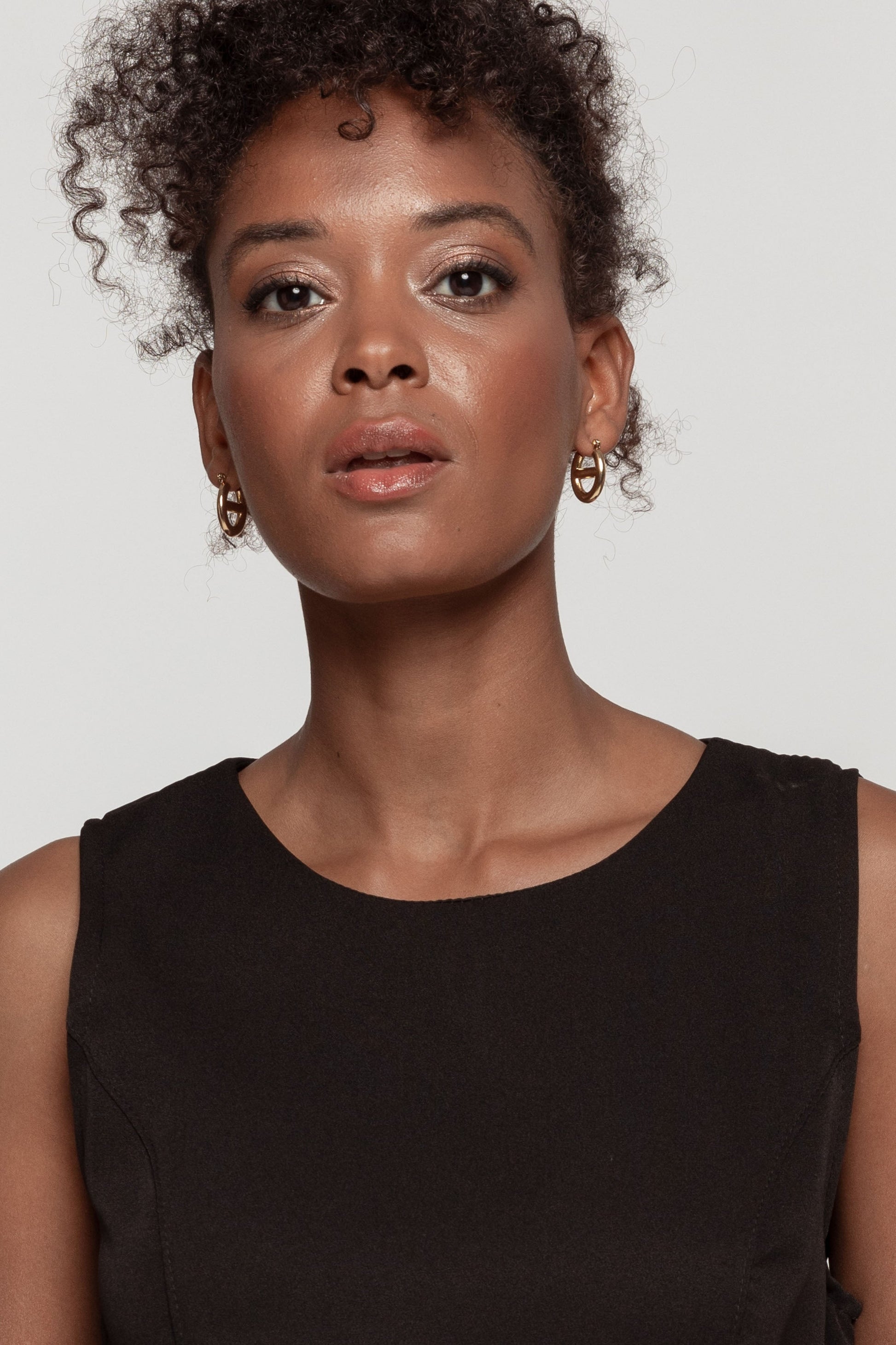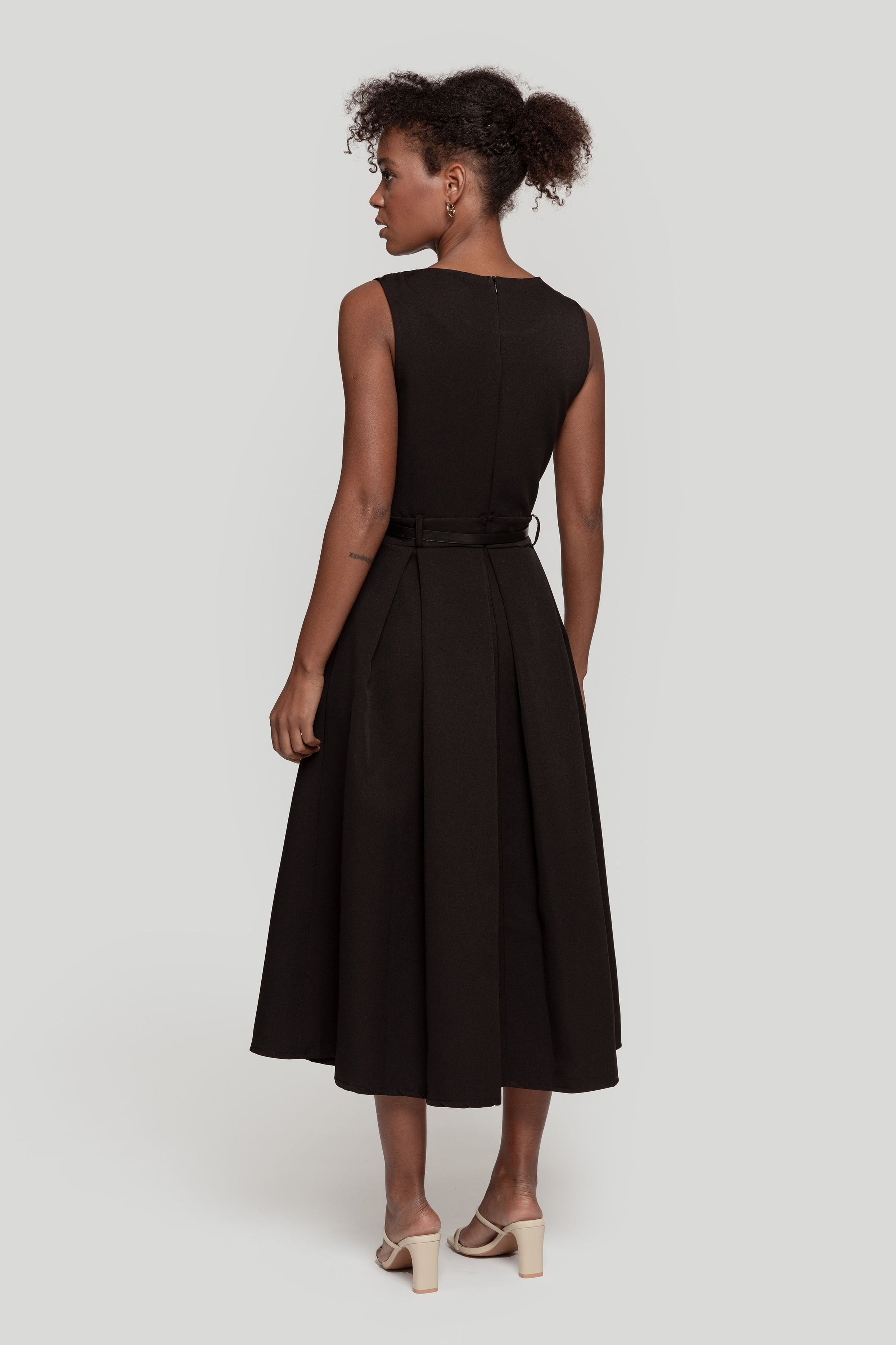 Tejido de acabado suave. Diseño semiajustado. Diseño fluido. Diseño midi. Cuello redondo. Manga sisa. Cierre de cremallera trasero. Detalles pliegues. Cinturón corazón. Talla modelo: S. Altura modelo 1,65 m.