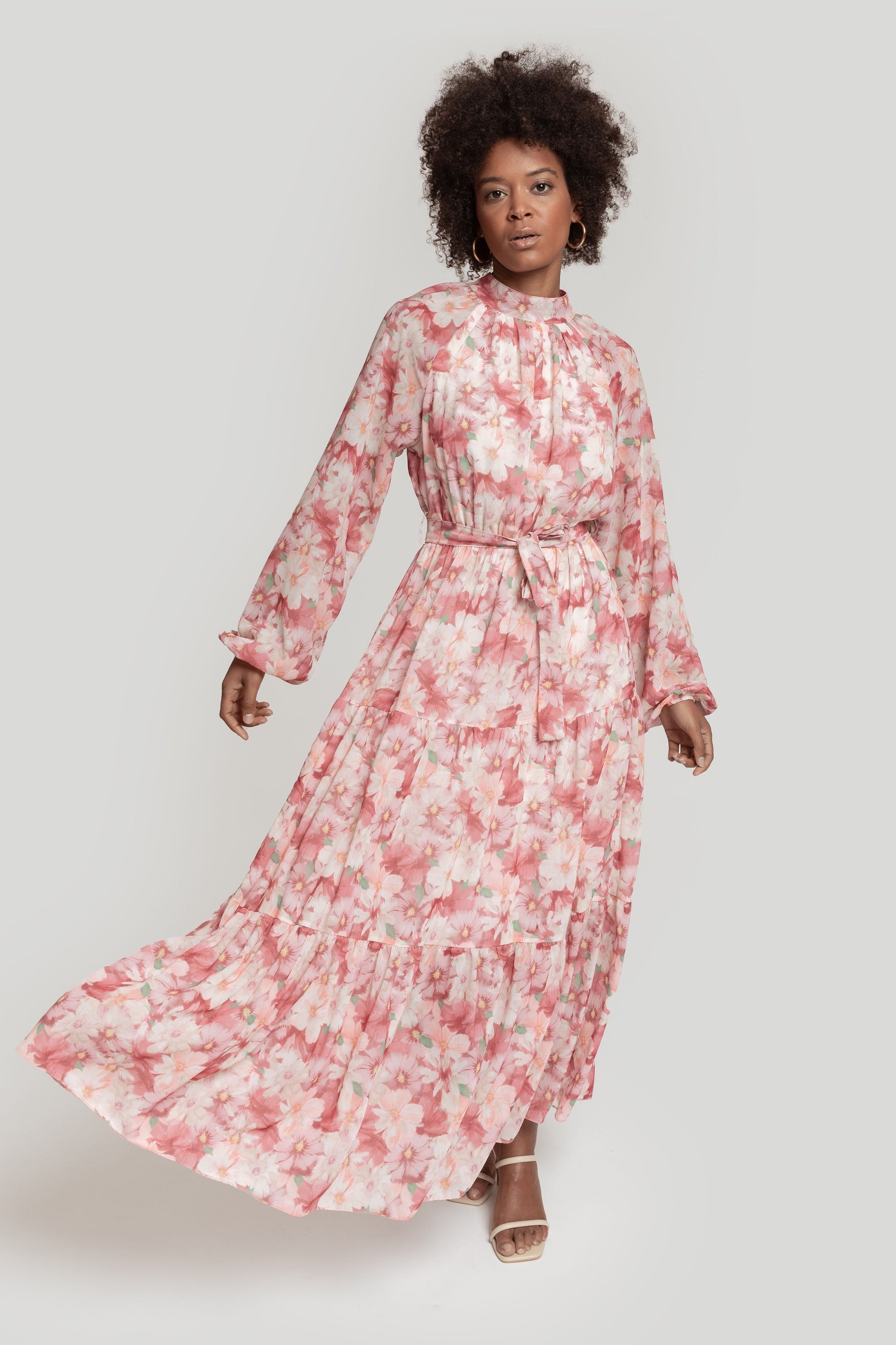 Tejido gasa. Diseño largo. Diseño evasé. Diseño estampado. Cuello alto. Manga larga. Puño elástico. Cintura elástica. Cinturón a contraste. Bajo volante. Forrado. Talla modelo: S. Altura modelo 1,65 m.