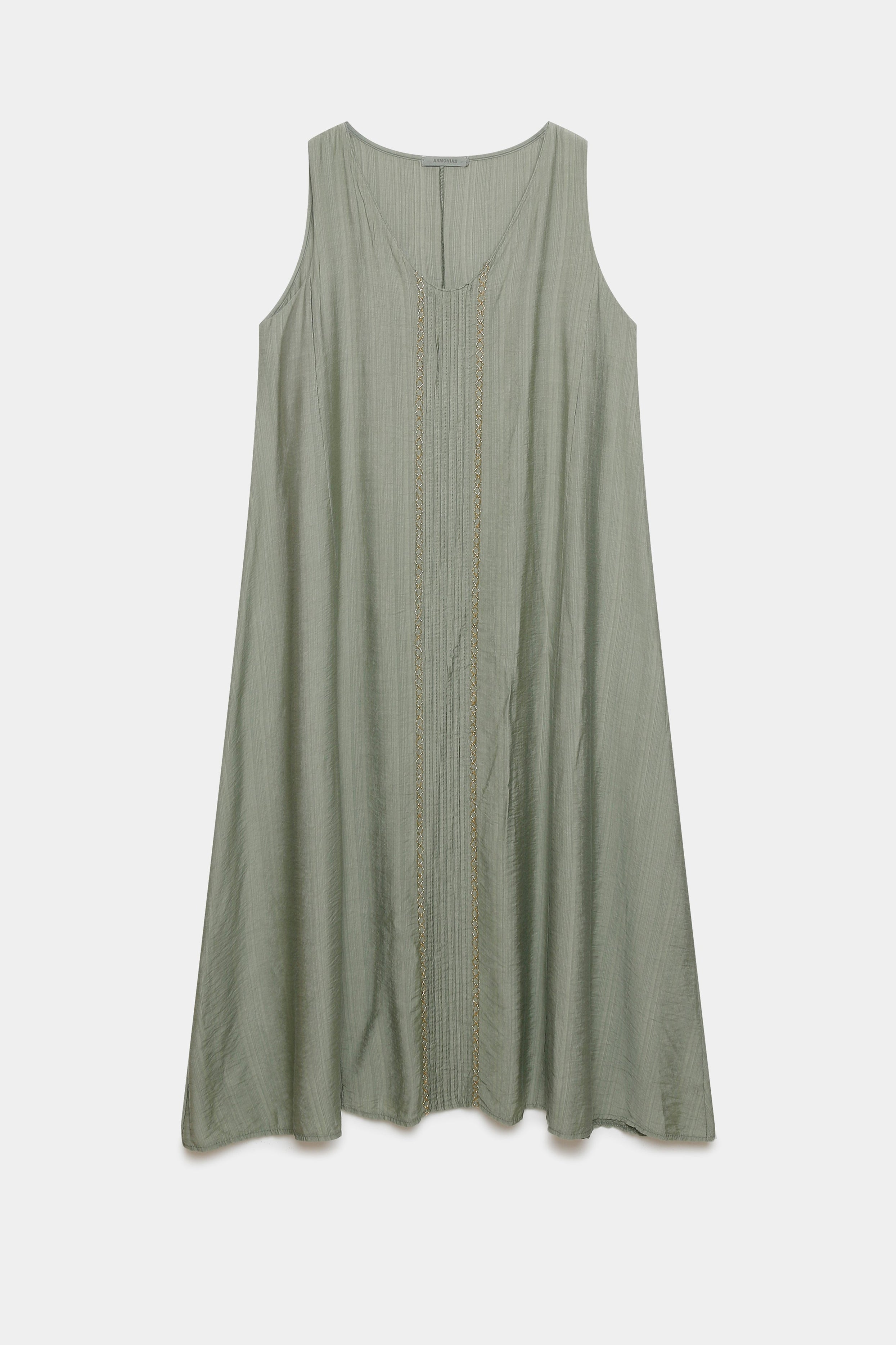 Tejido fino y fluido. Escote pico. Manga sisa. Talla única. Sisa a sisa 55cm. Largo 125cm.