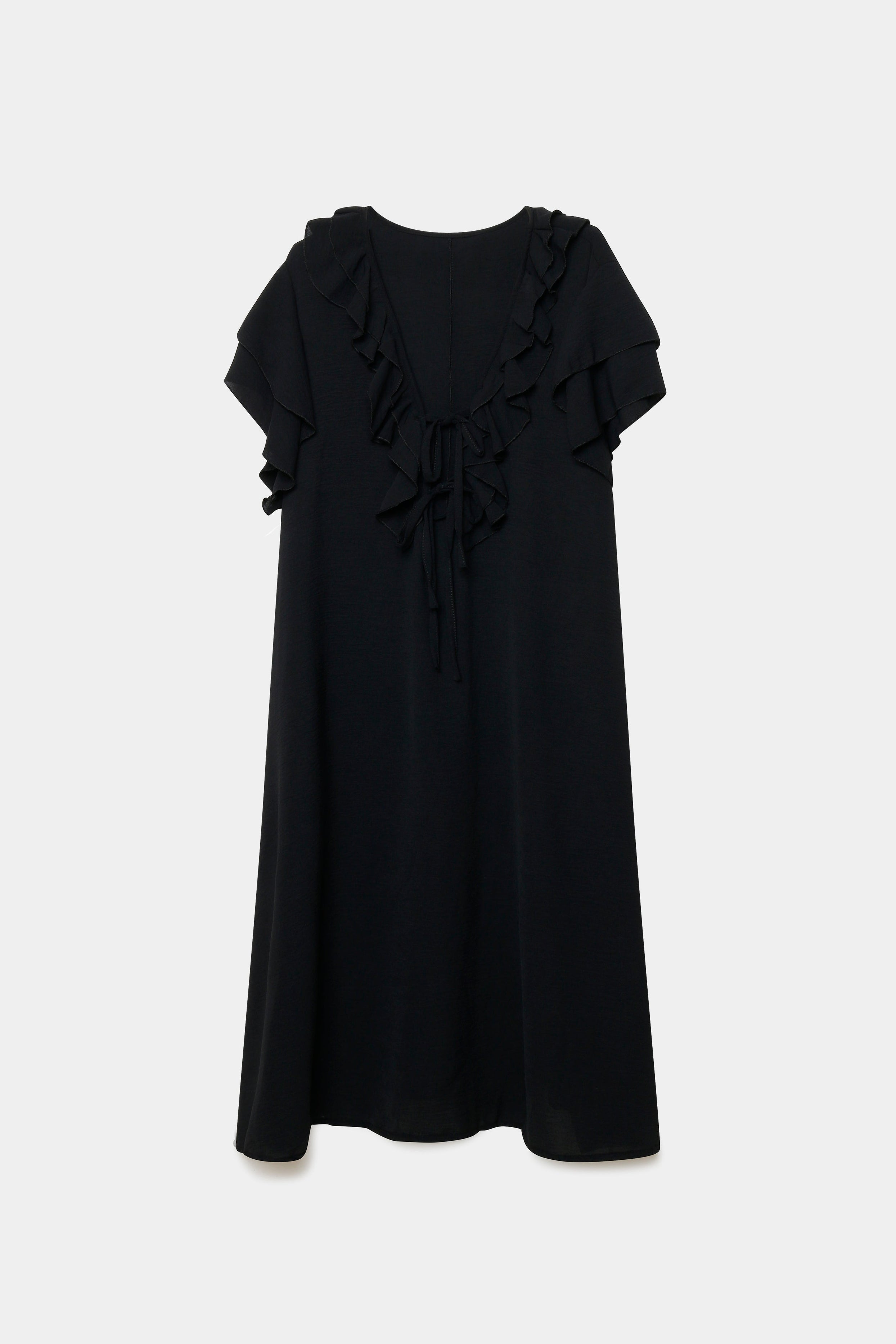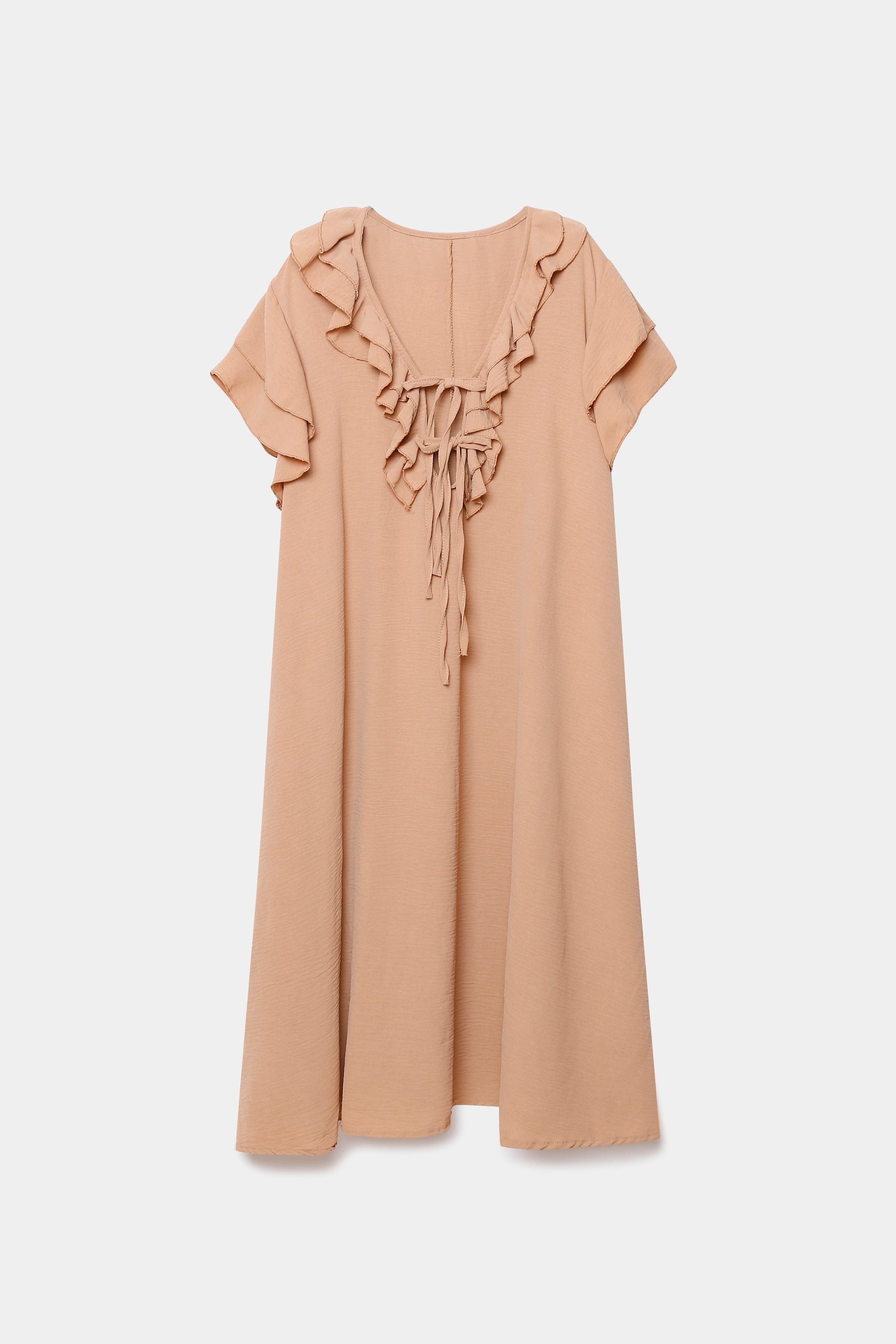 Tejido fluido. Manga corta. Cuello pico y cierre lazo. Detalle volantes. Talla única. Sisa a sisa 65cm. Largo 125cm. Desde una 46 hasta una 54.