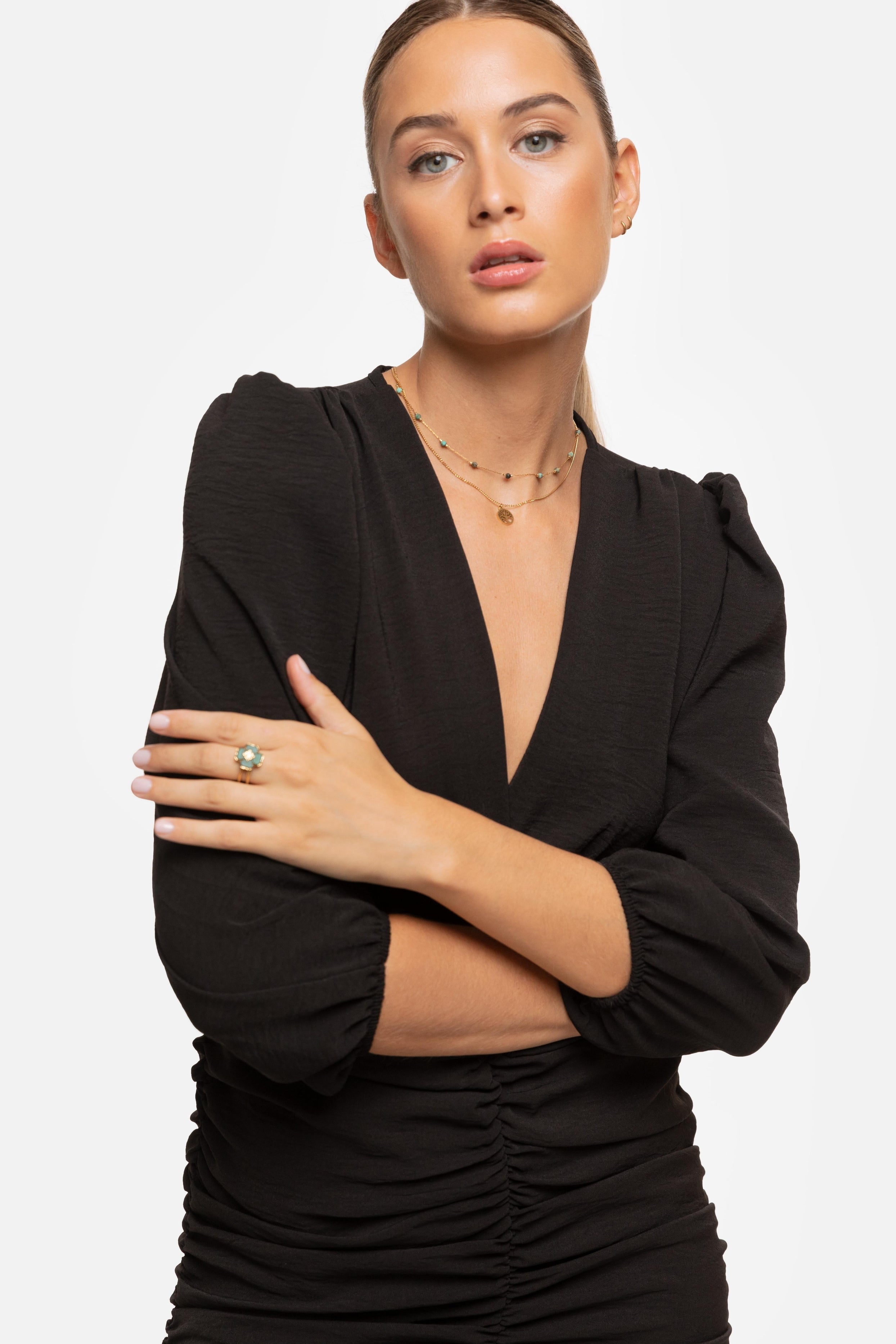 Vestido corto. Tejido fluido. Diseño ajustado. Escote de pico. Manga larga. Diseño drapeado. Talla modelo: S. Altura modelo: 1,66 m.
