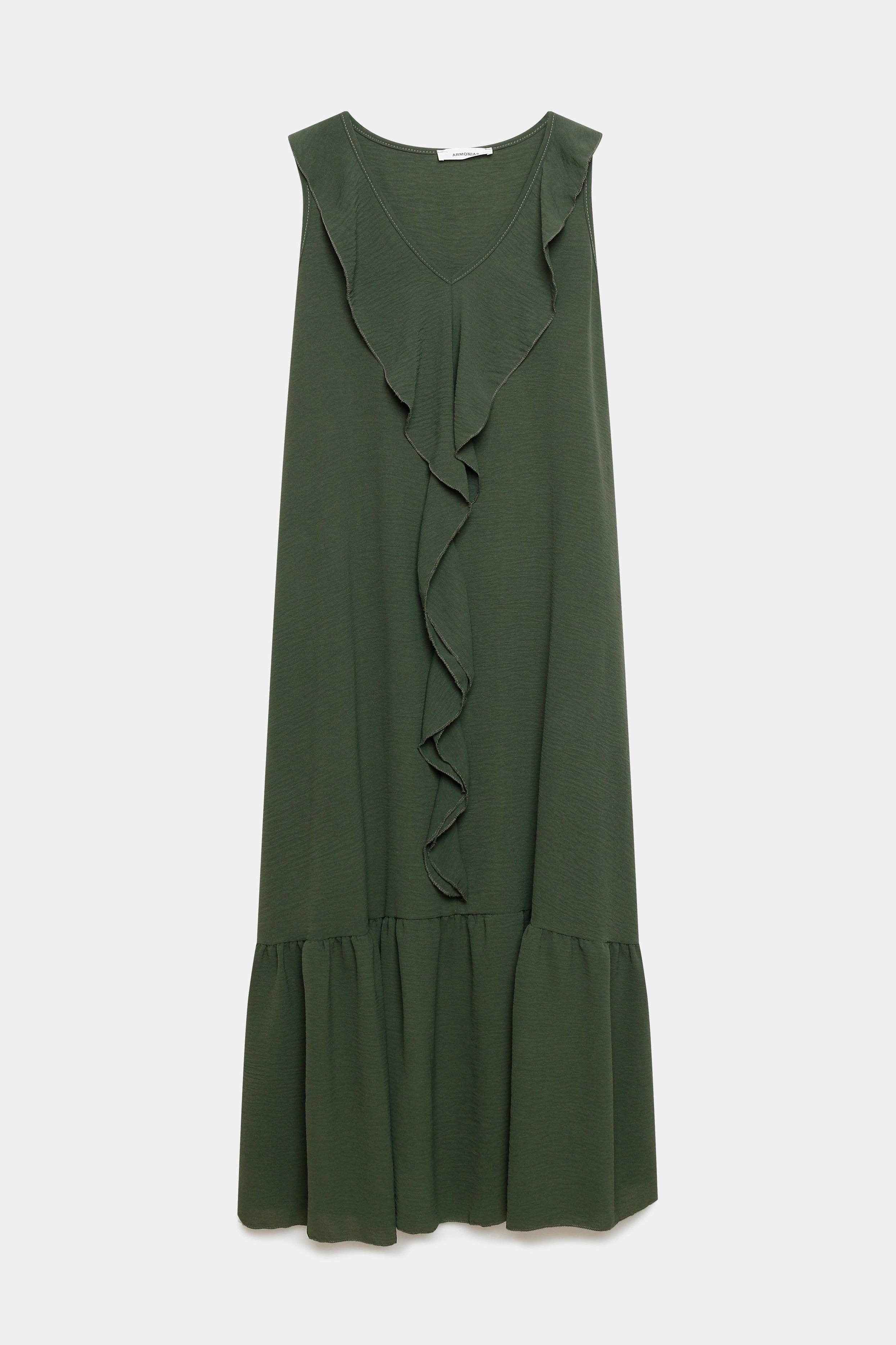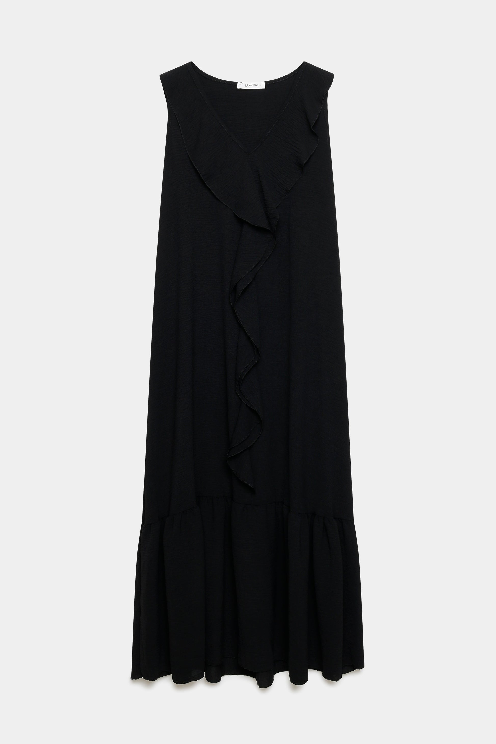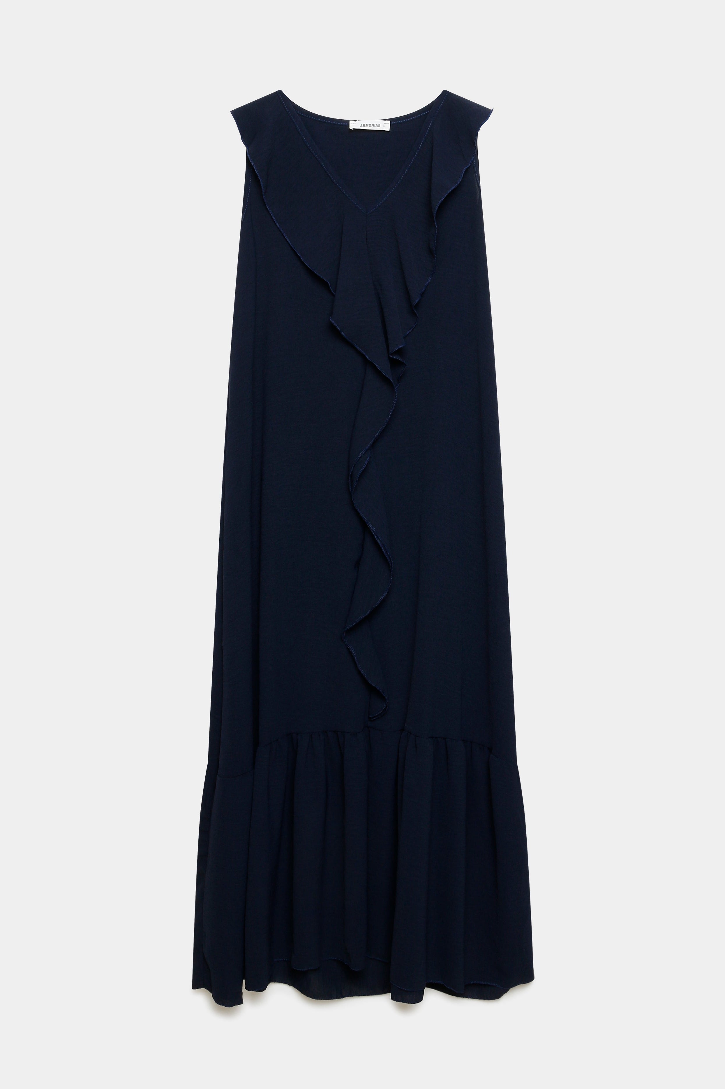Tejido fluido. Escote pico. Manga sisa. Detalle volantes. Diseño largo.