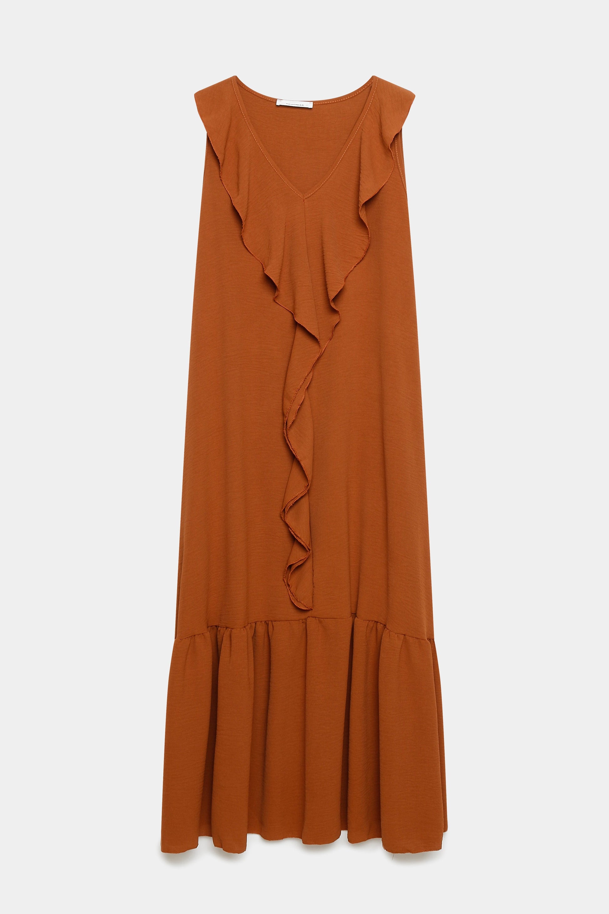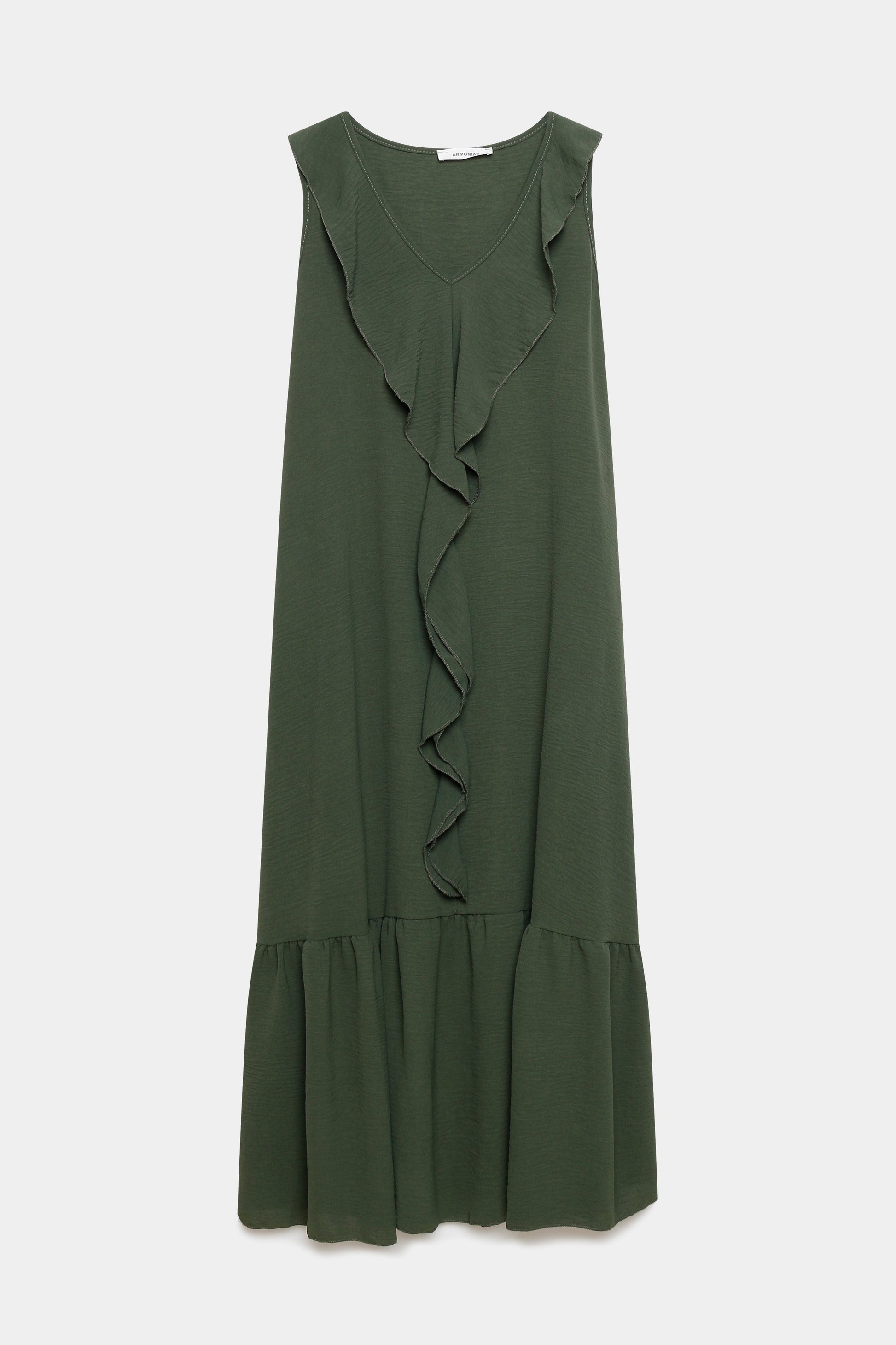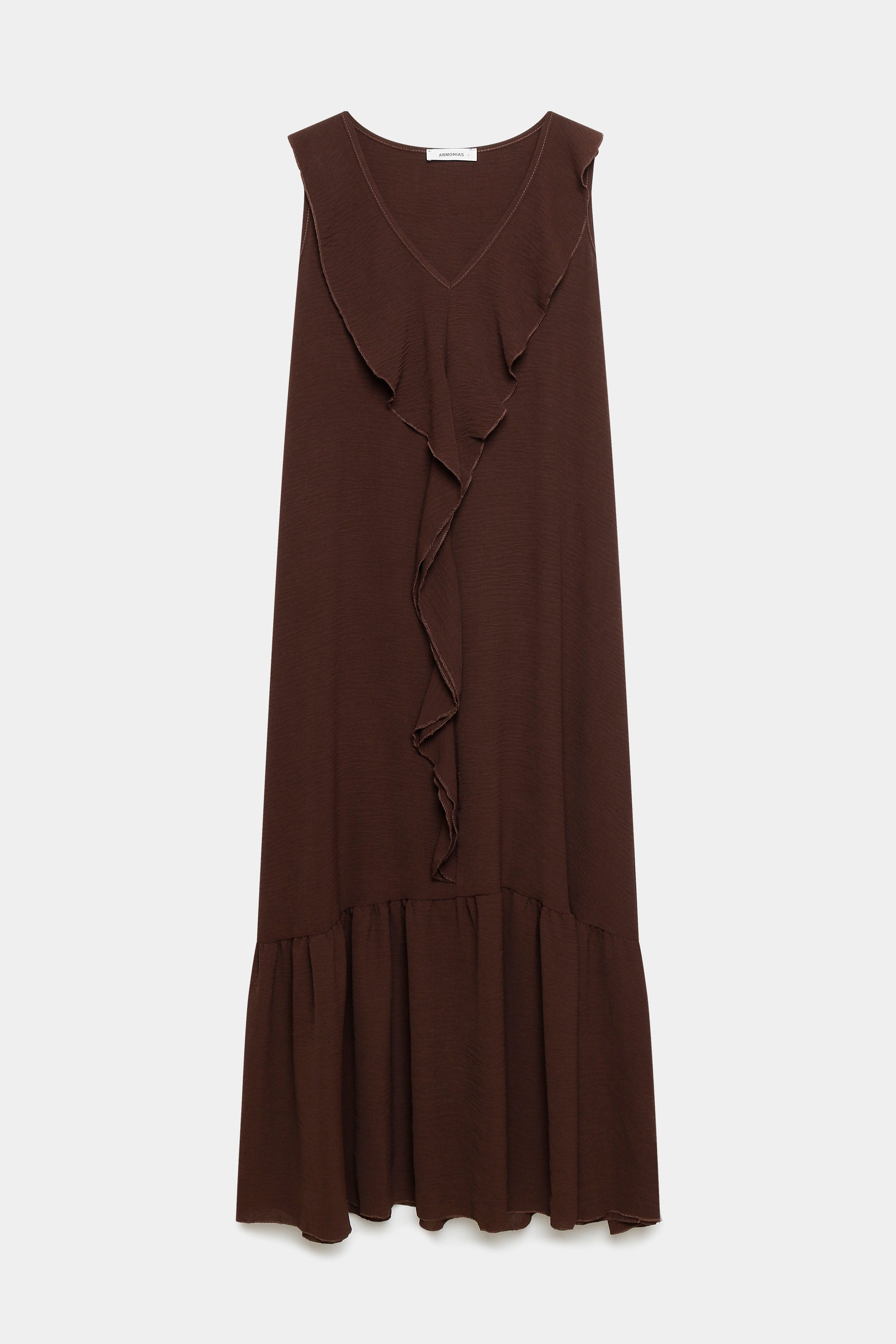 Tejido fluido. Escote pico. Manga sisa. Detalle volantes. Diseño largo.