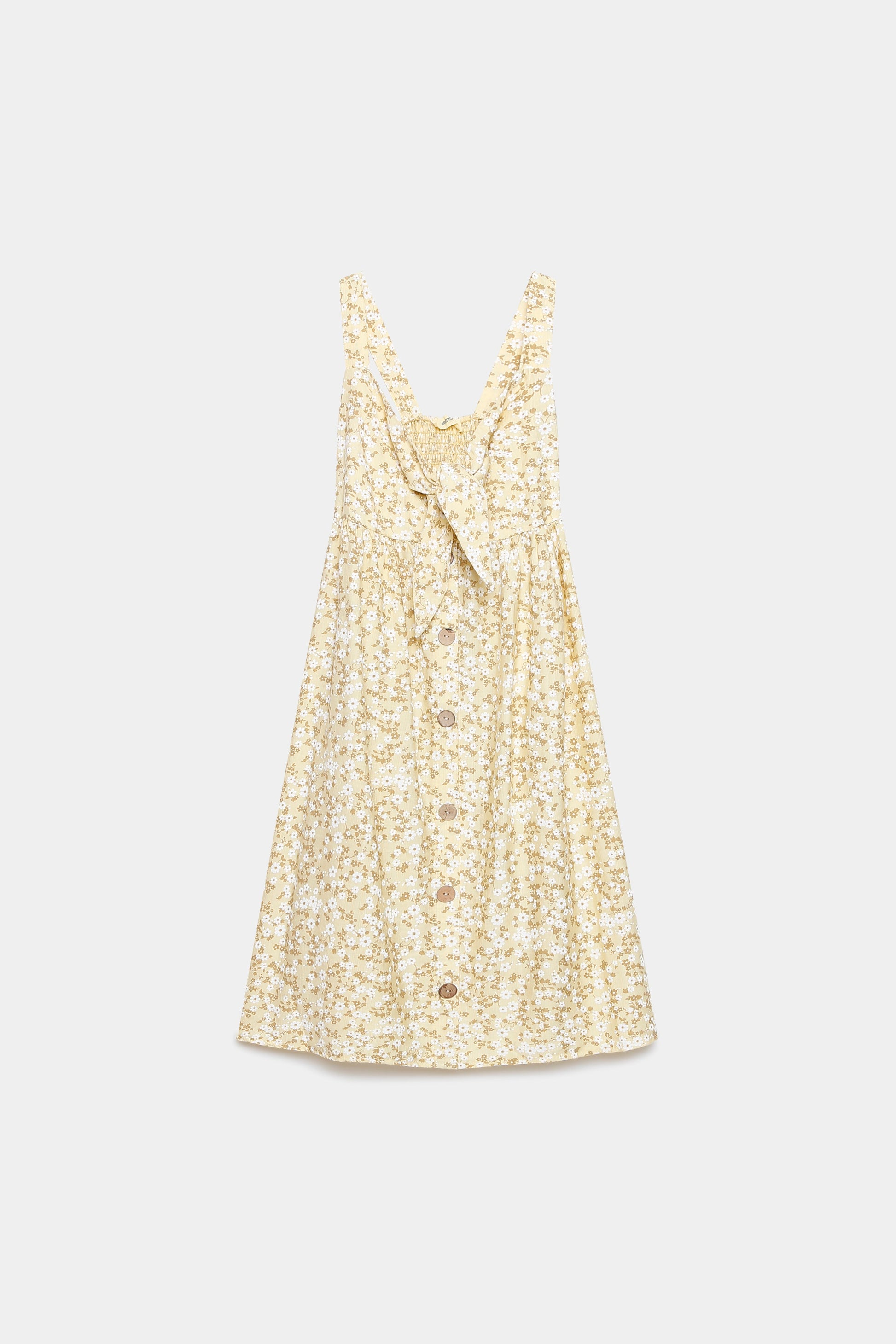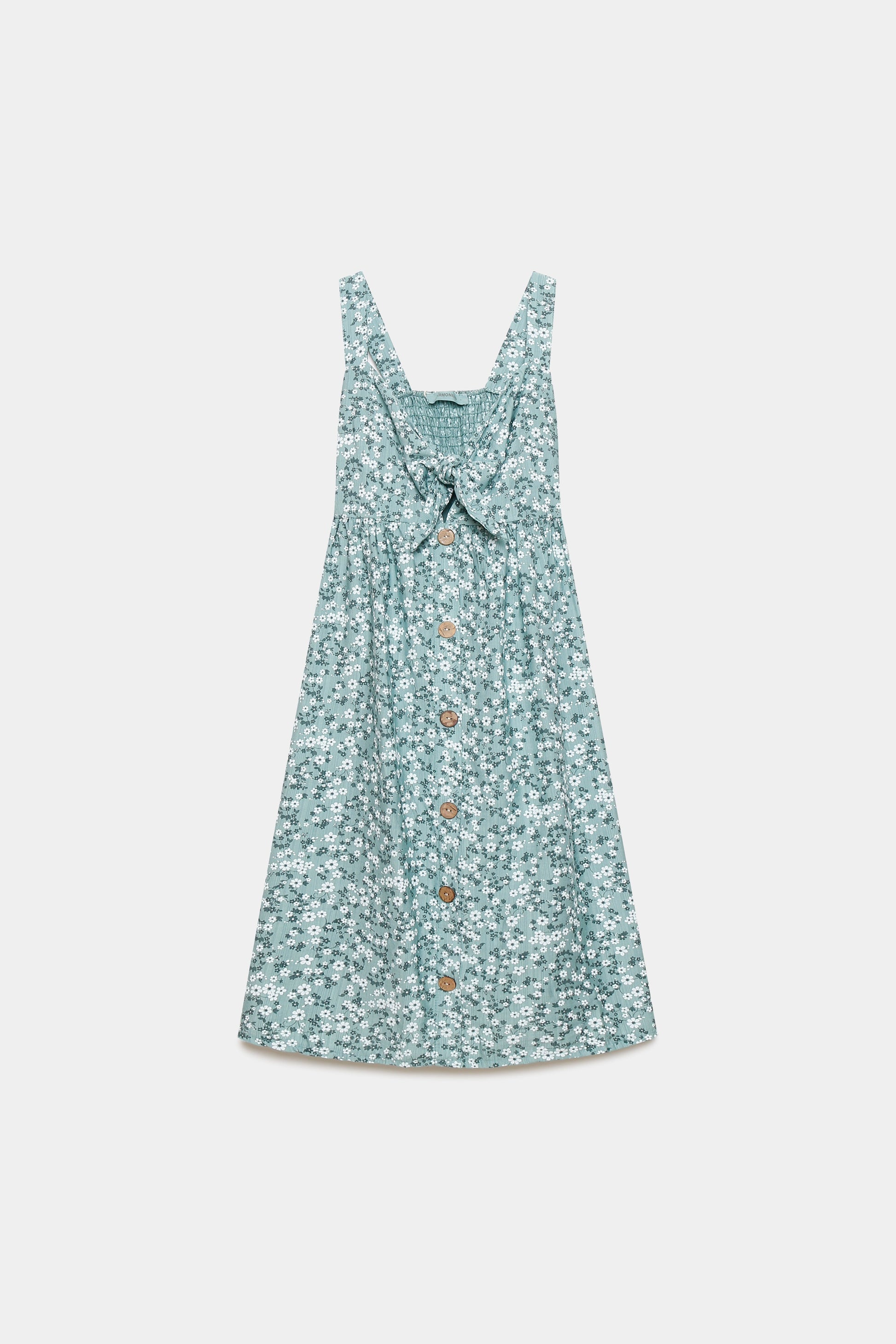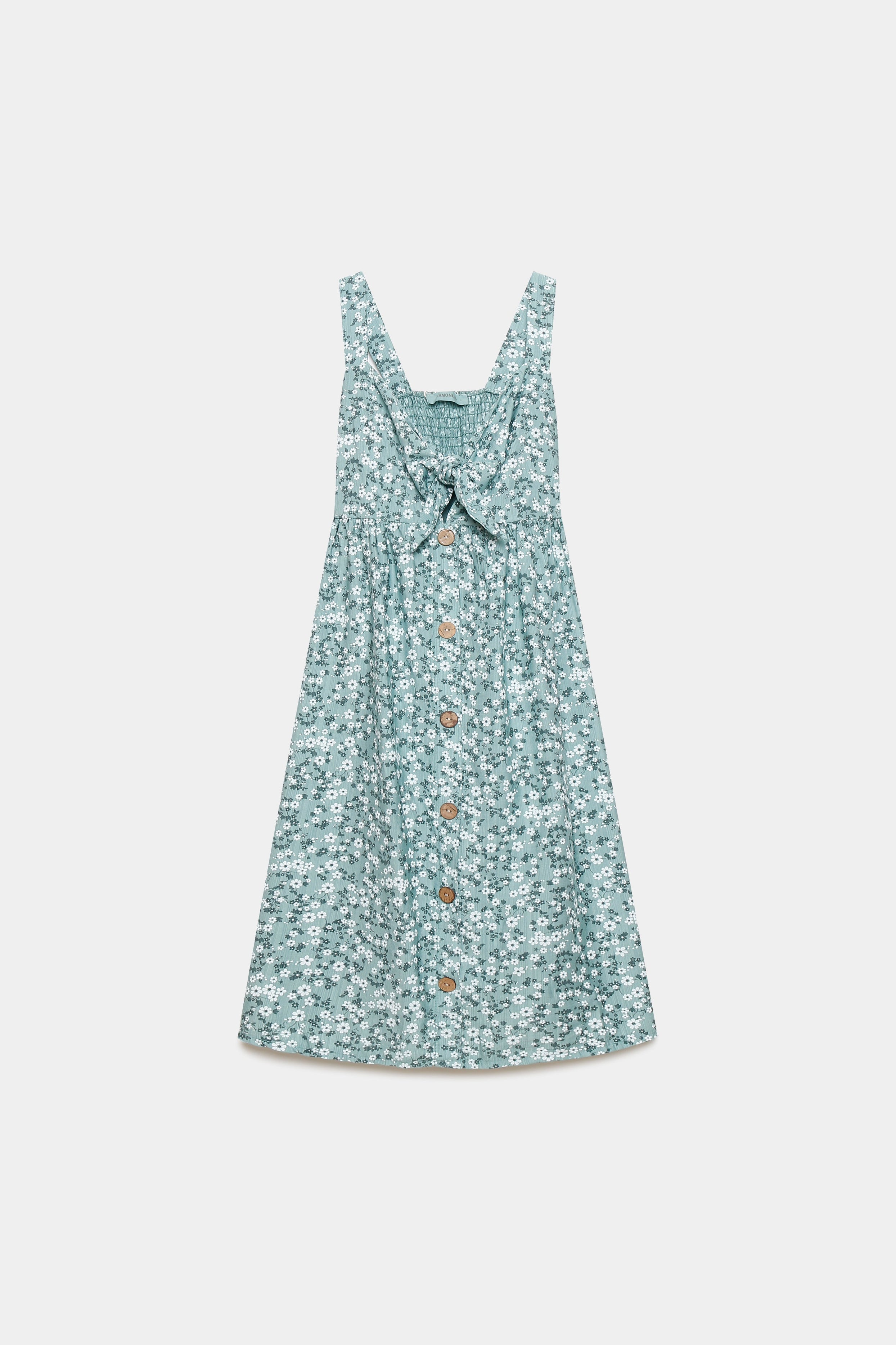 Tejido fluido. Diseño estampado. Tirantes anchos. Nudo en el pecho. Elástico en la espalda. Botones decorativos.