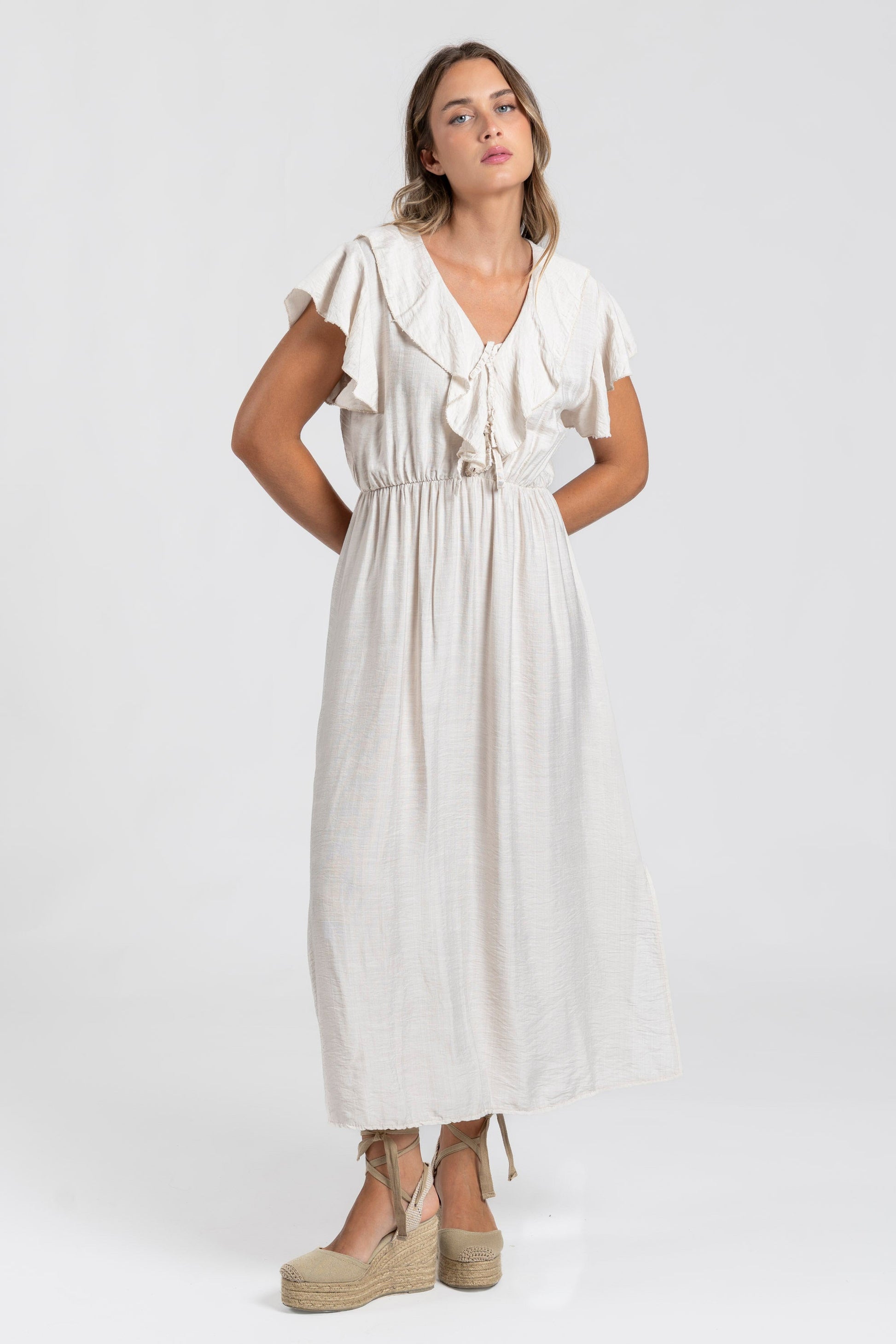Tejido fluido. Cuello pico. Manga corta. Diseño midi. Cintura elástica. Talla S. Altura modelo: 1.66 m