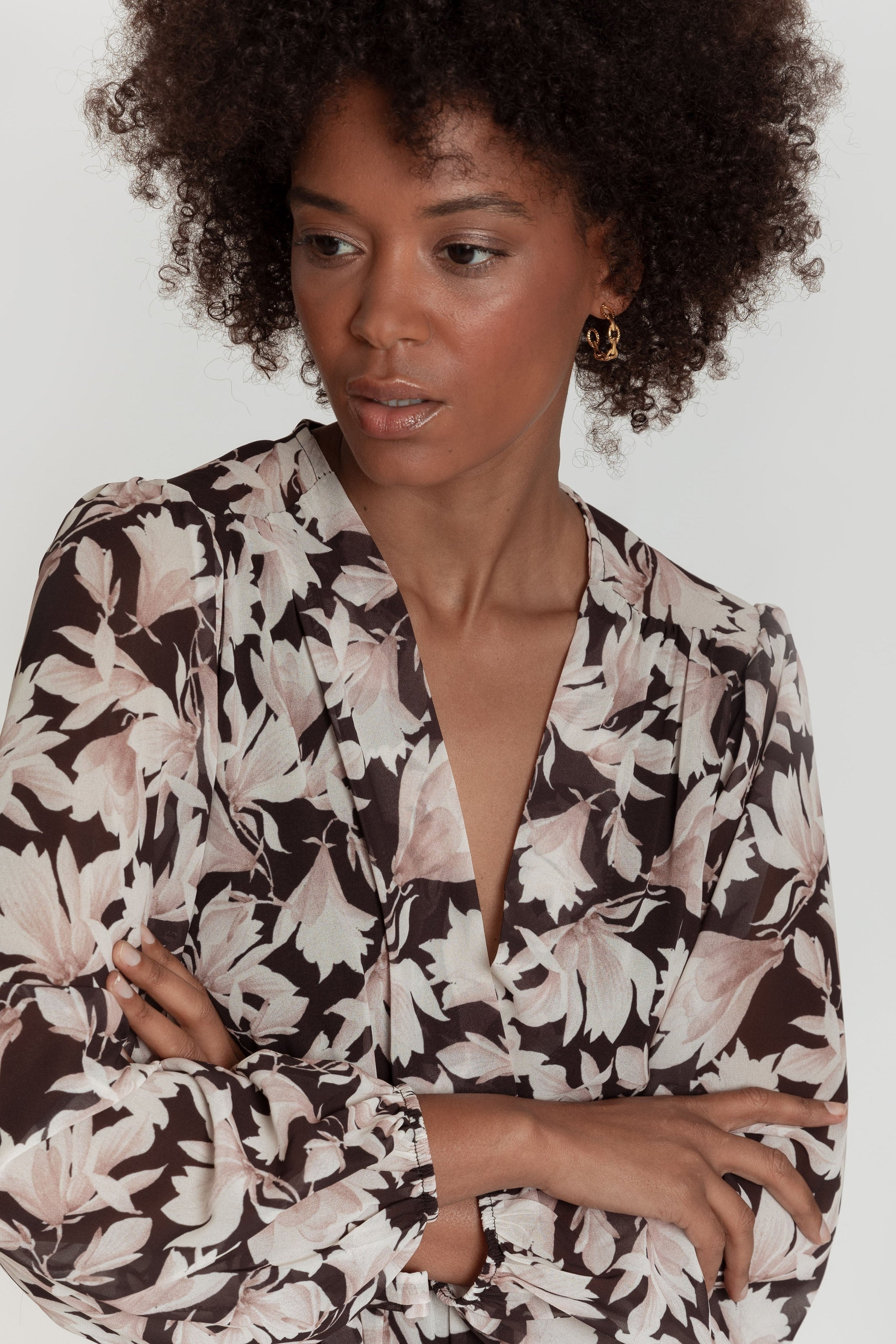 Tejido gasa. Diseño largo. Diseño evasé. Diseño estampado. Cuello pico. Manga larga. Puño elástico. Cintura elástica. Cinturón a contraste. Forrado. Talla modelo: S. Altura modelo 1,65 m.