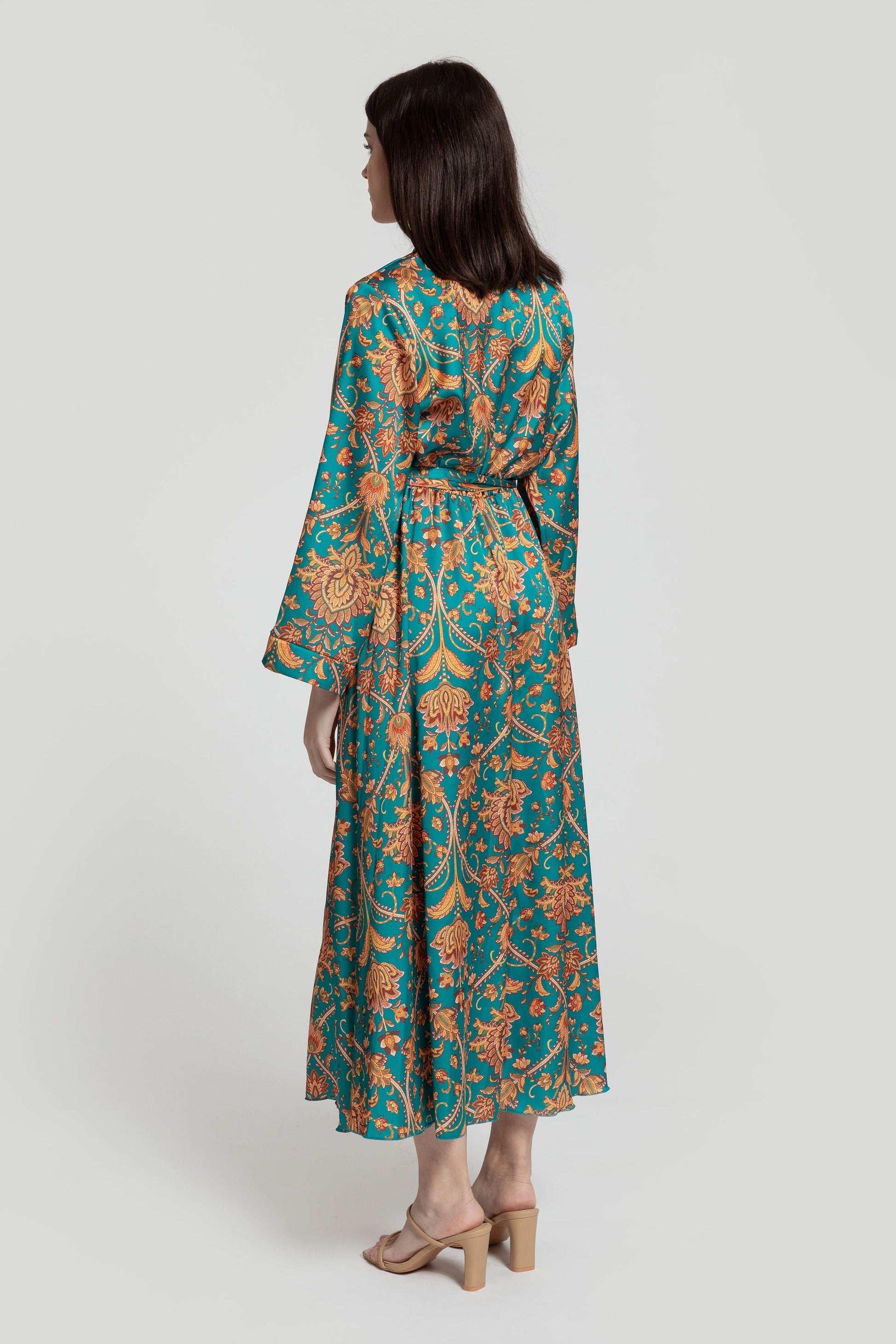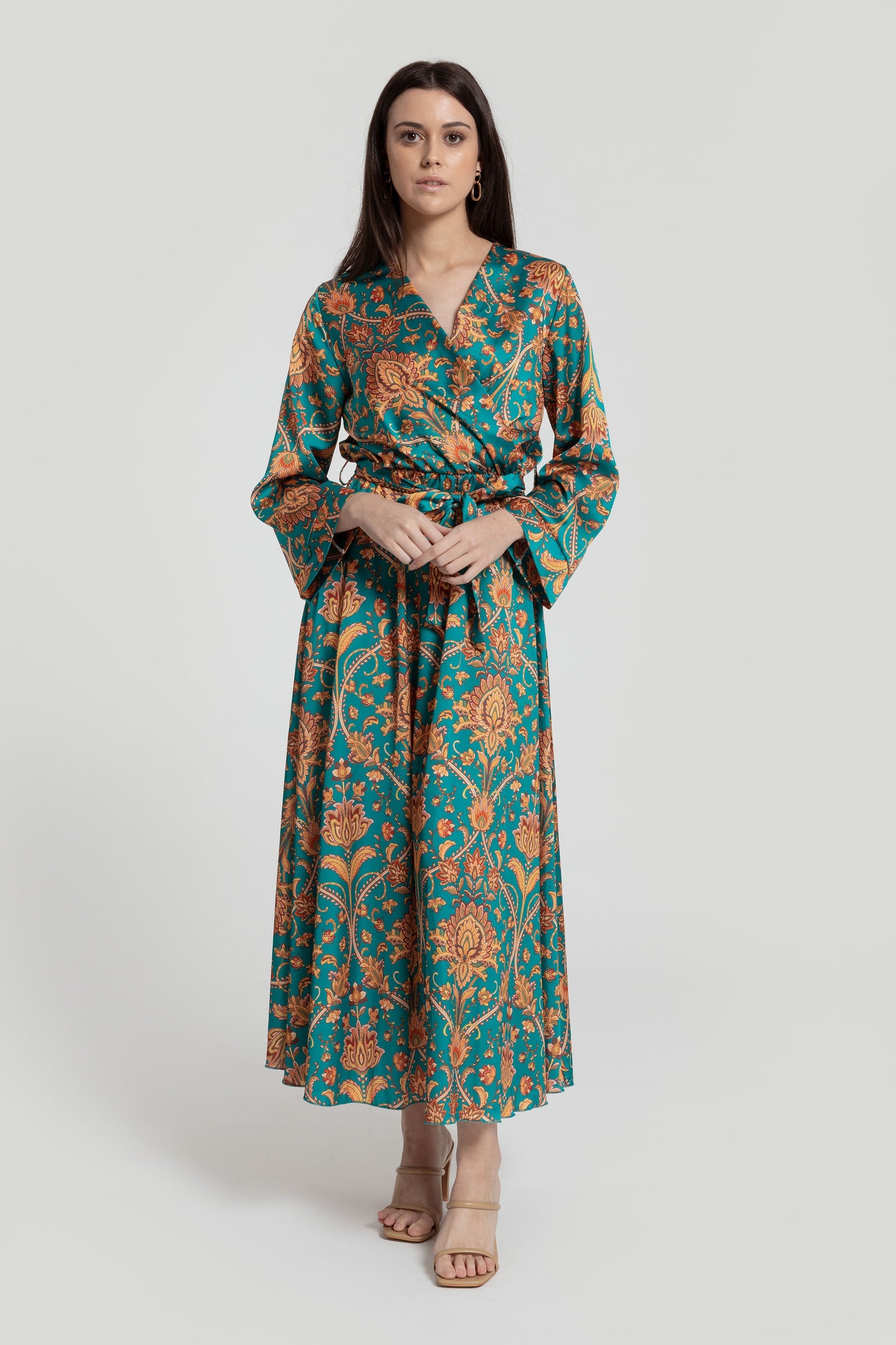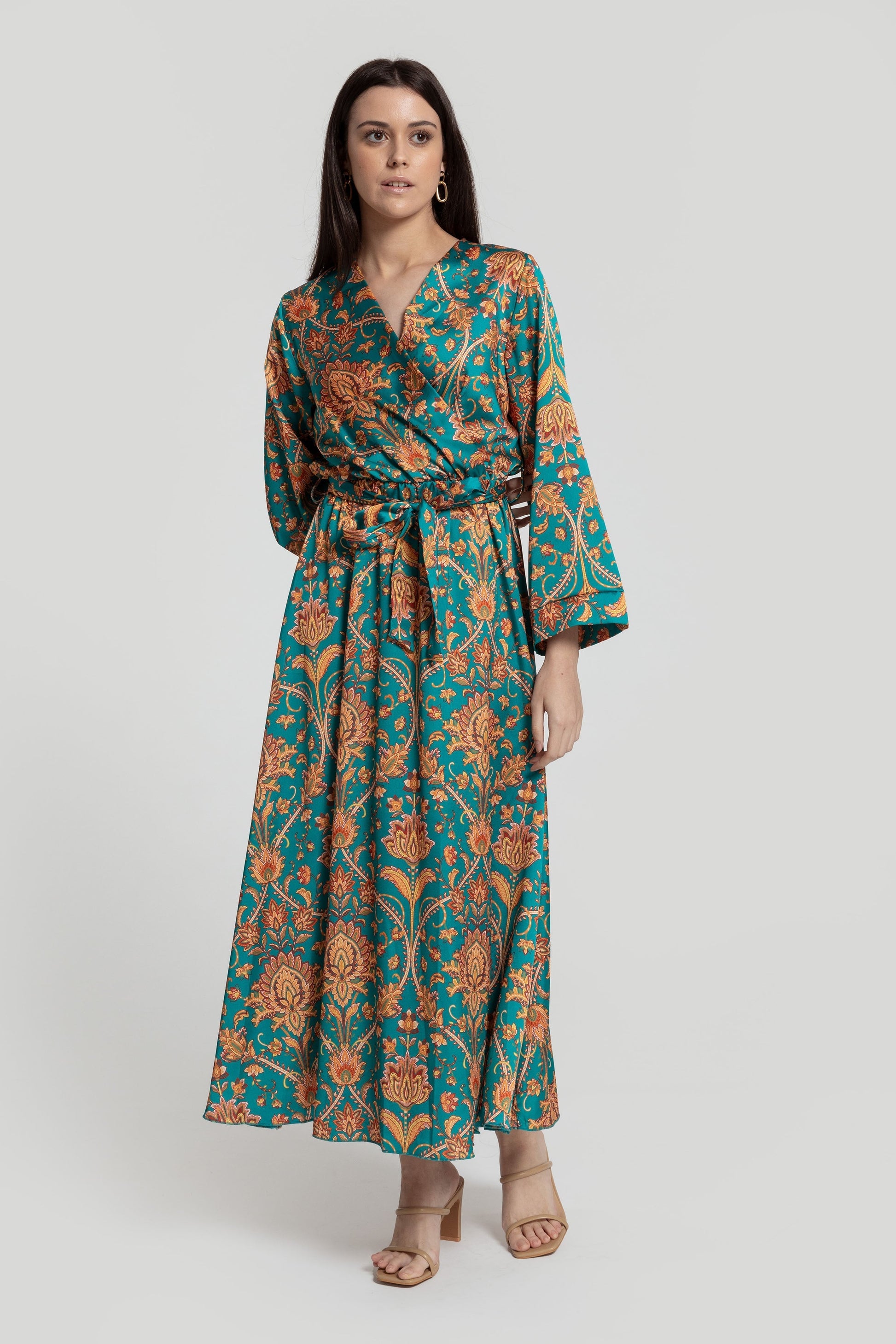 Vestido fluido con escote pico y manga larga ancha. Cintura elástica. Cinturón lazada de mismo tejido.