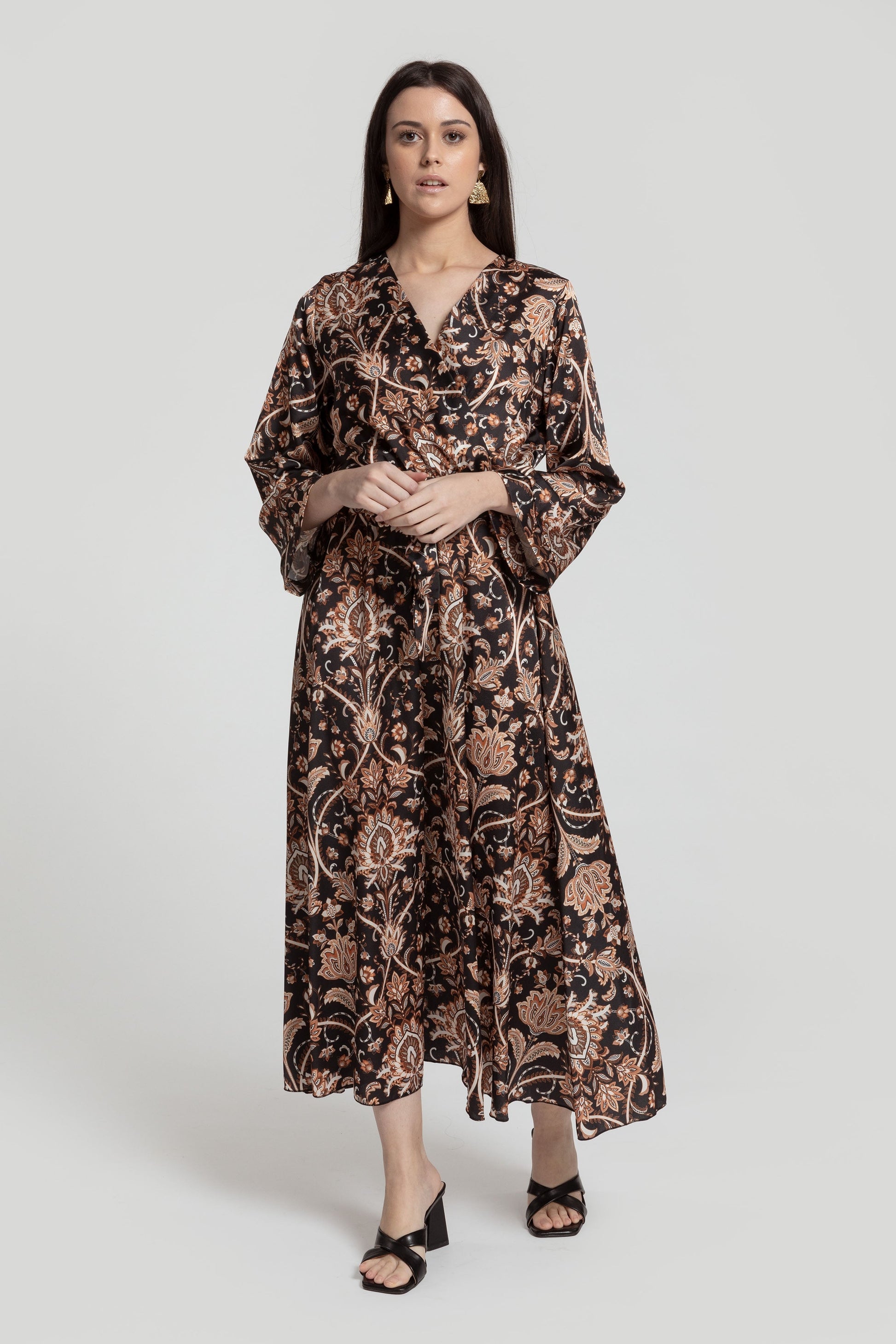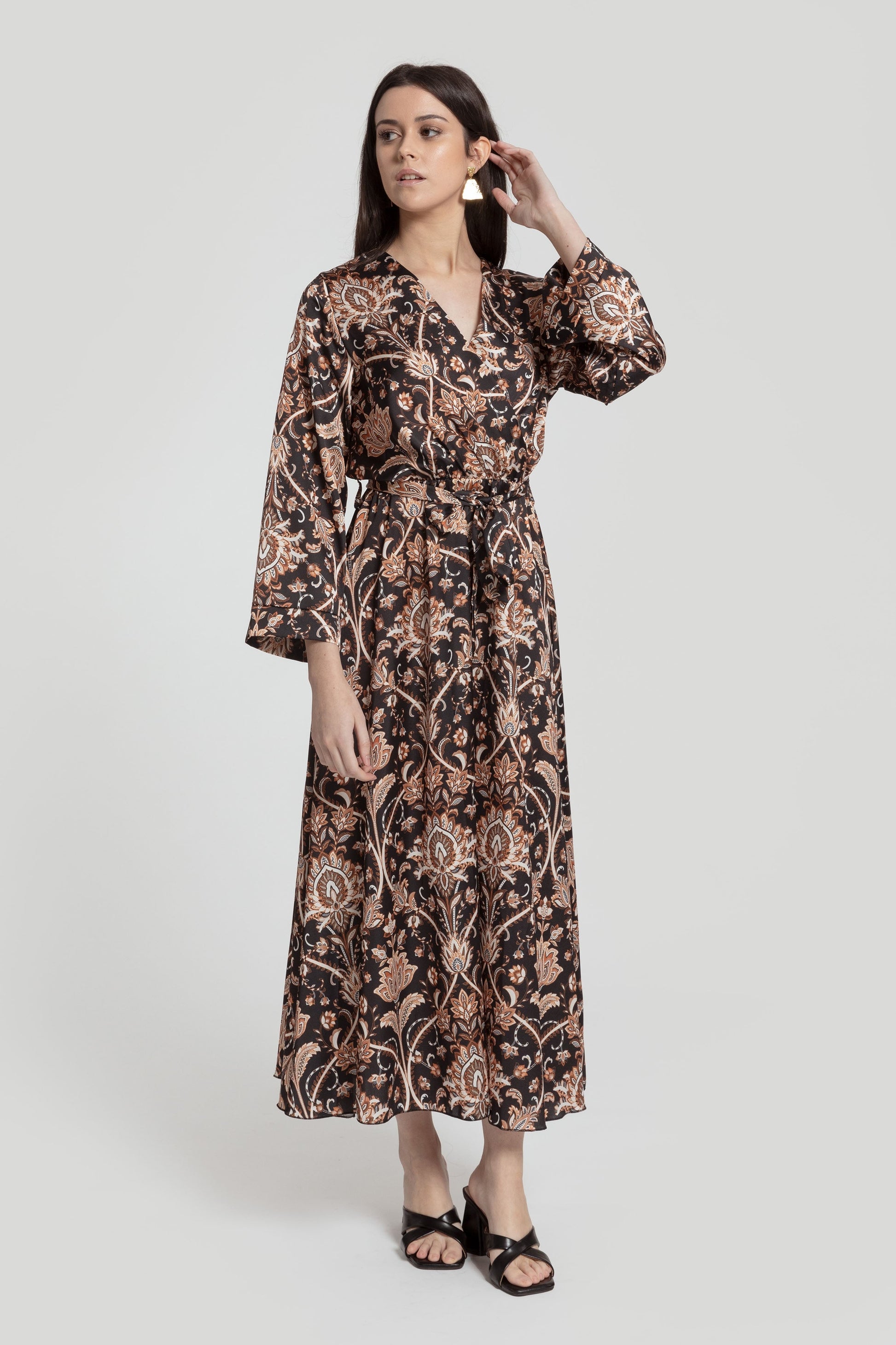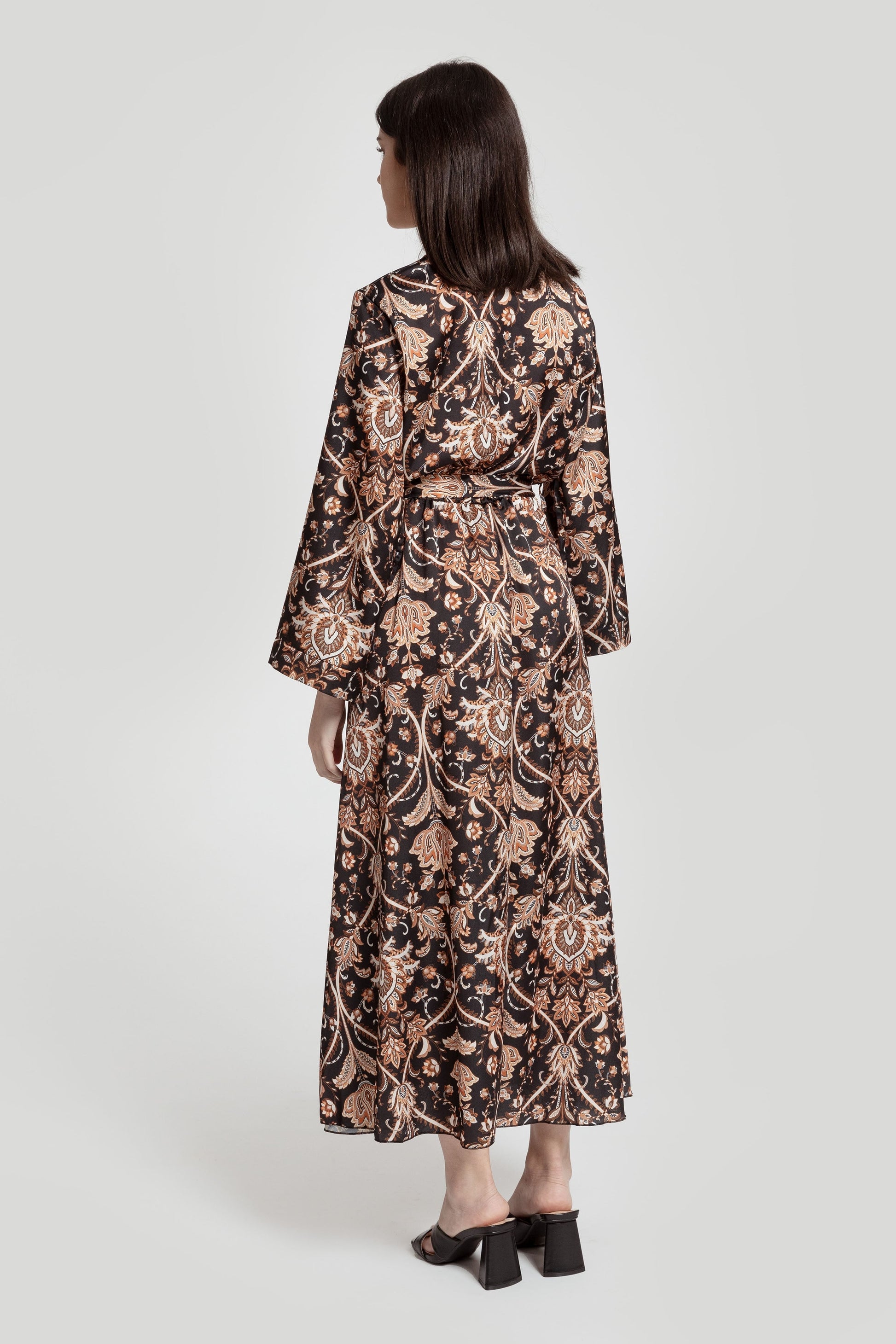 Vestido fluido con escote pico y manga larga ancha. Cintura elástica. Cinturón lazada de mismo tejido.