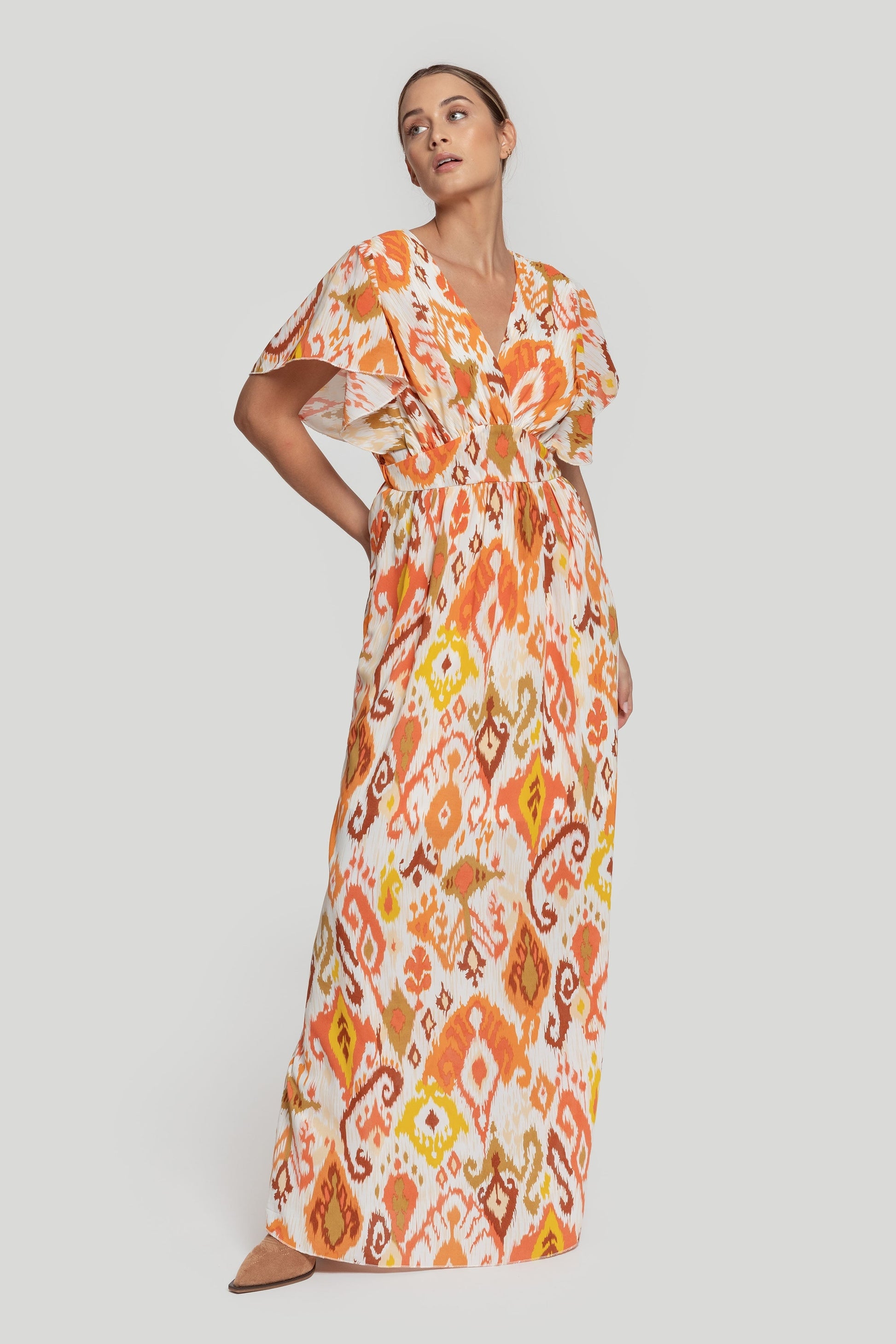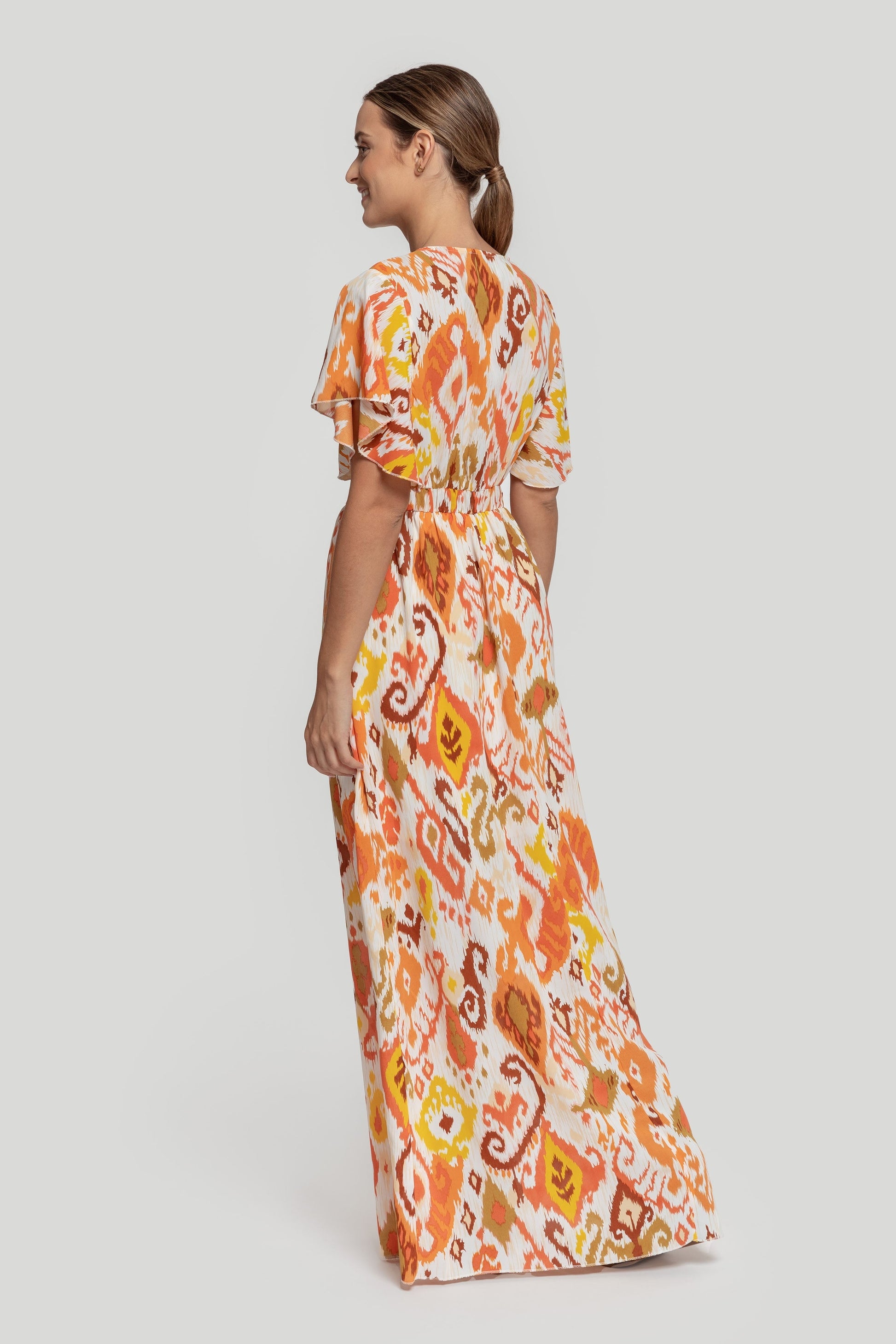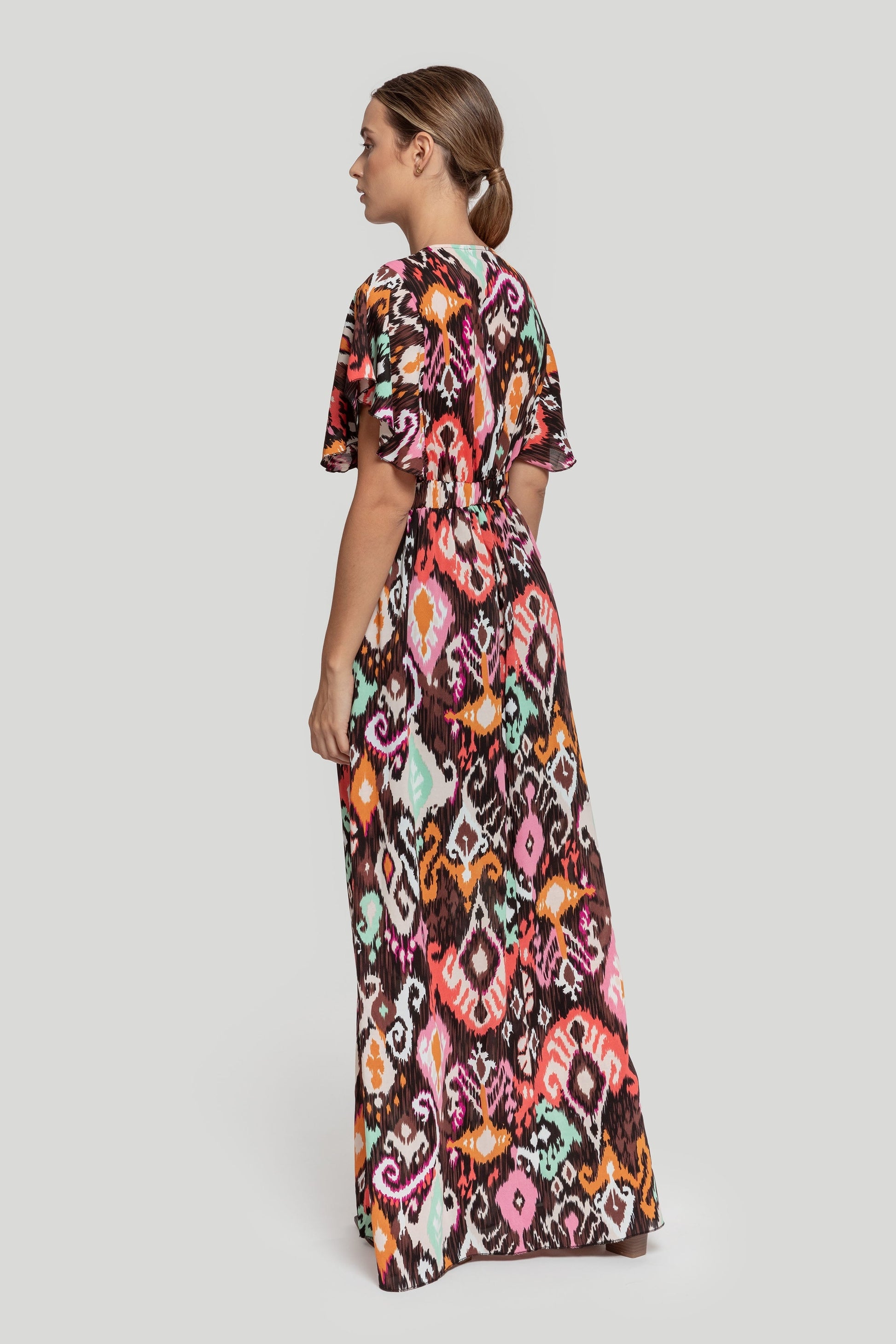 Vestido largo. Tejido de acabado suave. Diseño estampado. Diseño evasé. Cuello pico. Manga corta. Costura elástica bajo el pecho. Bajo volante. Cinturón a contraste. Forrado. Talla modelo: S. Altura modelo 1,66 m.