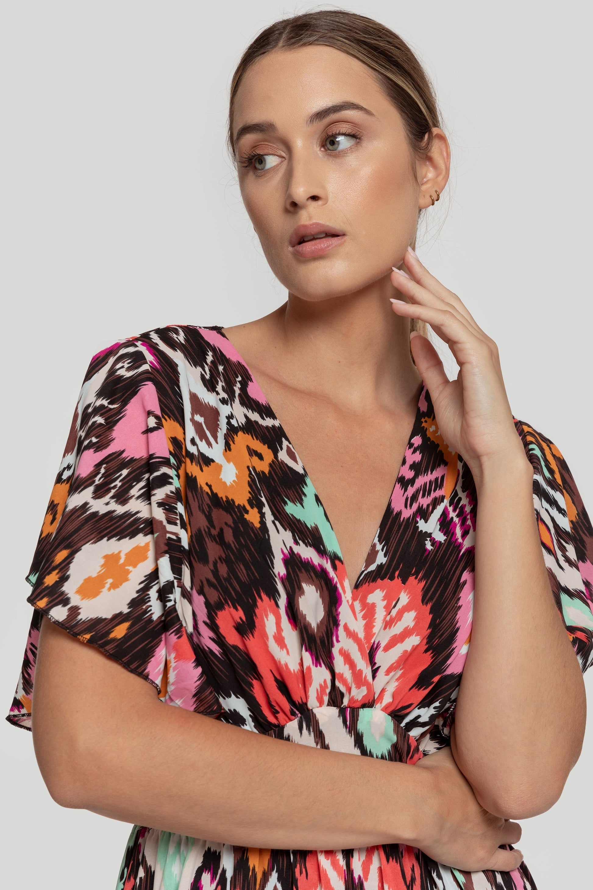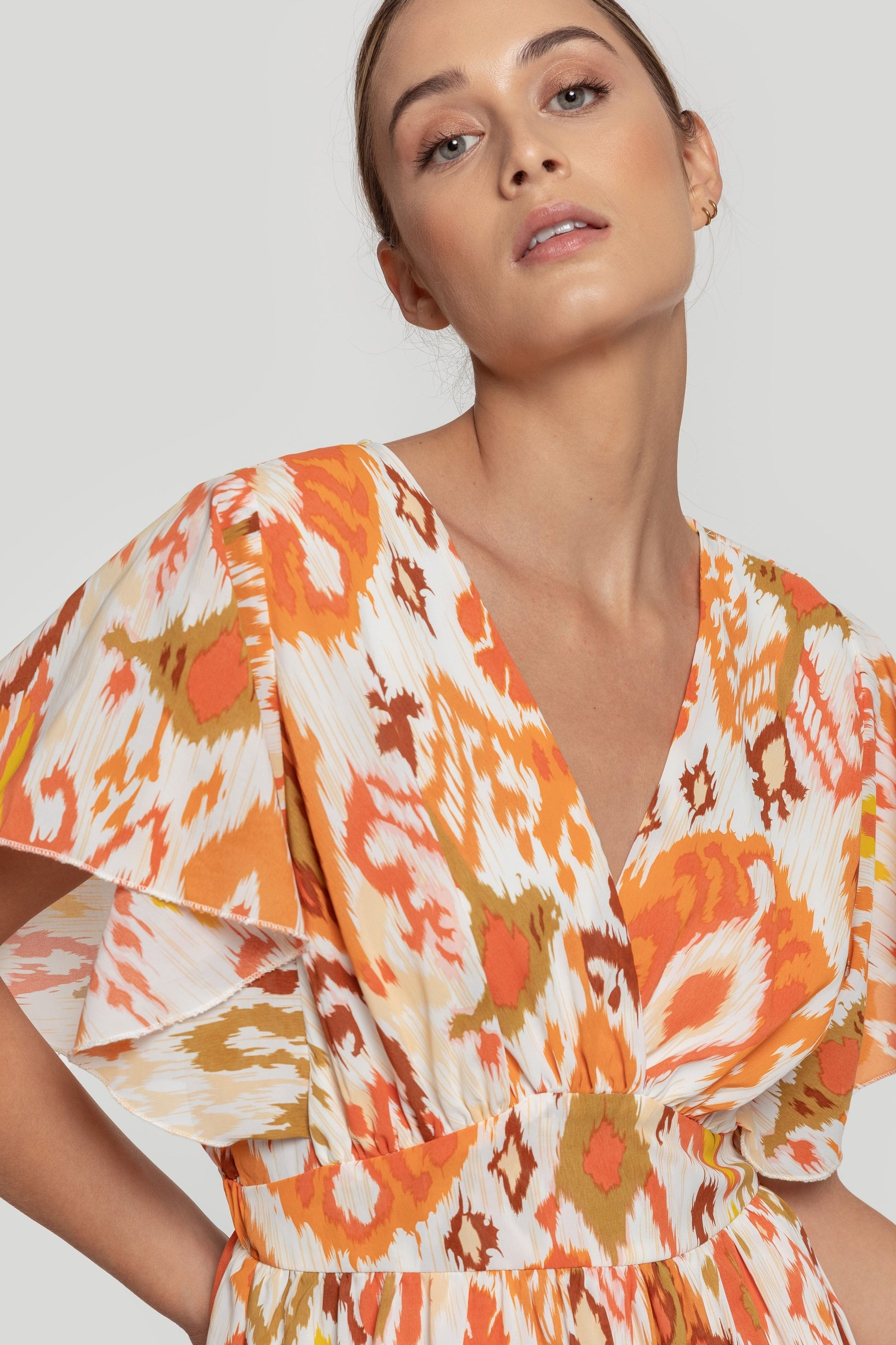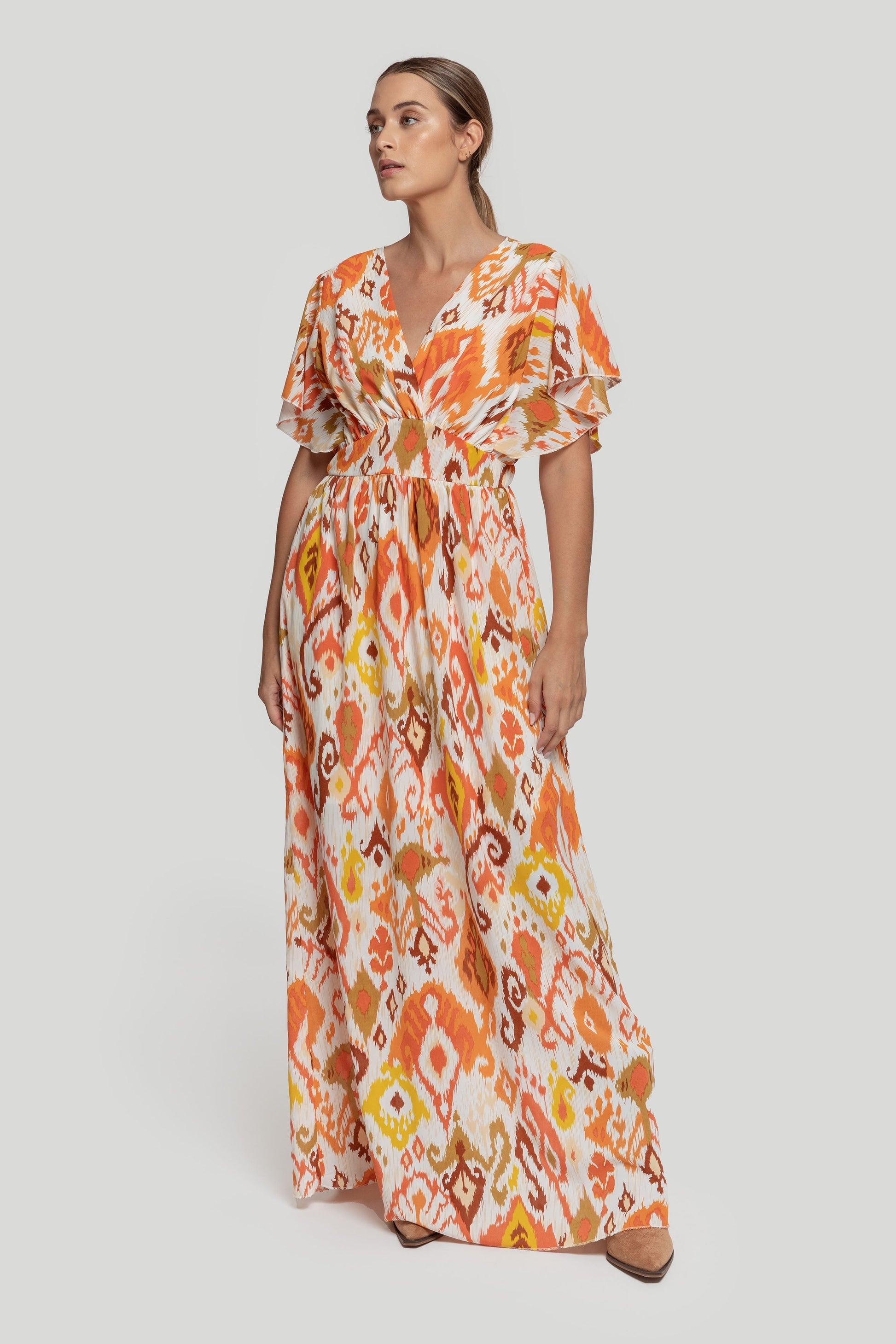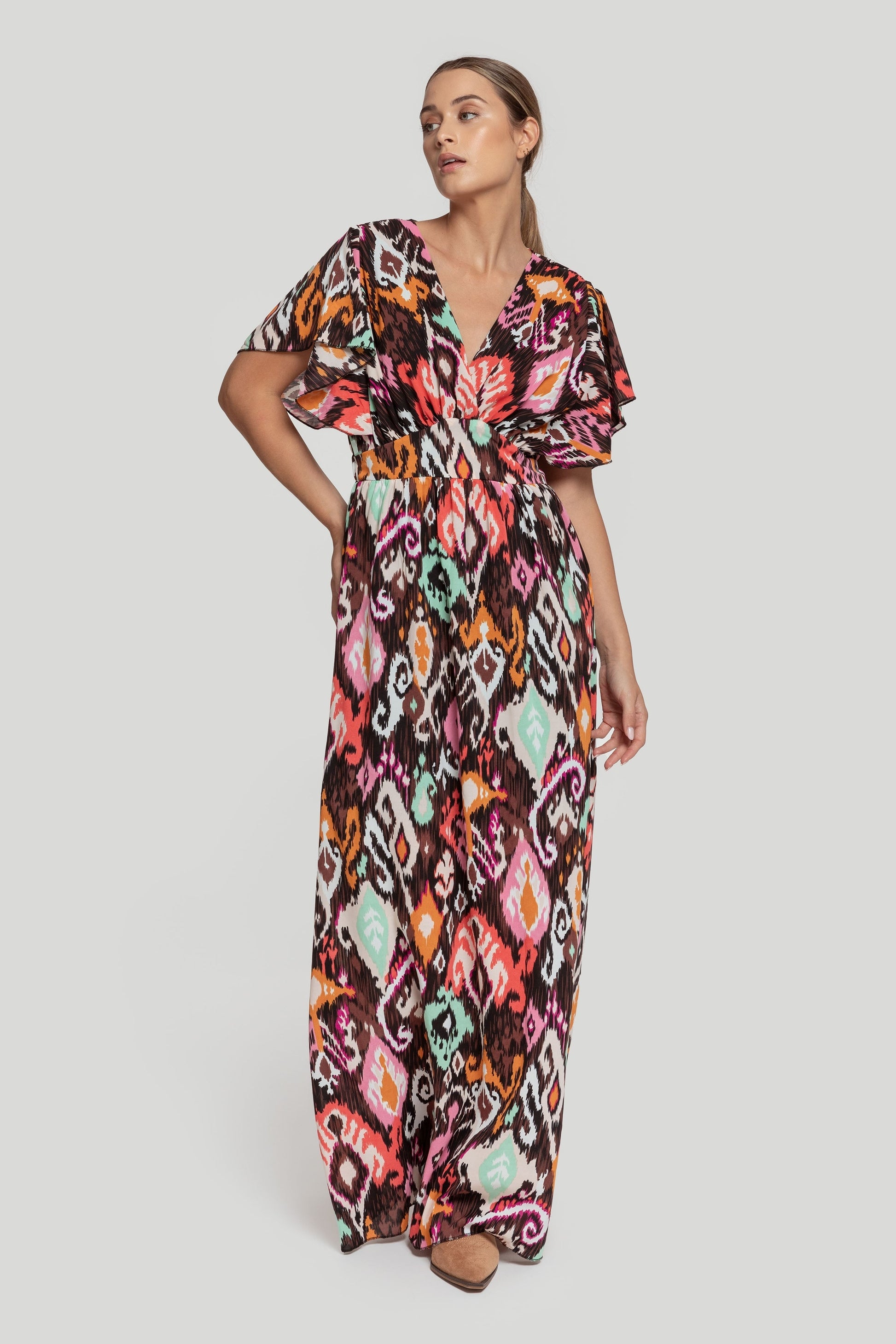 Vestido largo. Tejido de acabado suave. Diseño estampado. Diseño evasé. Cuello pico. Manga corta. Costura elástica bajo el pecho. Bajo volante. Cinturón a contraste. Forrado. Talla modelo: S. Altura modelo 1,66 m.