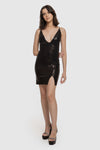 Vestido corto. Tejido de lentejuelas. Diseño ajustado. Escote corazón. Sin mangas. Forro interior. Pequeña abertura en el bajo. Talla modelo: S Altura modelo 1,67 m.