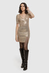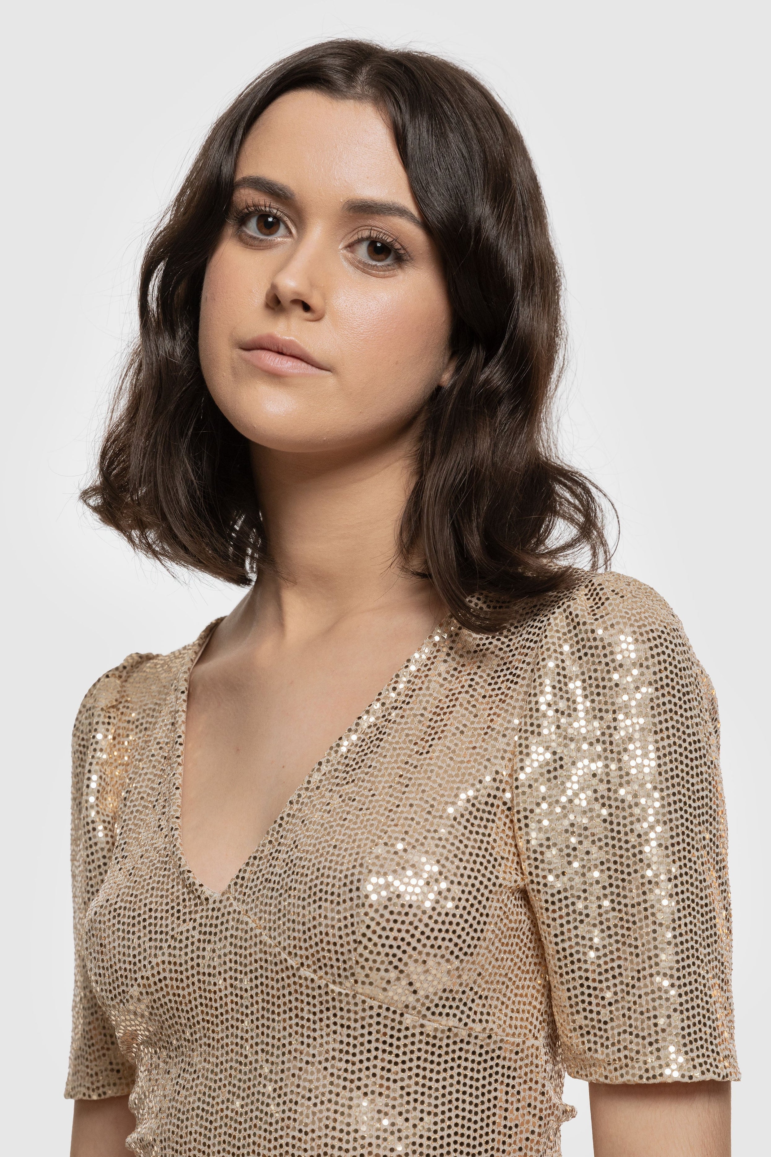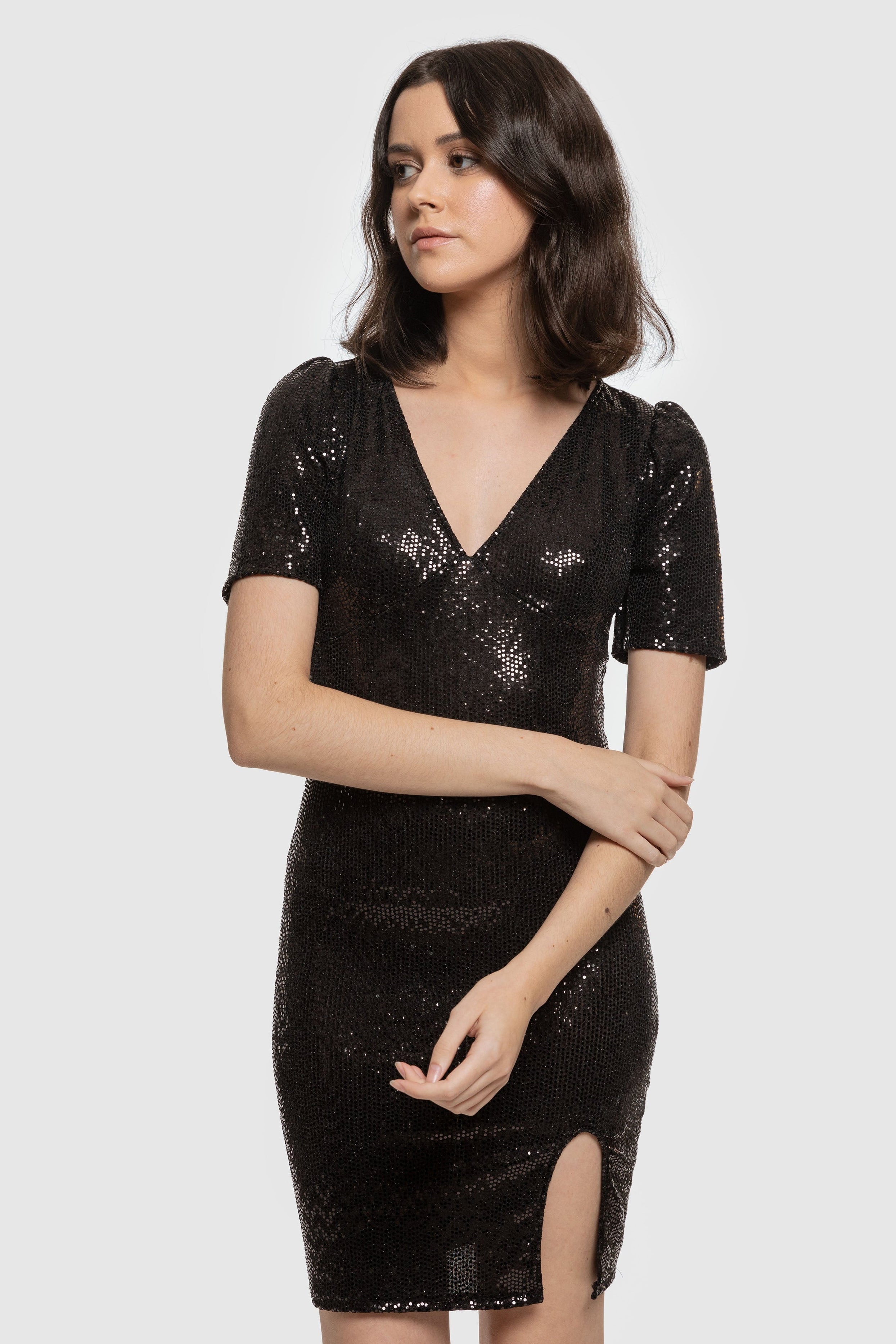 Vestido corto. Tejido de lentejuelas. Diseño evasé. Escote de pico. Manga corta. Forro interior. Talla modelo: S Altura modelo 1,67 m.
