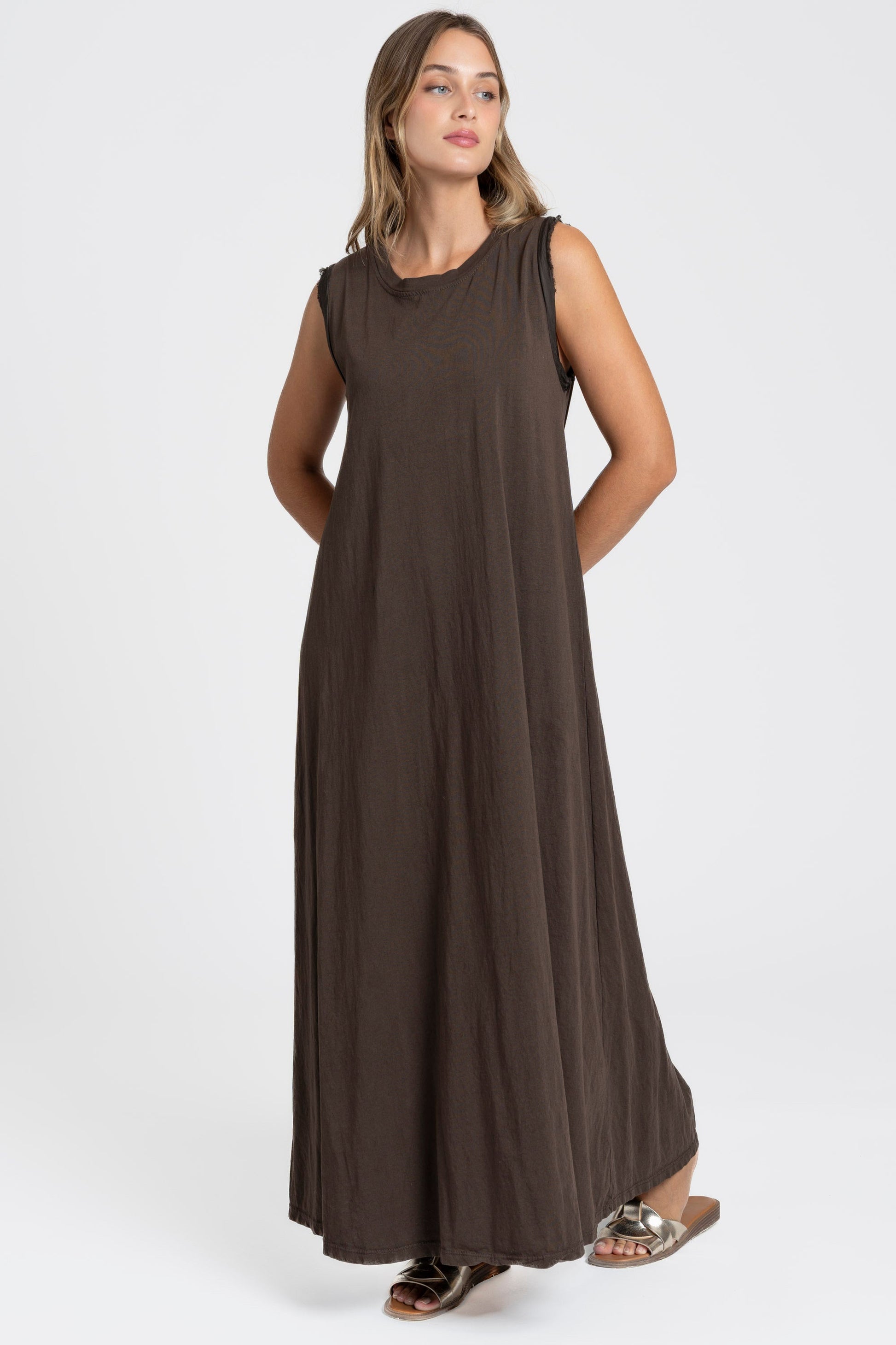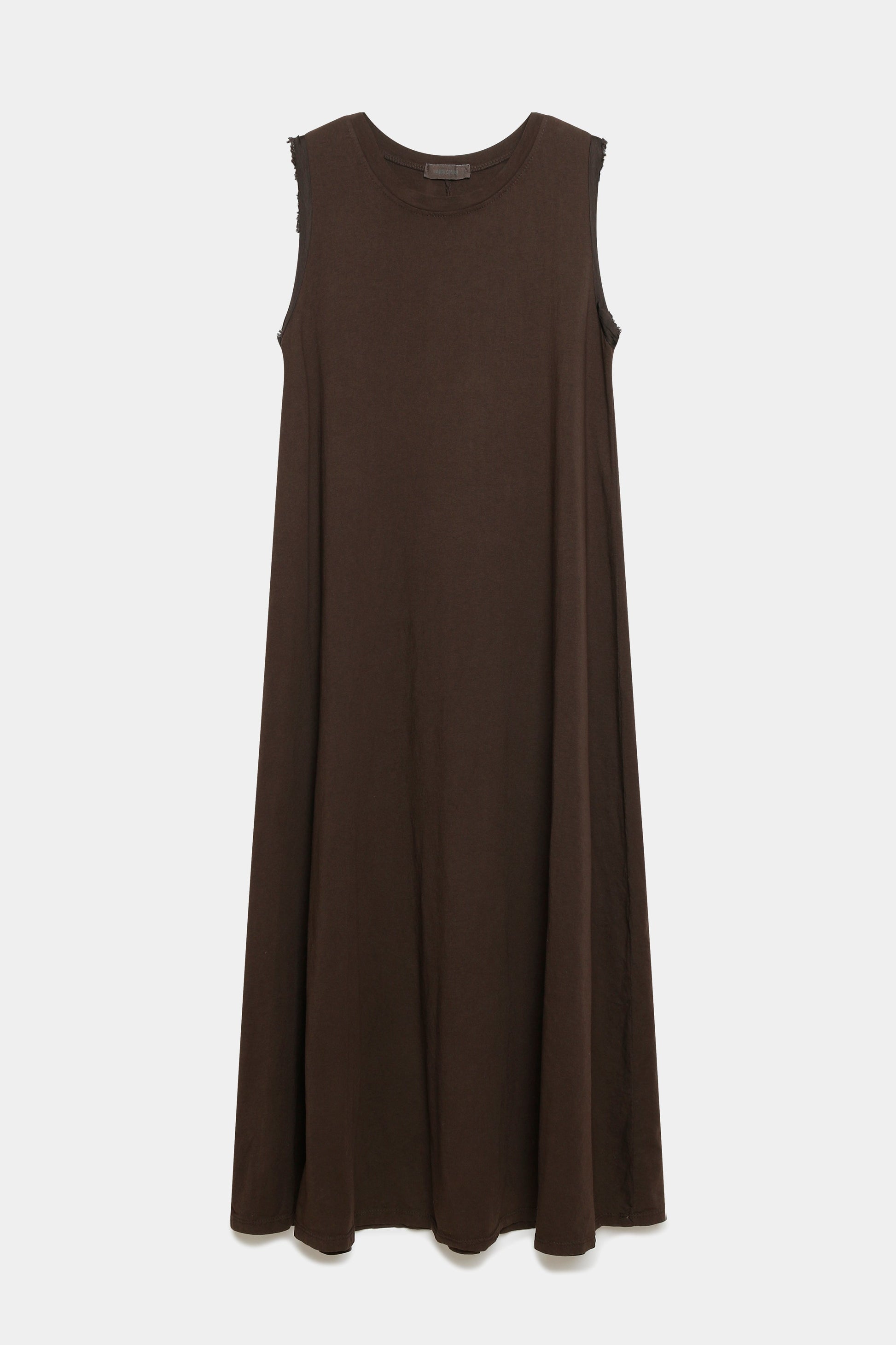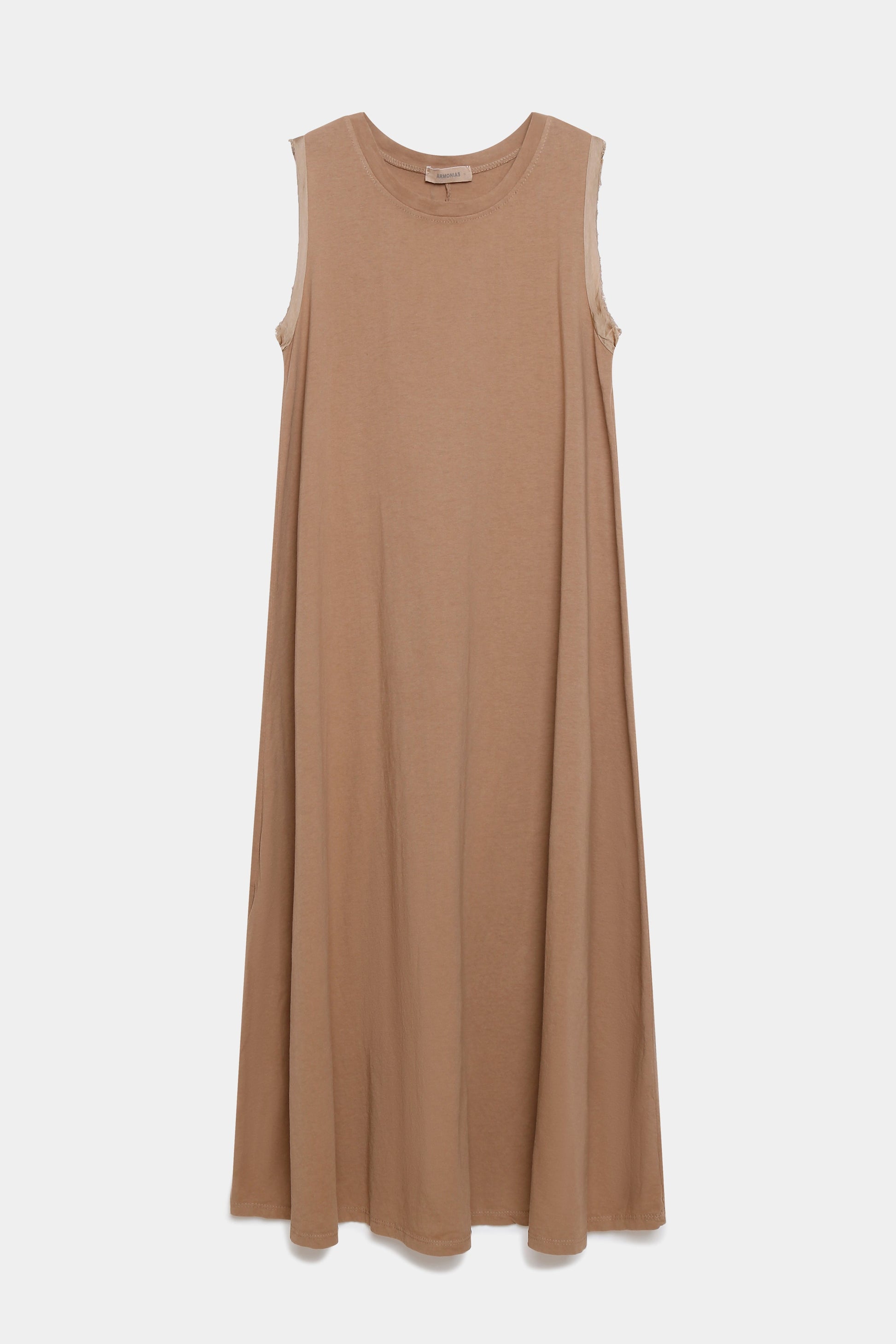 Tejido de algodón. Cuello redondo. Manga sisa. Diseño largo. Tejido raso combinado en la manga.
