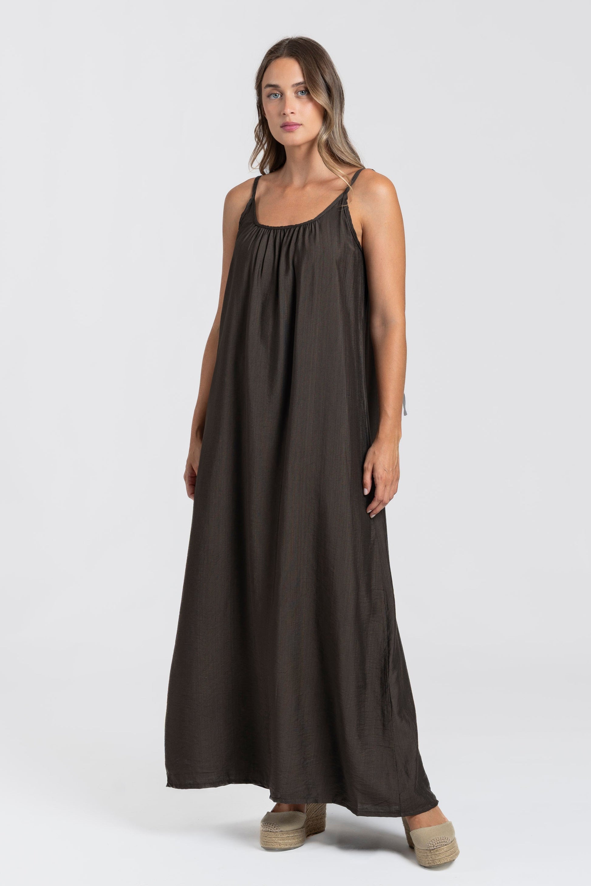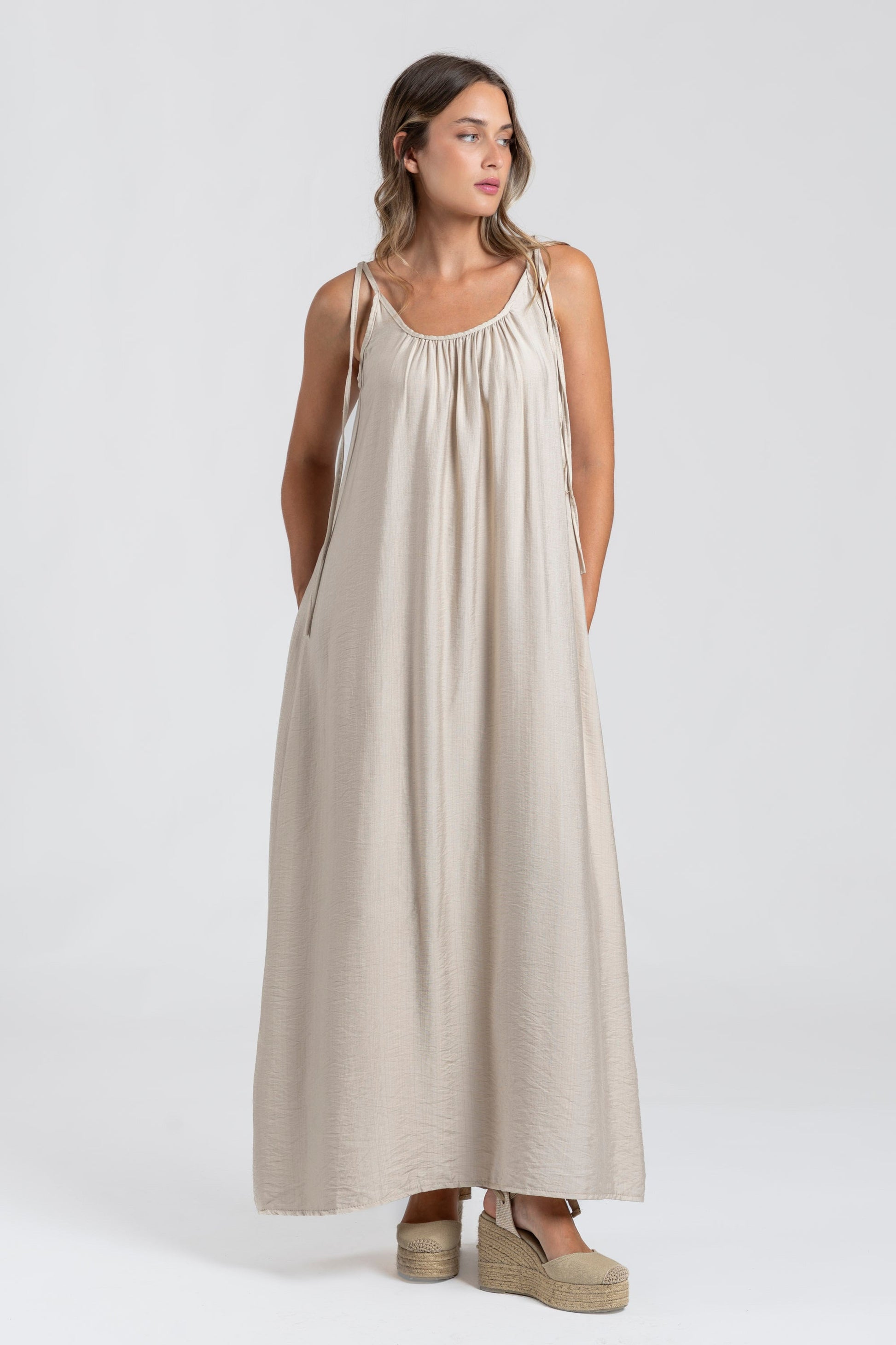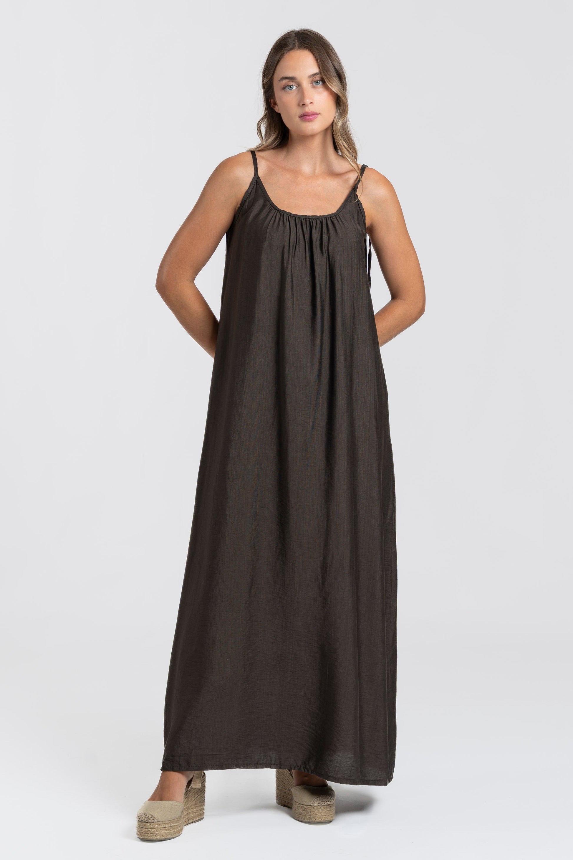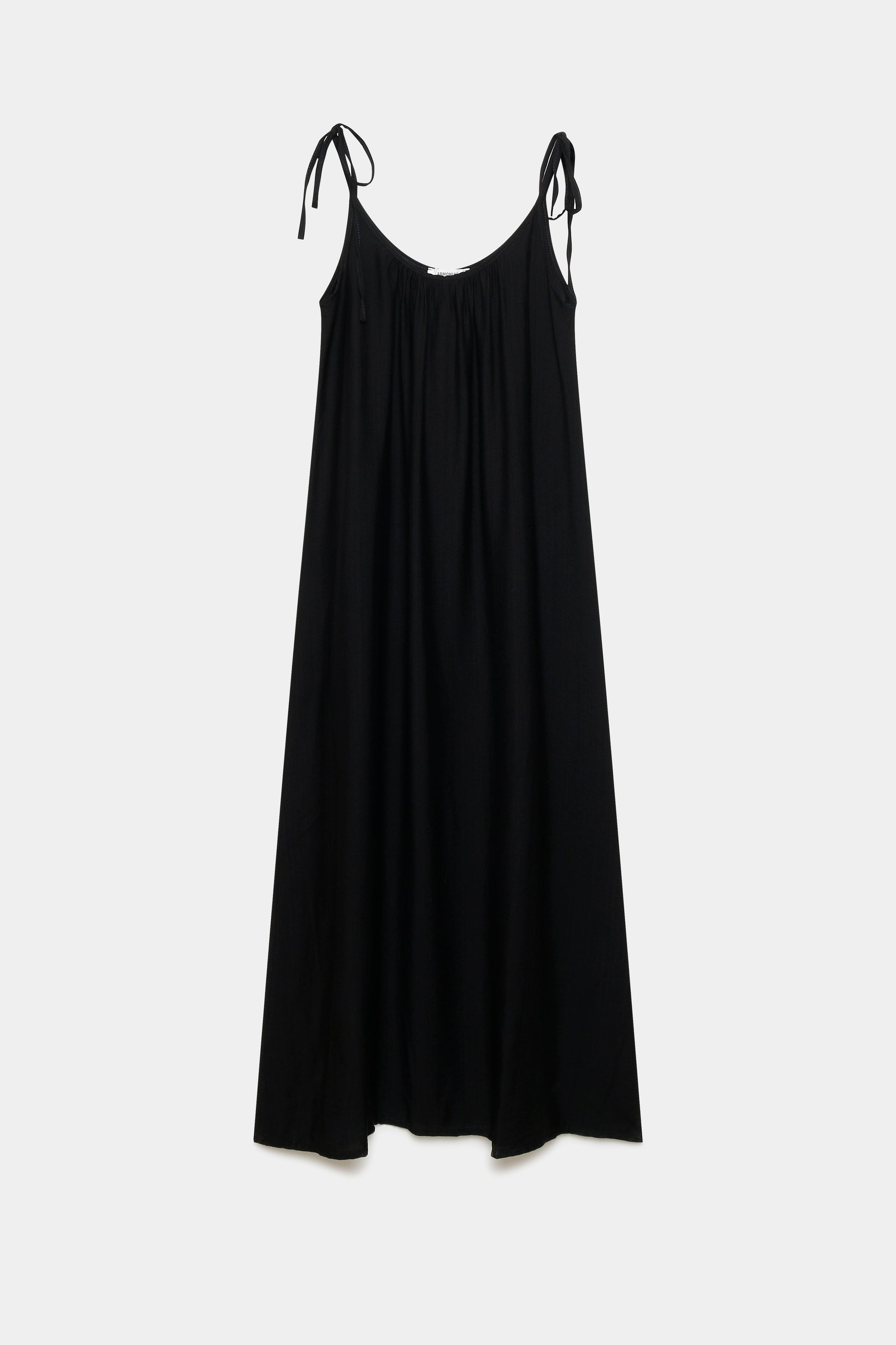 Tejido fluido. Tirantes finos. Cuello redondo. Diseño largo. Talla modelo: S. Altura modelo 1,66 m.