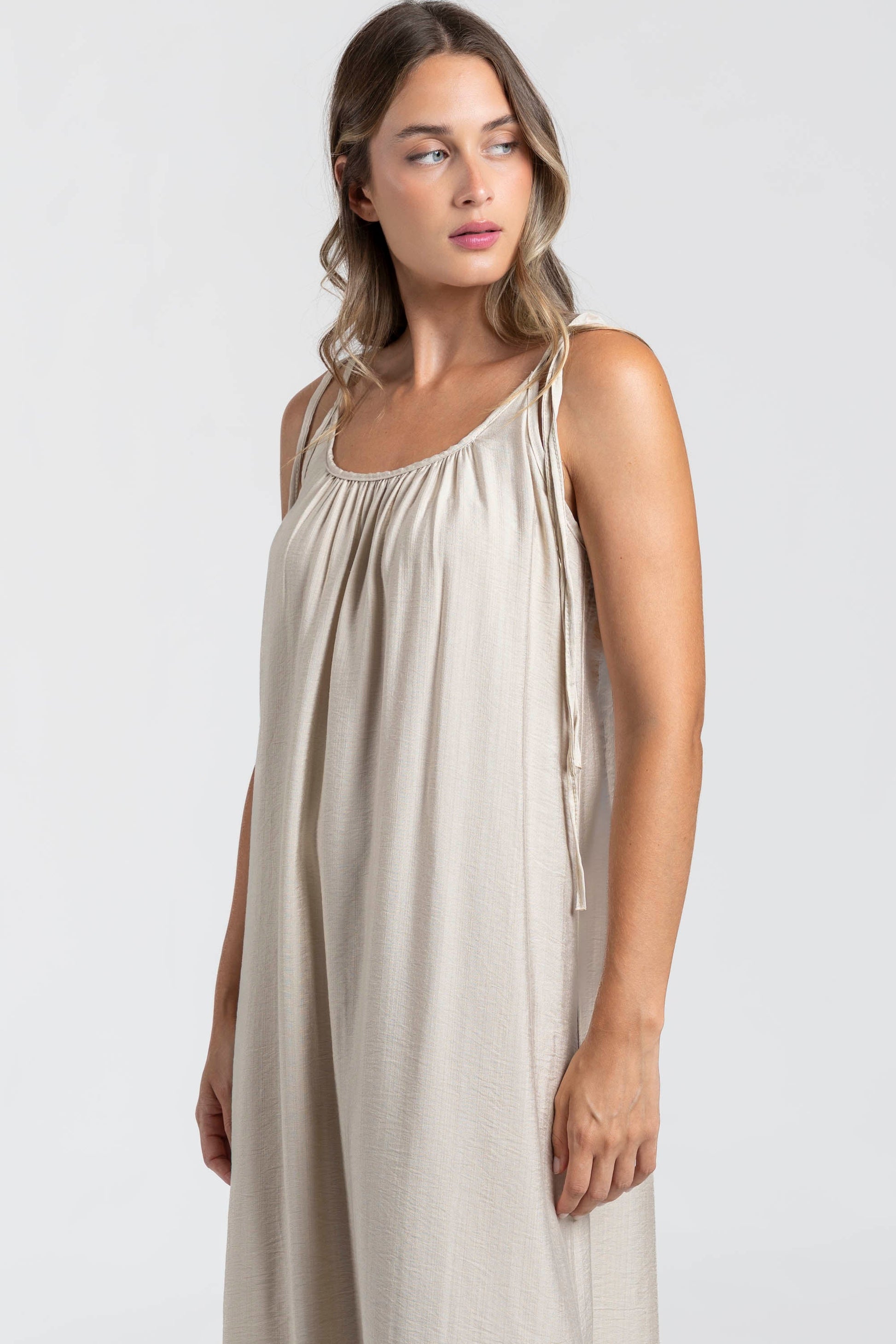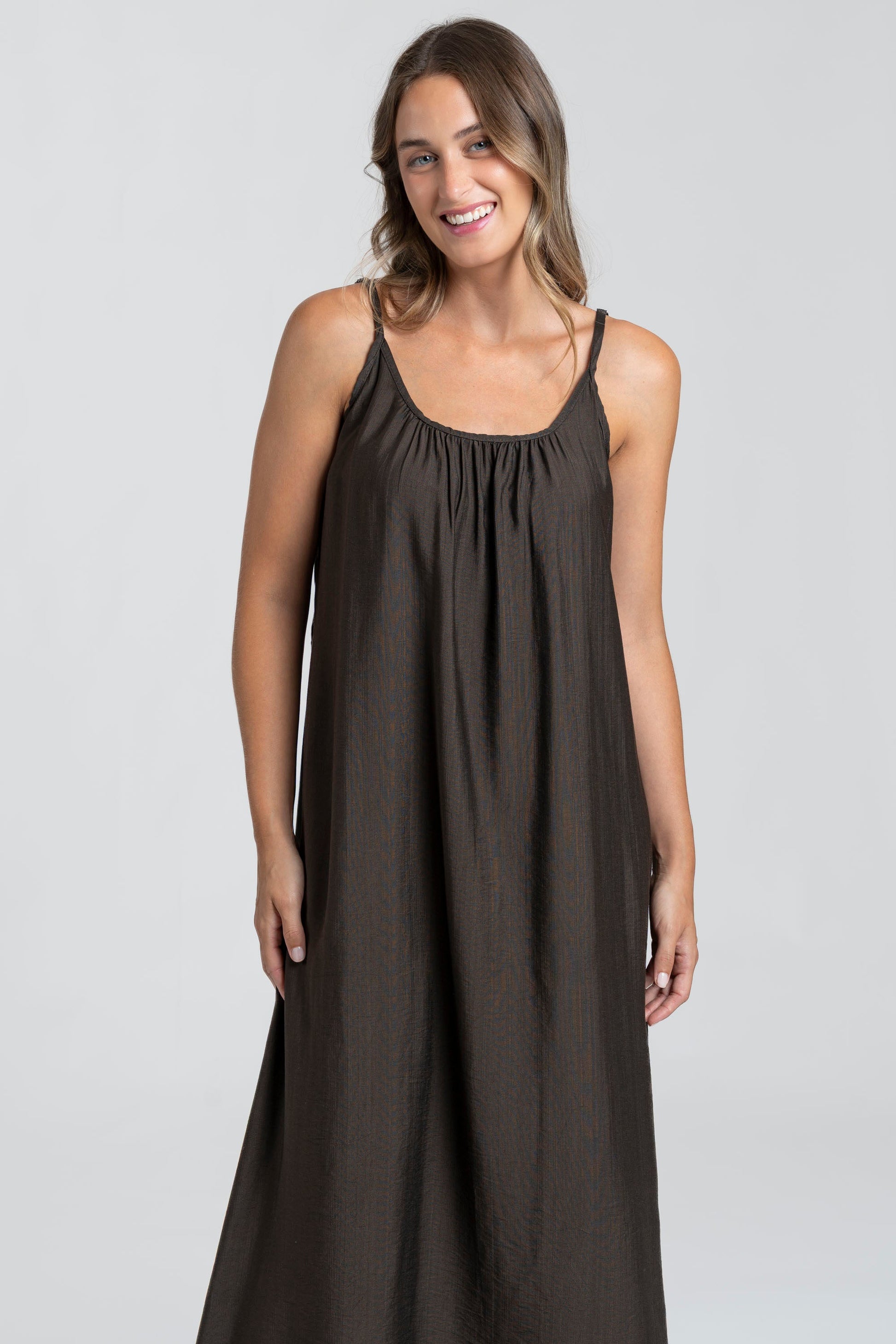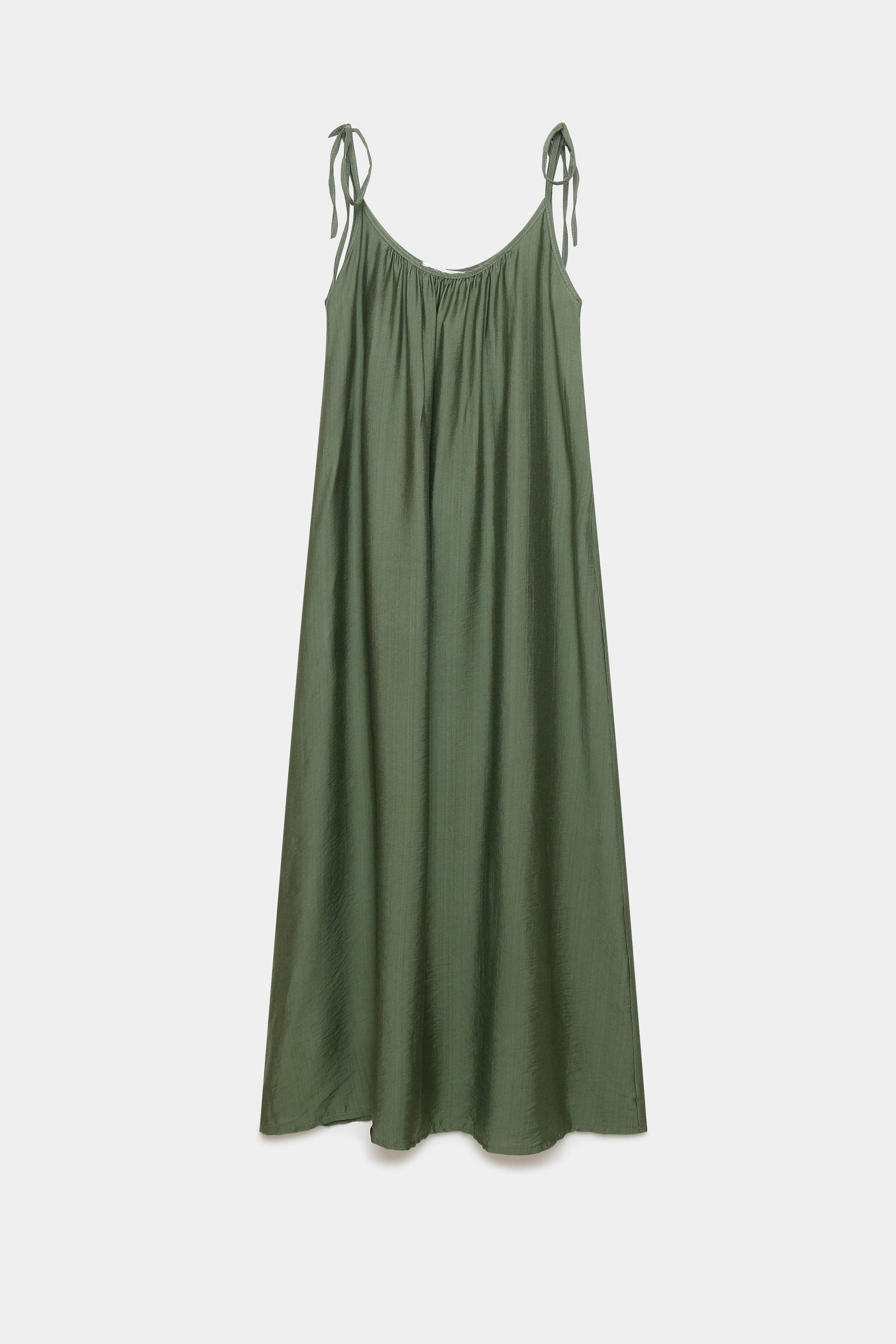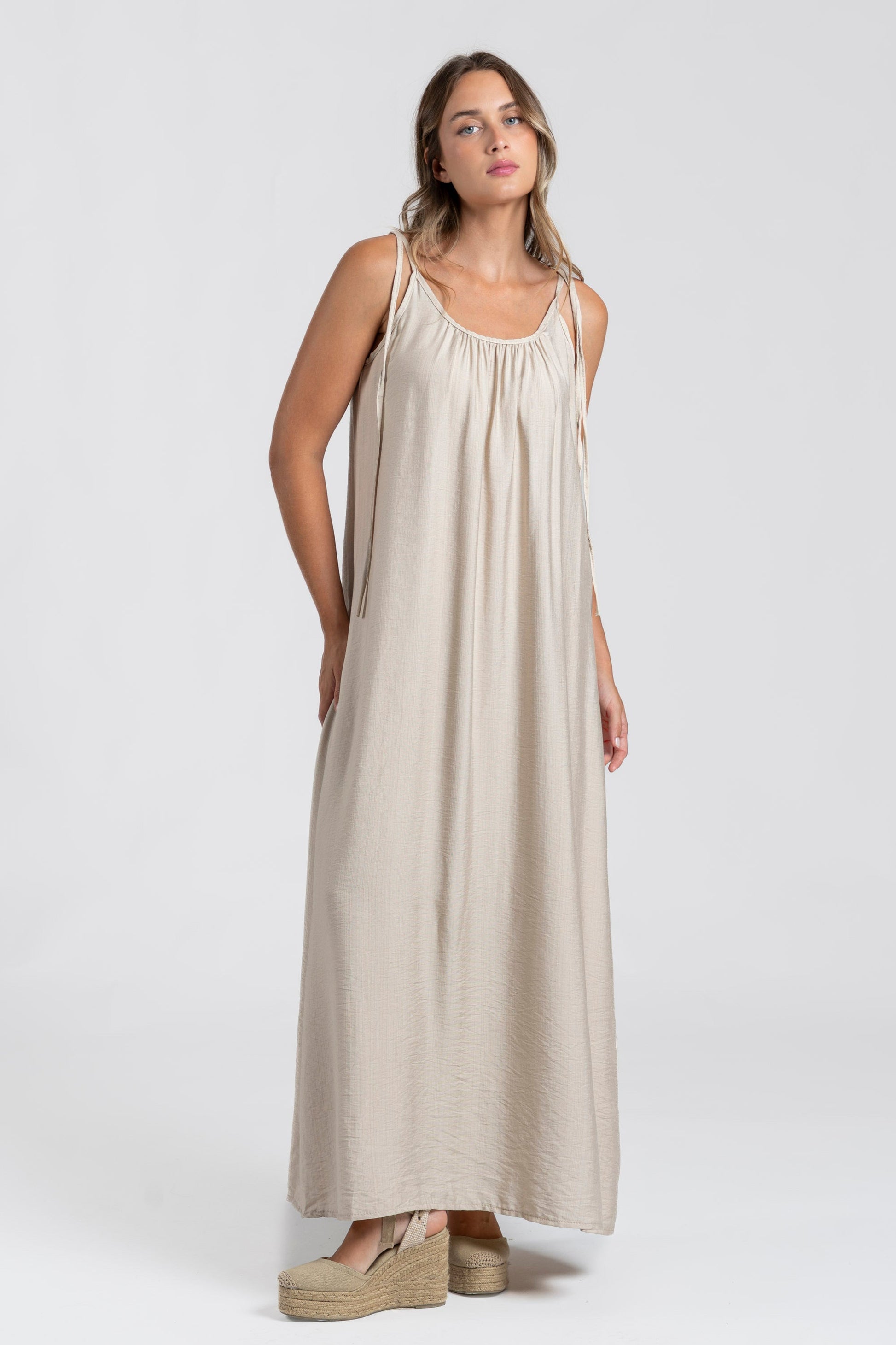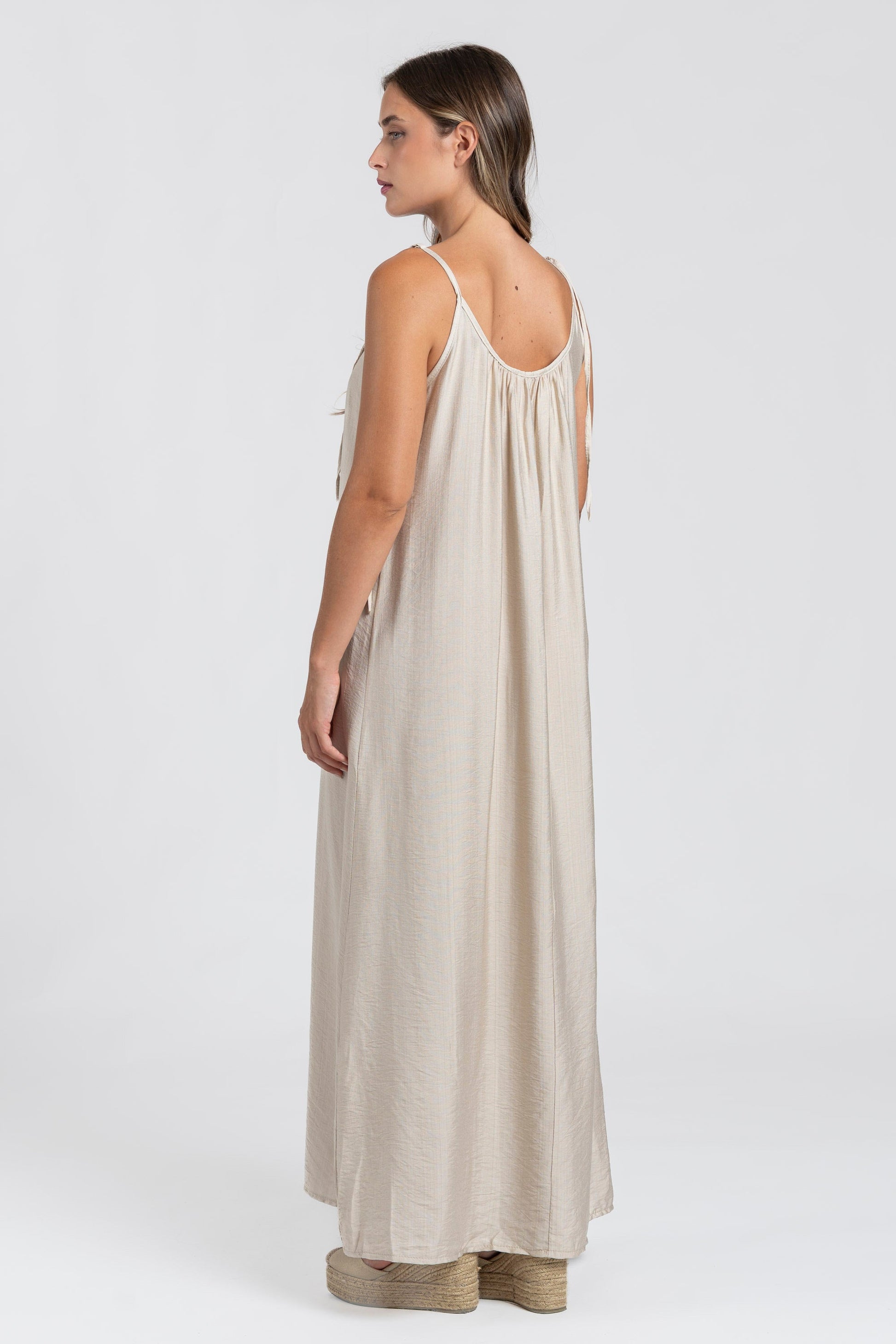 Tejido fluido. Tirantes finos. Cuello redondo. Diseño largo. Talla modelo: S. Altura modelo 1,66 m.