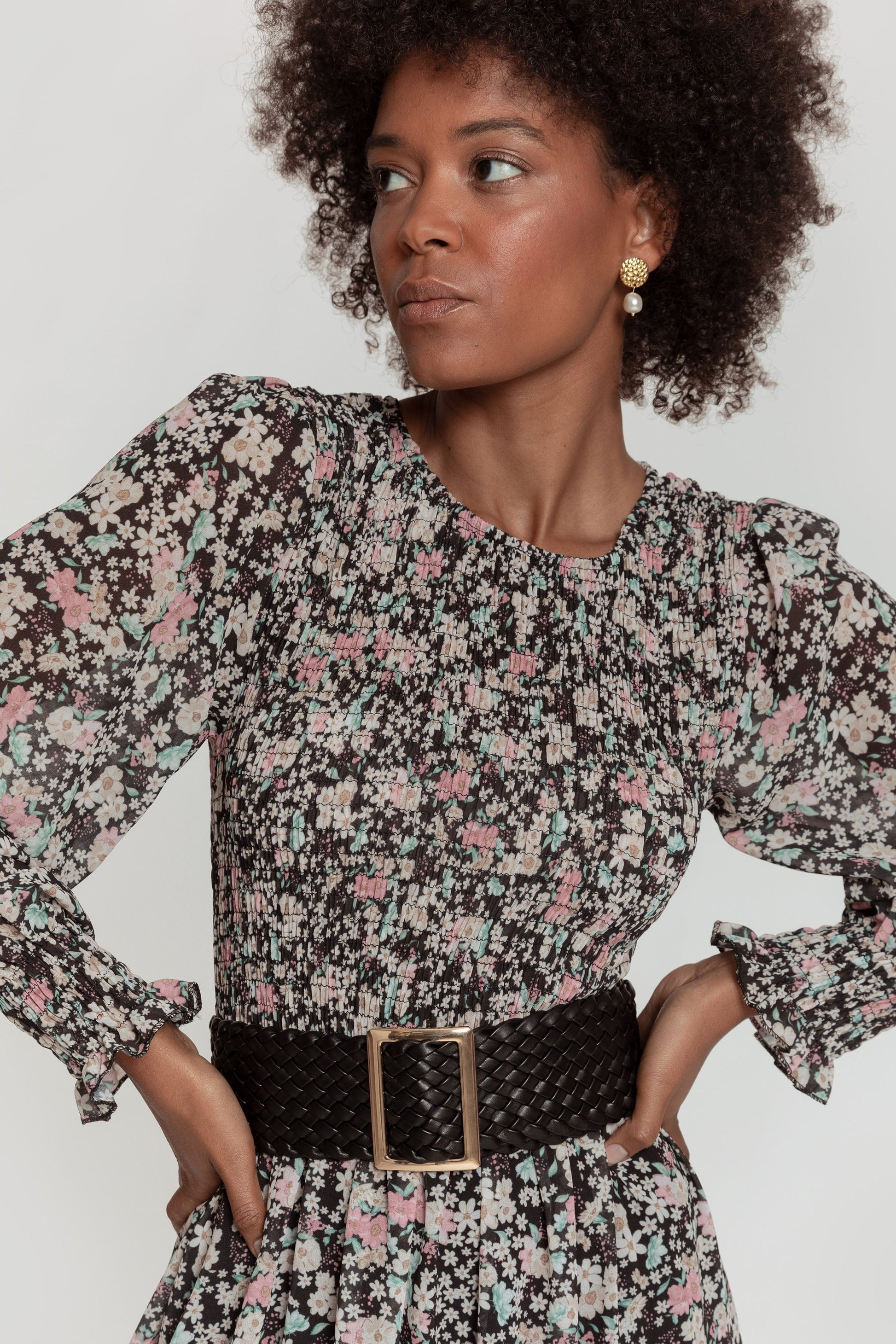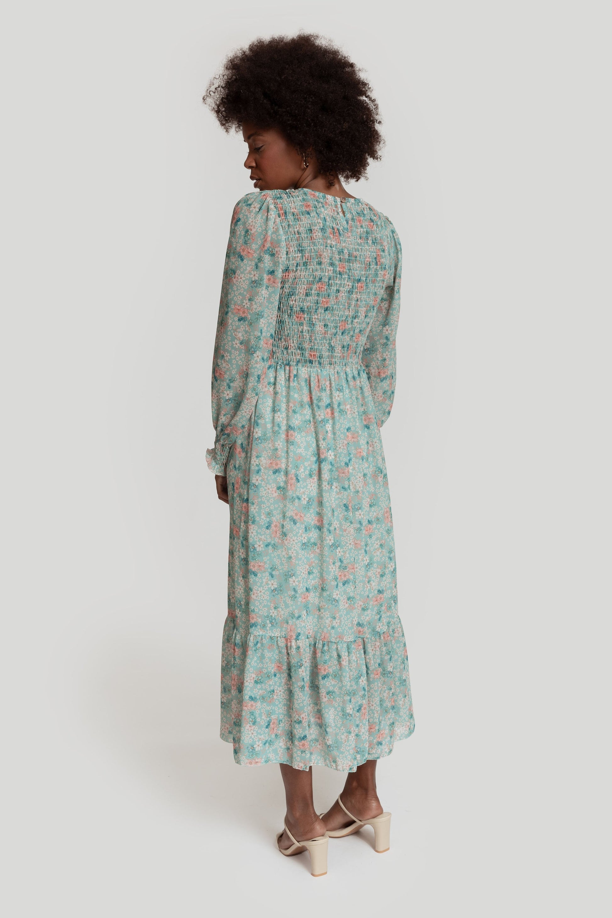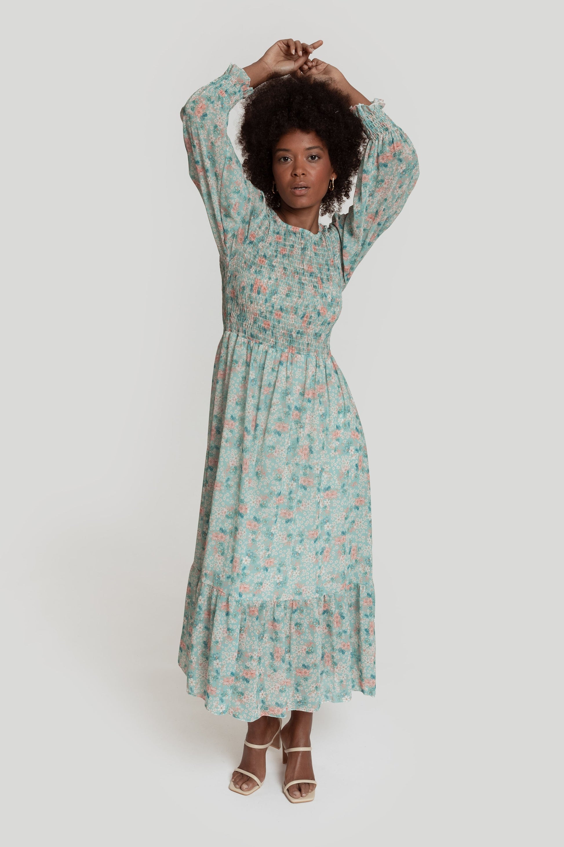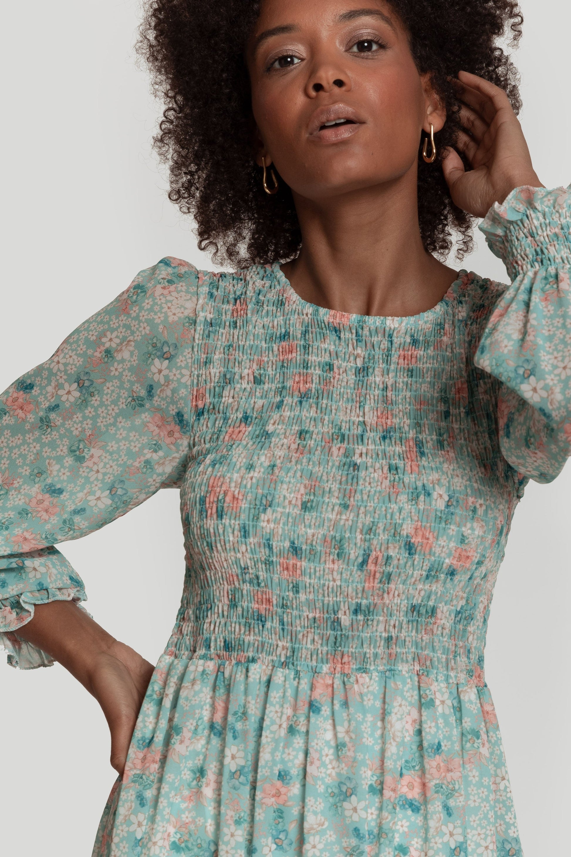 Tejido gasa. Diseño largo. Diseño evasé. Diseño estampado. Cuello redondo. Manga larga. Puño elástico. Panel elástico. Forrado. Talla modelo: S. Altura modelo 1,65 m.