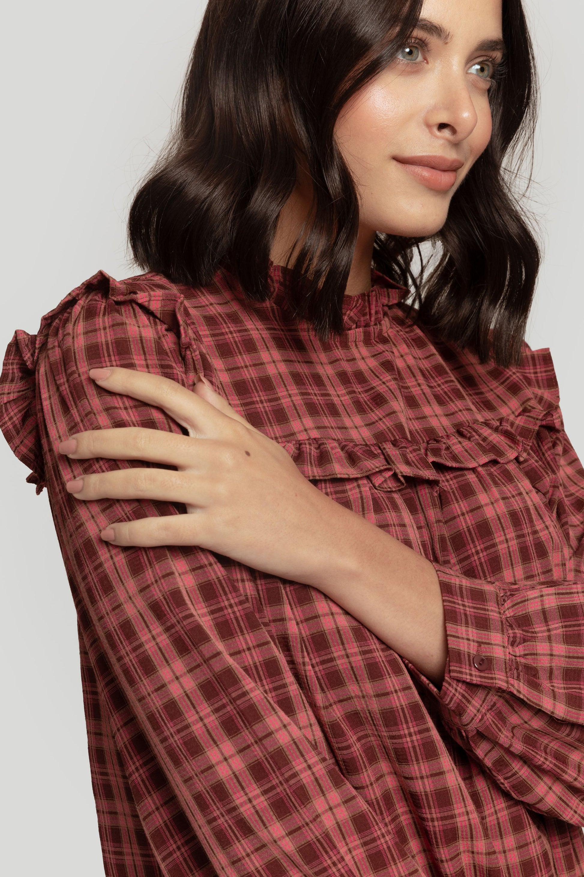 Tejido fuido. Diseño estampado. Diseño recto. Diseño corto. Cuello redondo. Manga larga. Puño abotonado. Abotonado en la nuca. Detalle volante. Talla modelo: S. Altura modelo: 1.76 m.