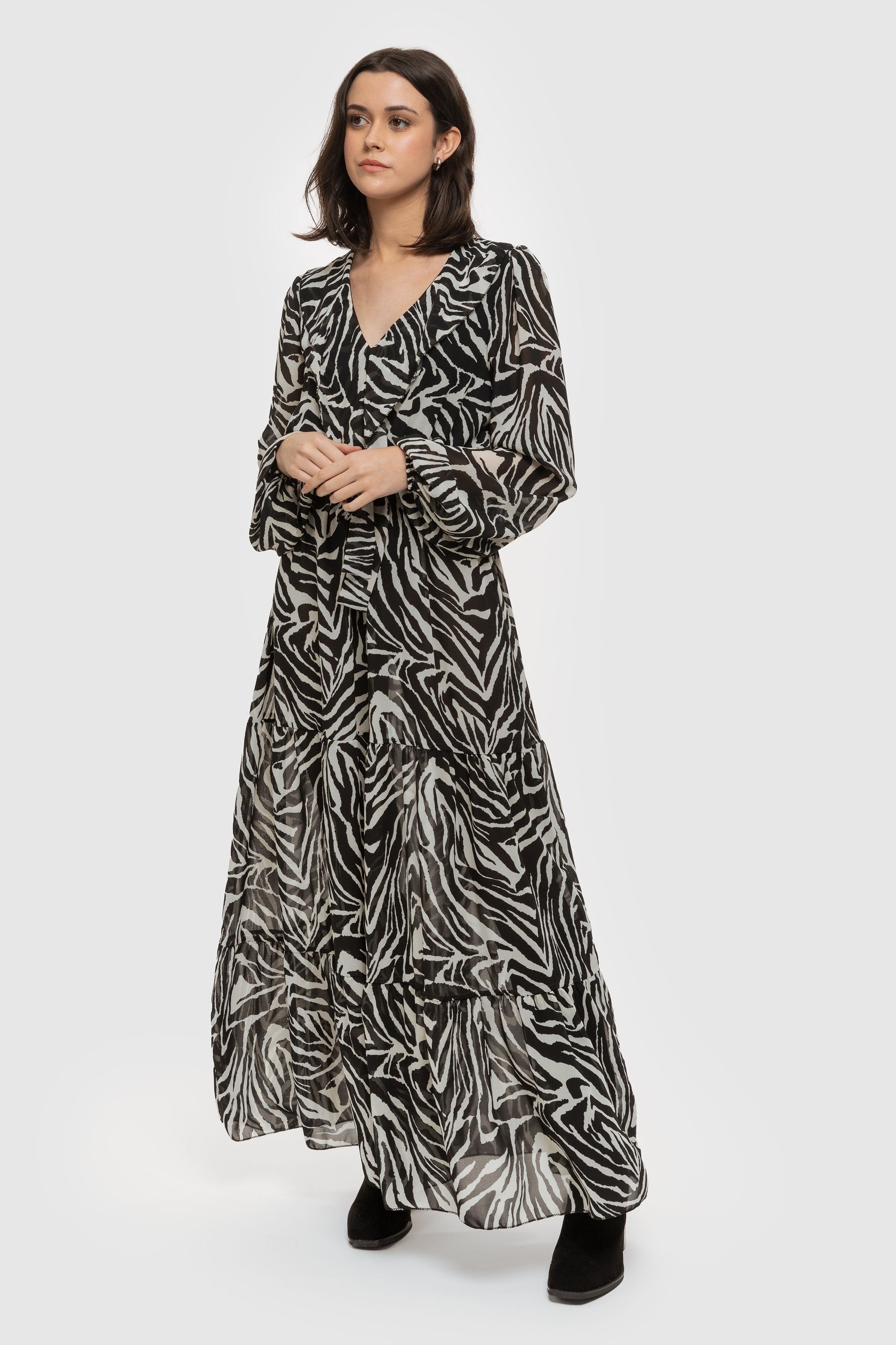 Vestido largo. Tejido estampado. Diseño largo. Escote de pico. Manga larga. Forro interior. Cinturón a contraste. Detalle volantes. Talla modelo: S Altura modelo 1,67 m.