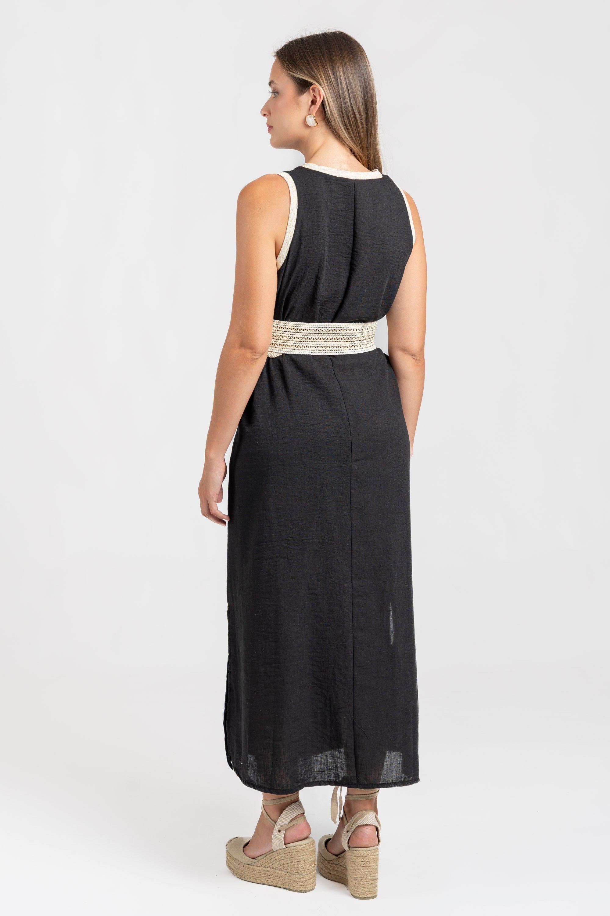 Tejido fluido. Cuello redondo. Manga sisa. Aberturas laterales.