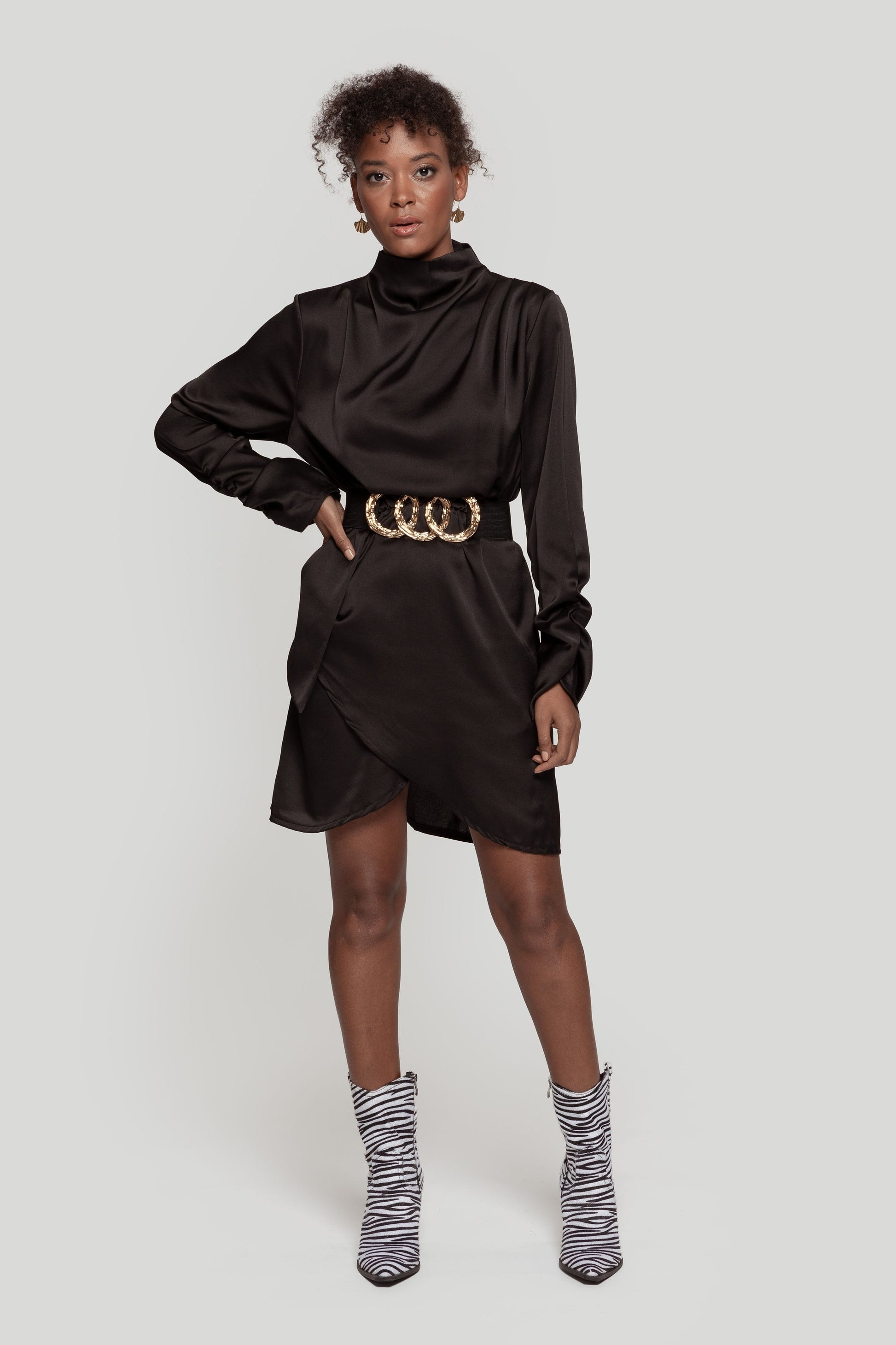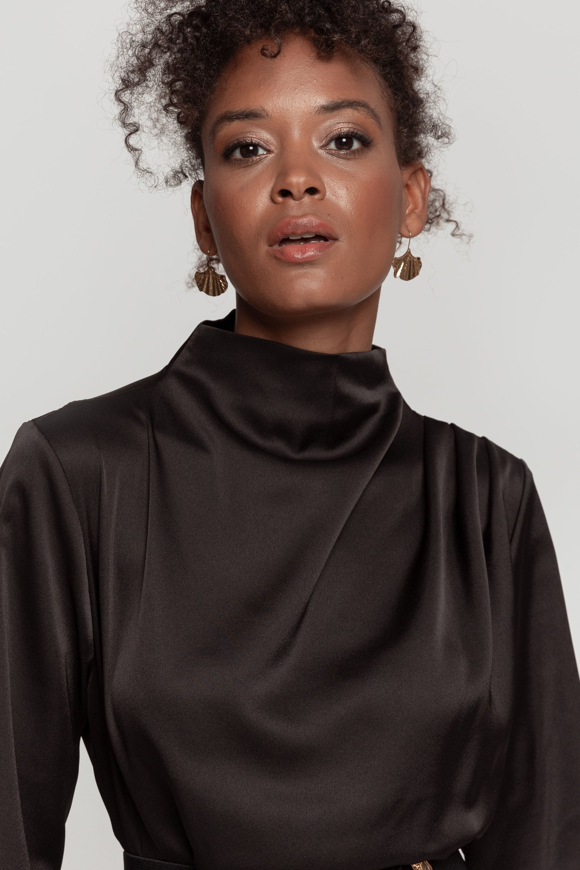 Tejido satinado. Diseño cruzado. Diseño fluido. Diseño corto. Cuello alto. Manga larga. Abotonado en el cuello. Costuras visibles. Talla modelo: S. Altura modelo 1,65 m.