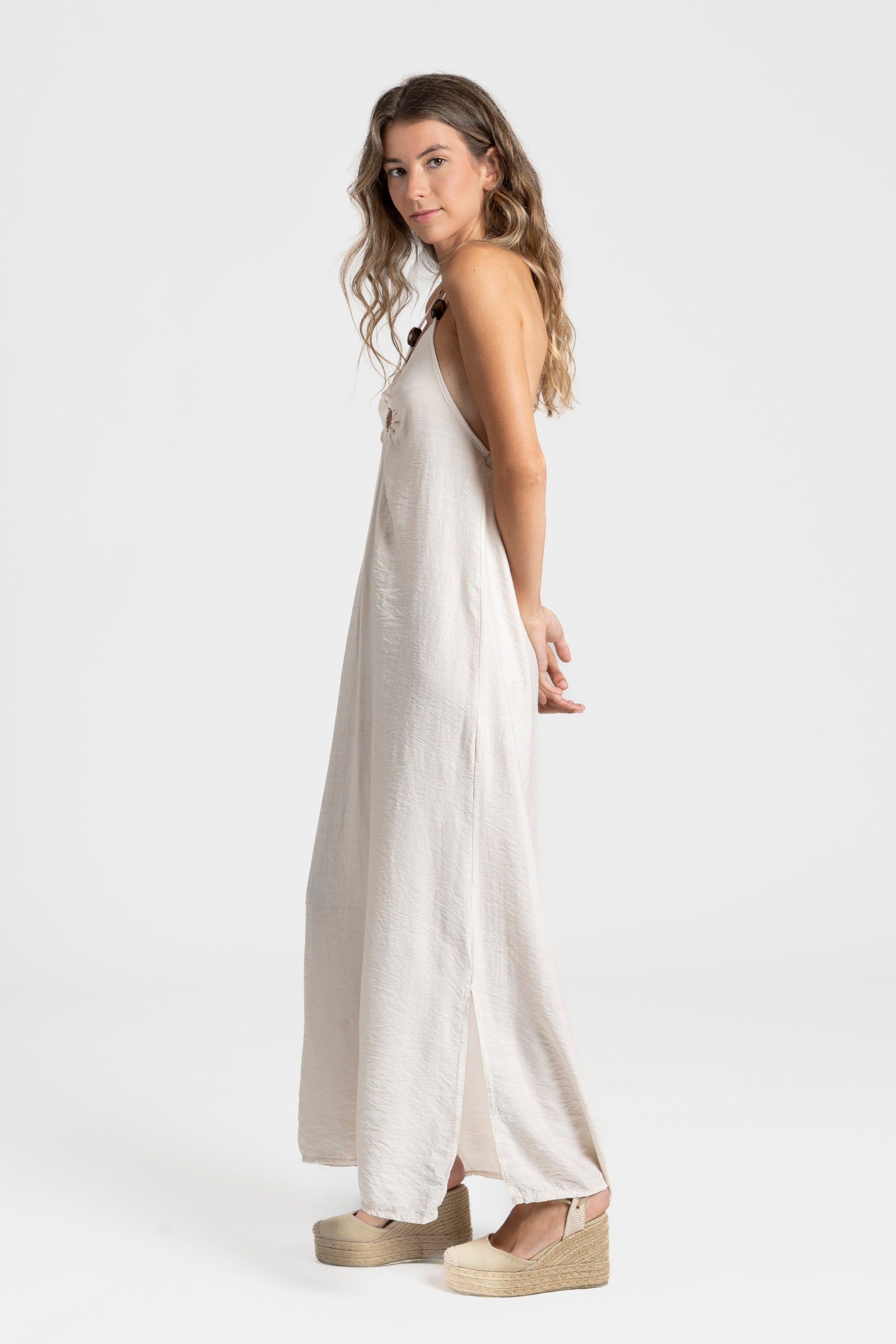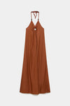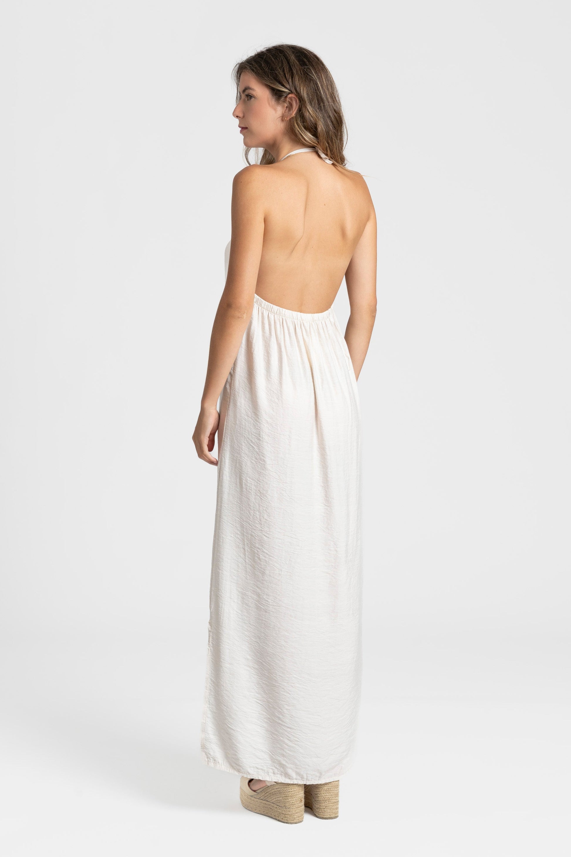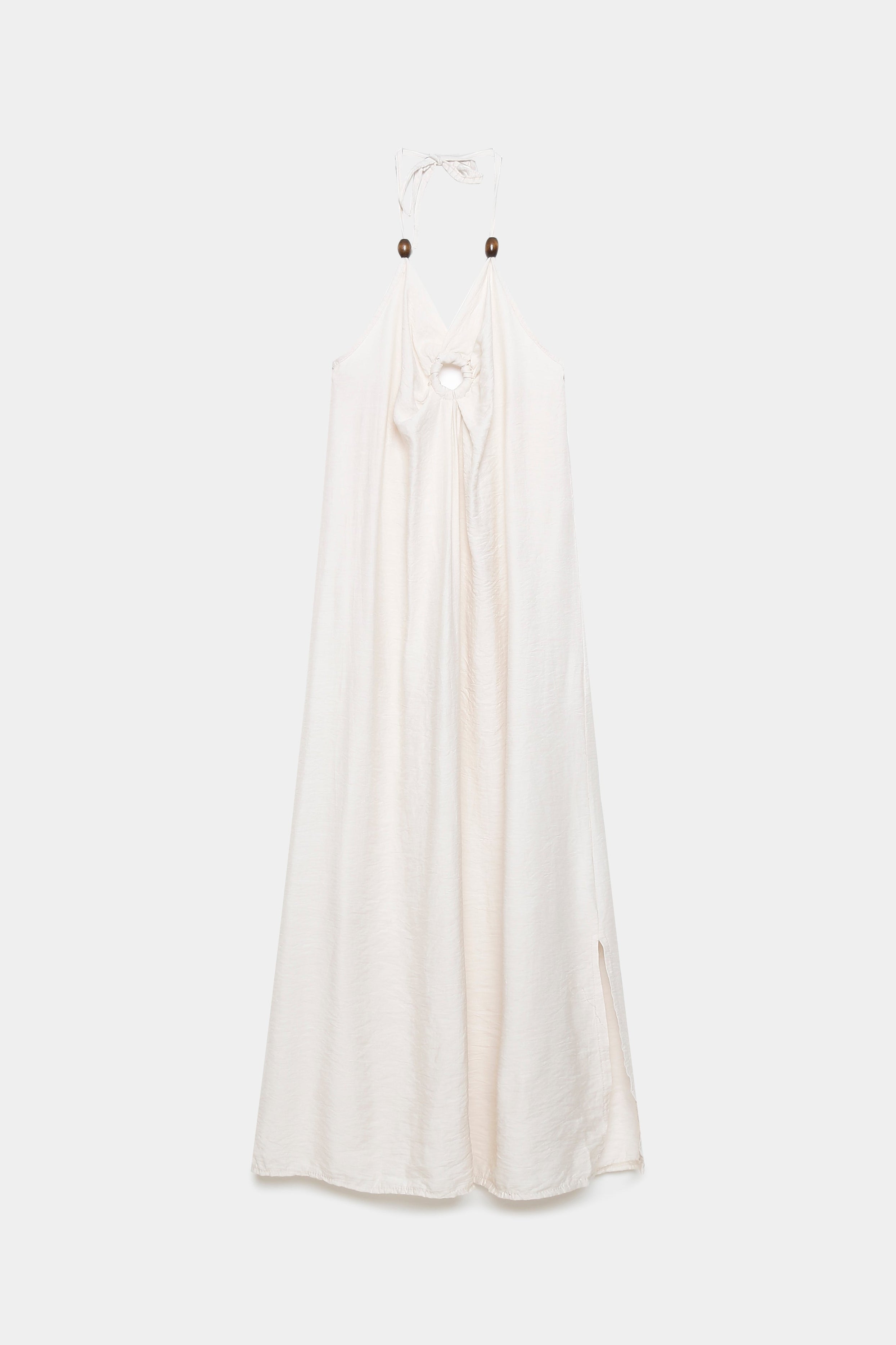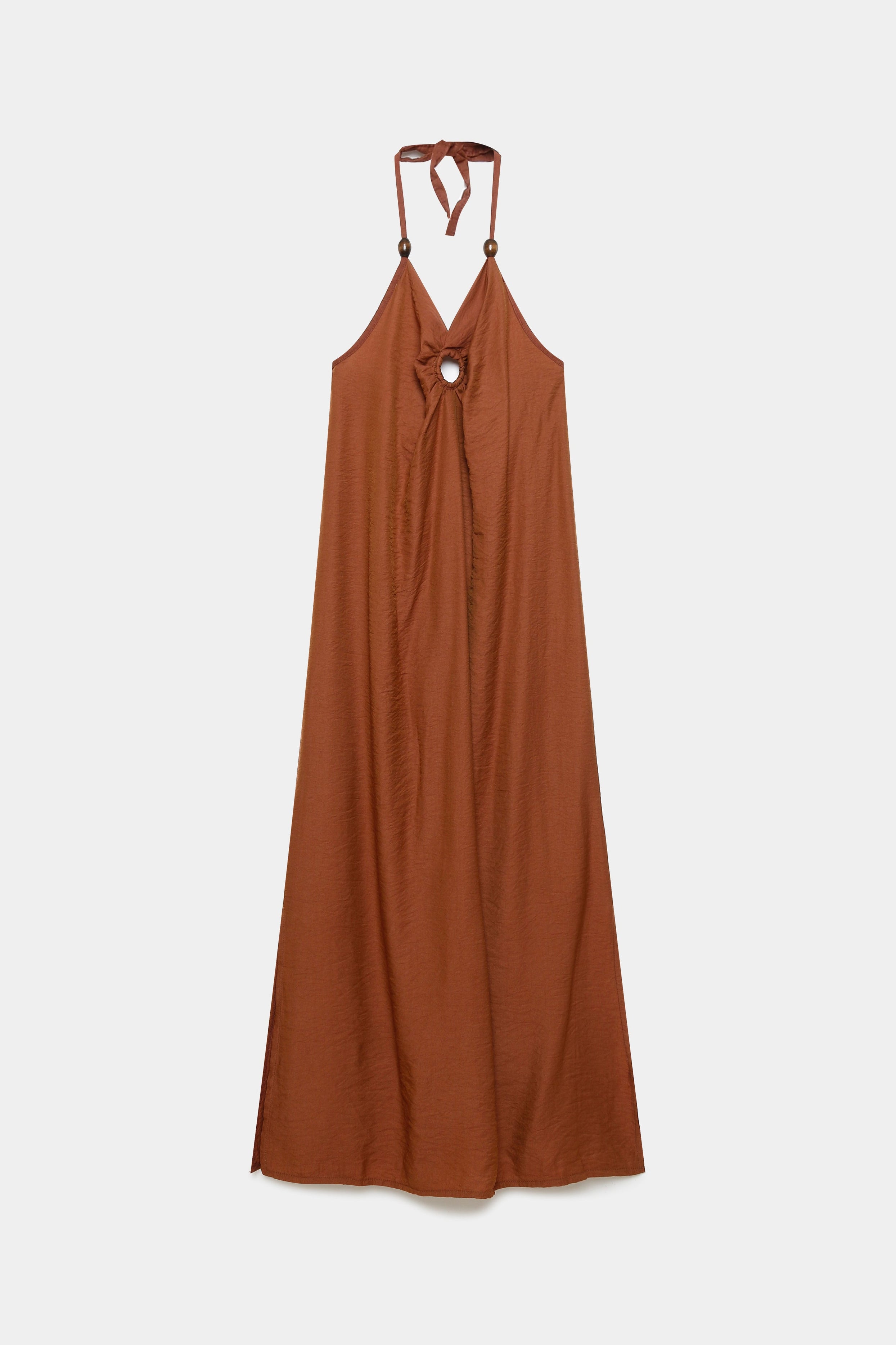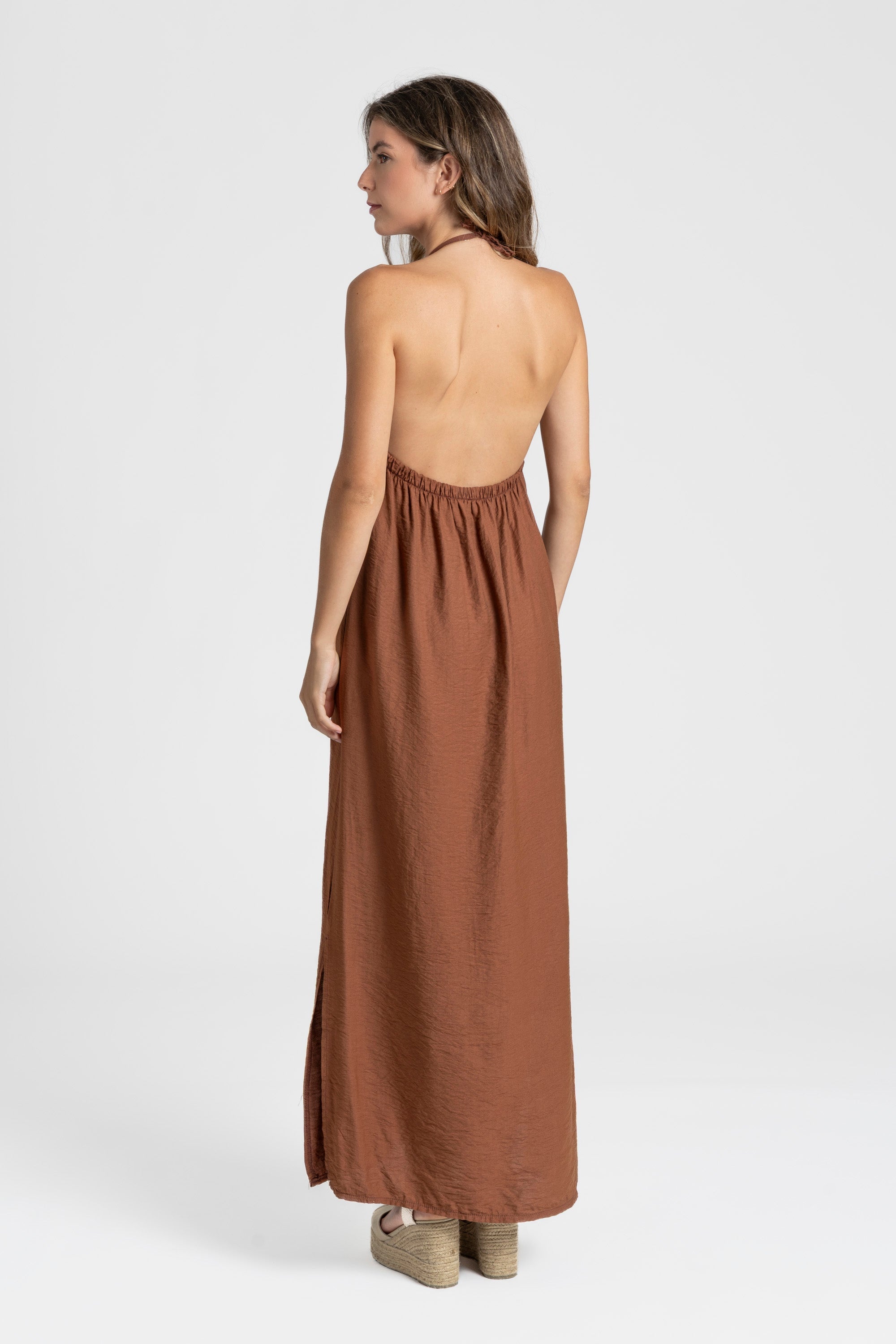 Tejido fluido. Cuello halter. Escote pico. Aberturas laterales.