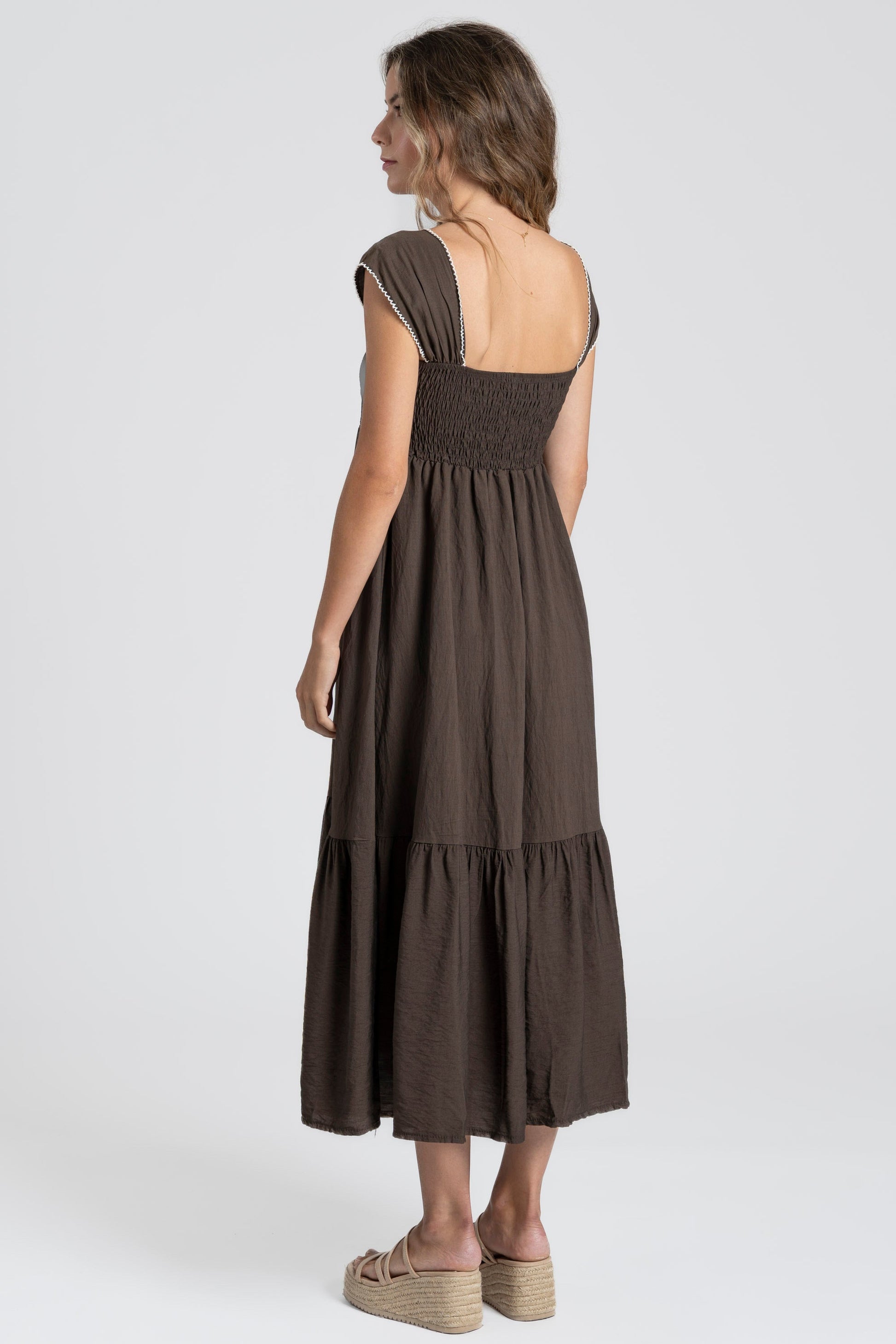 Tejido fluido. Tirantes anchos. Escote recto. Diseño midi.