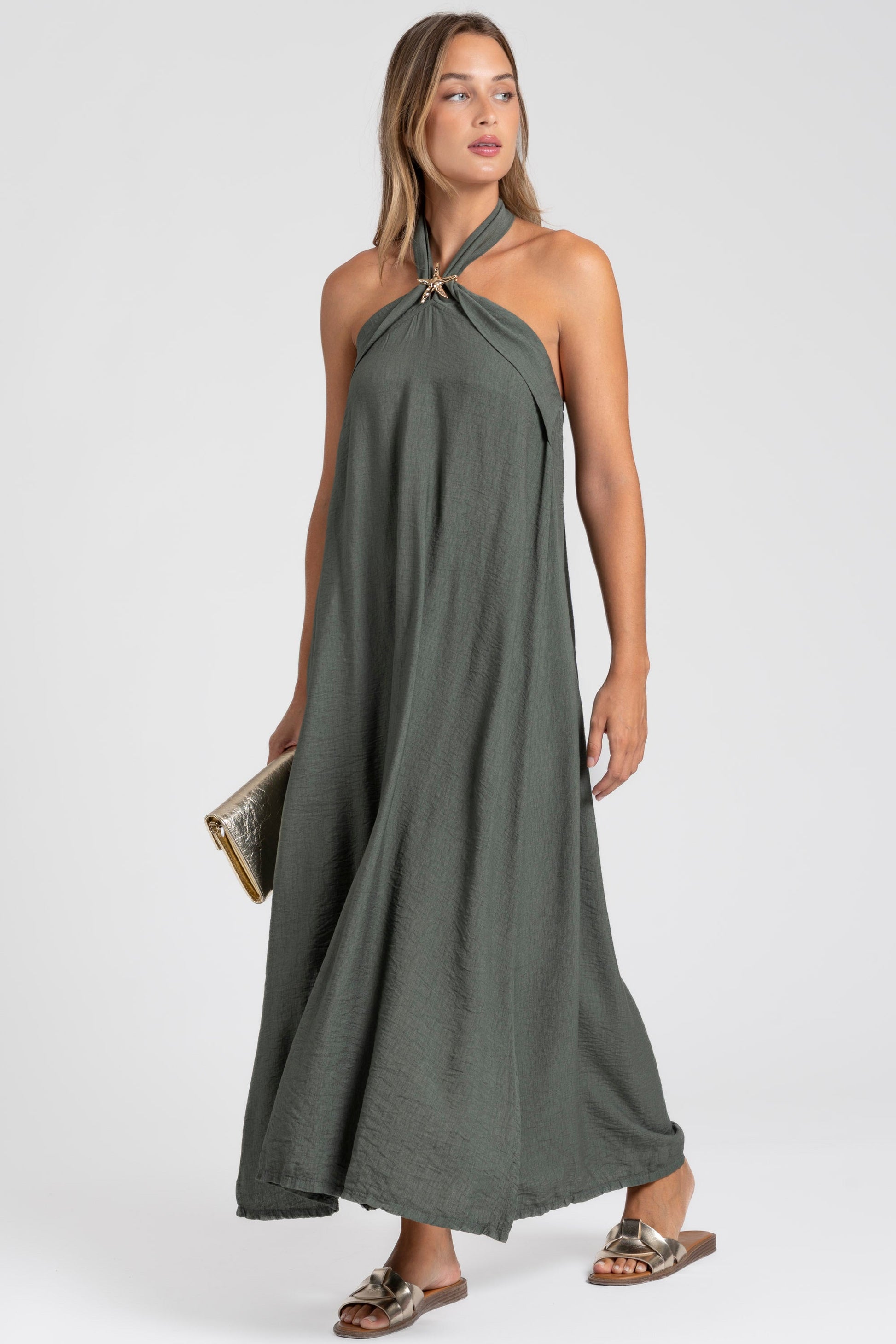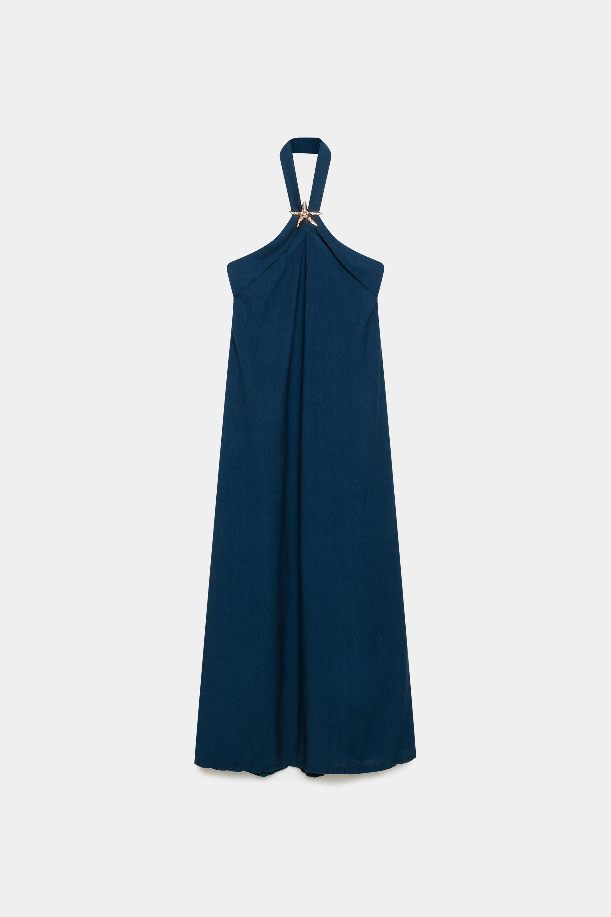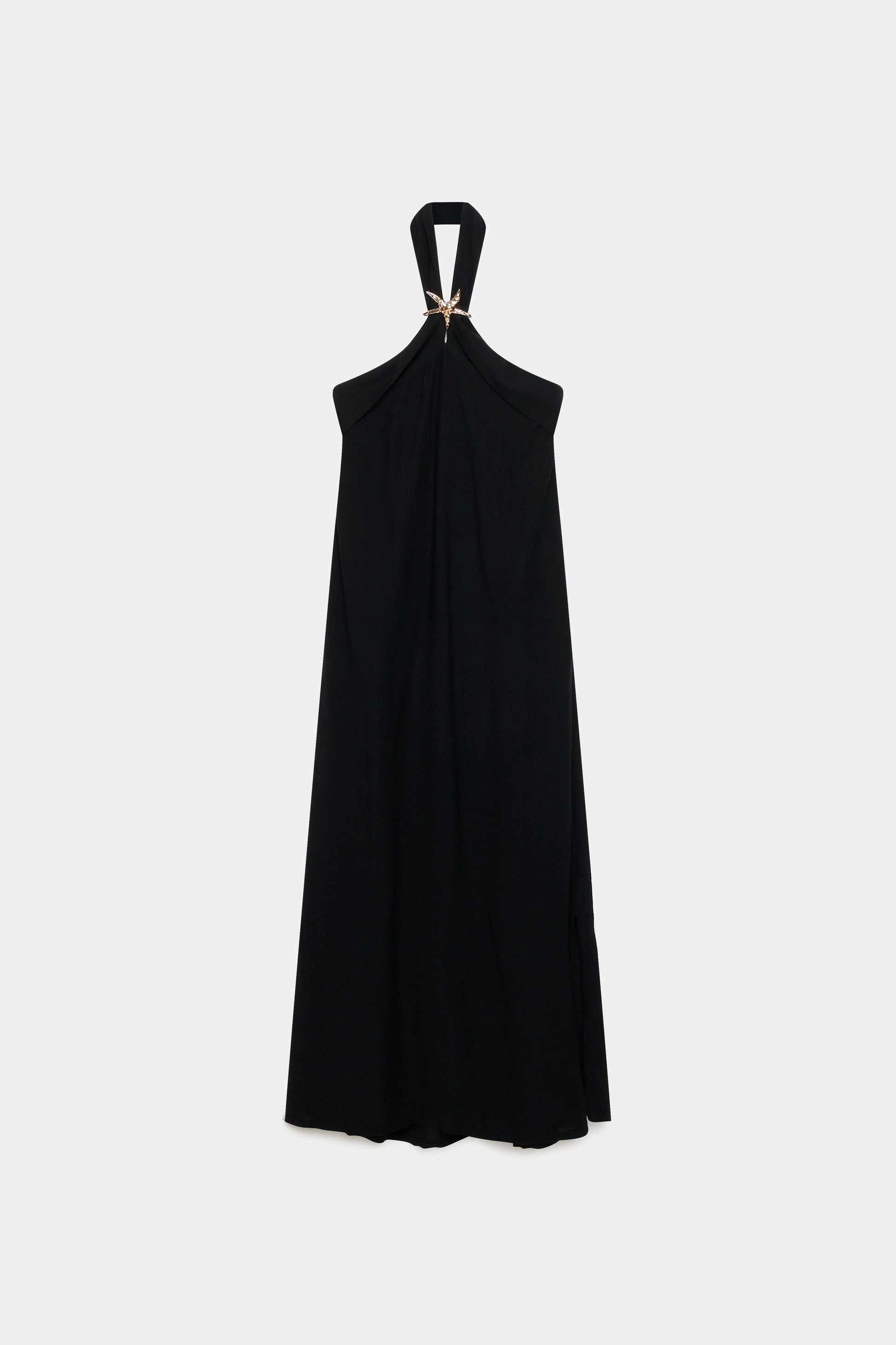 Tejido fluido. Cuello halter. Detalle estrella. Aberturas laterales.