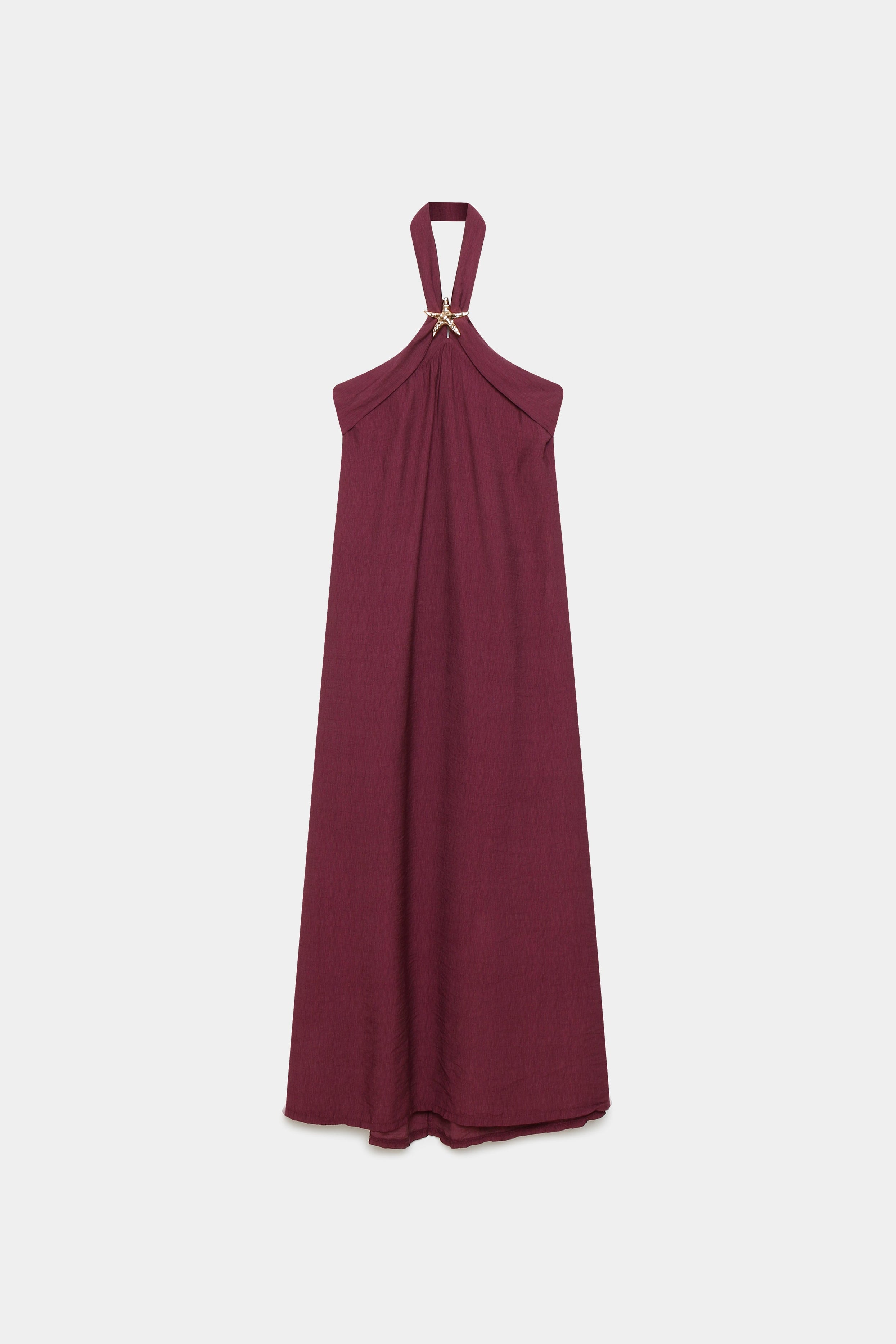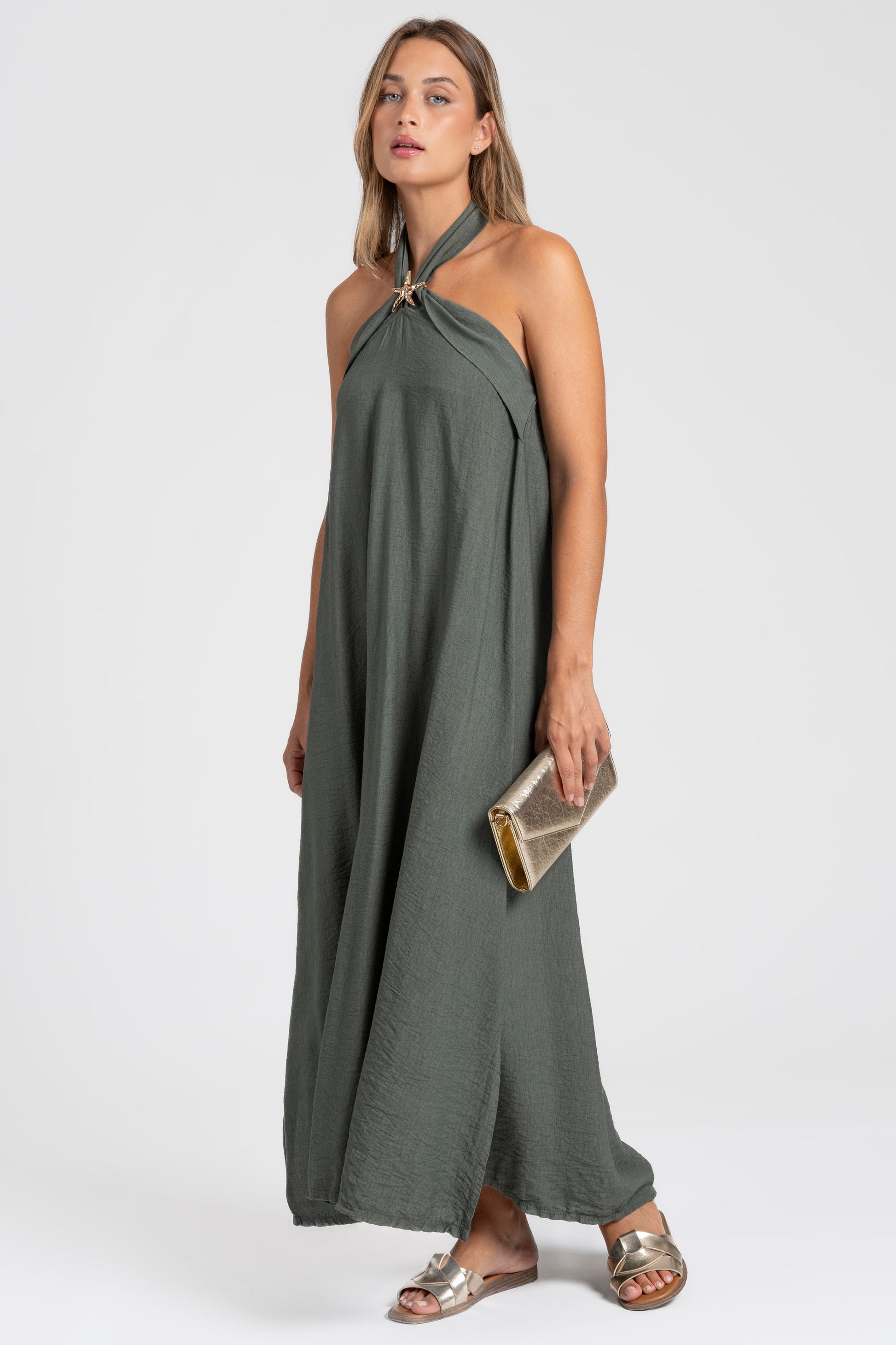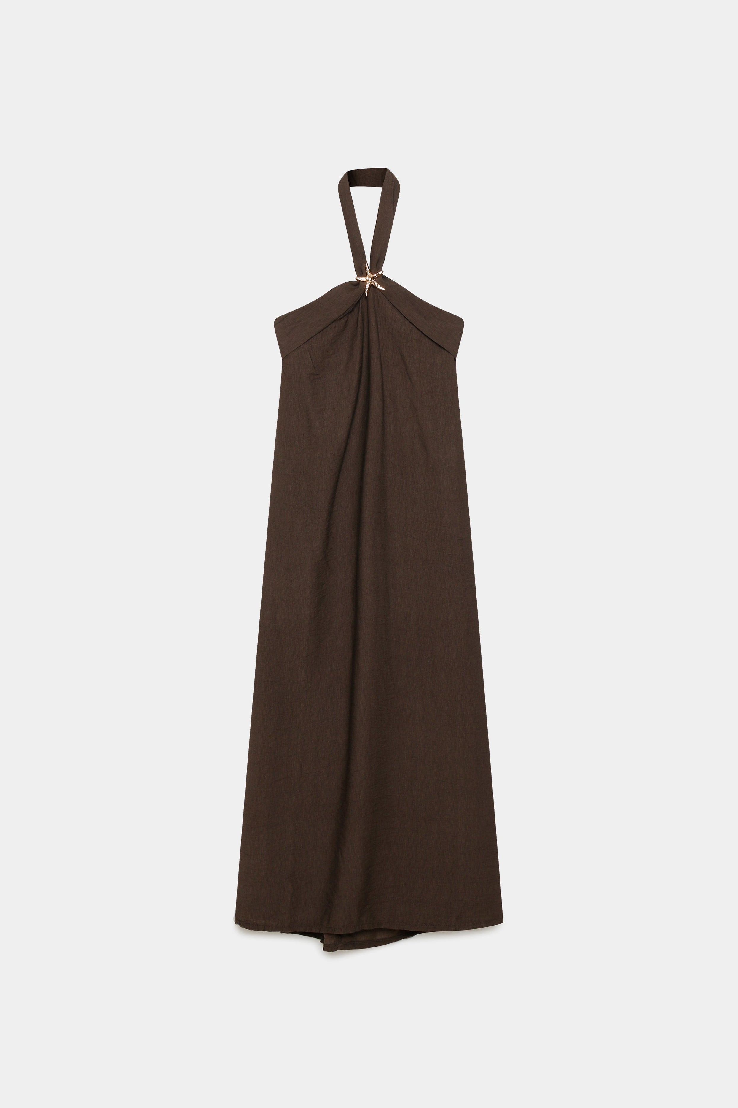 Tejido fluido. Cuello halter. Detalle estrella. Aberturas laterales.